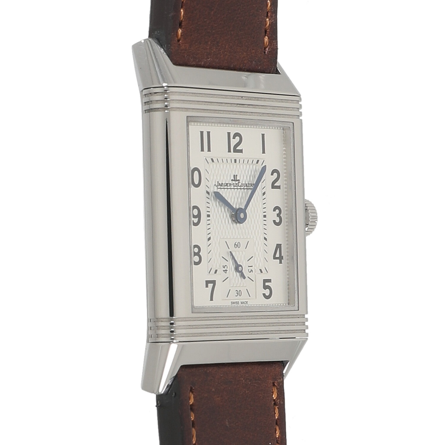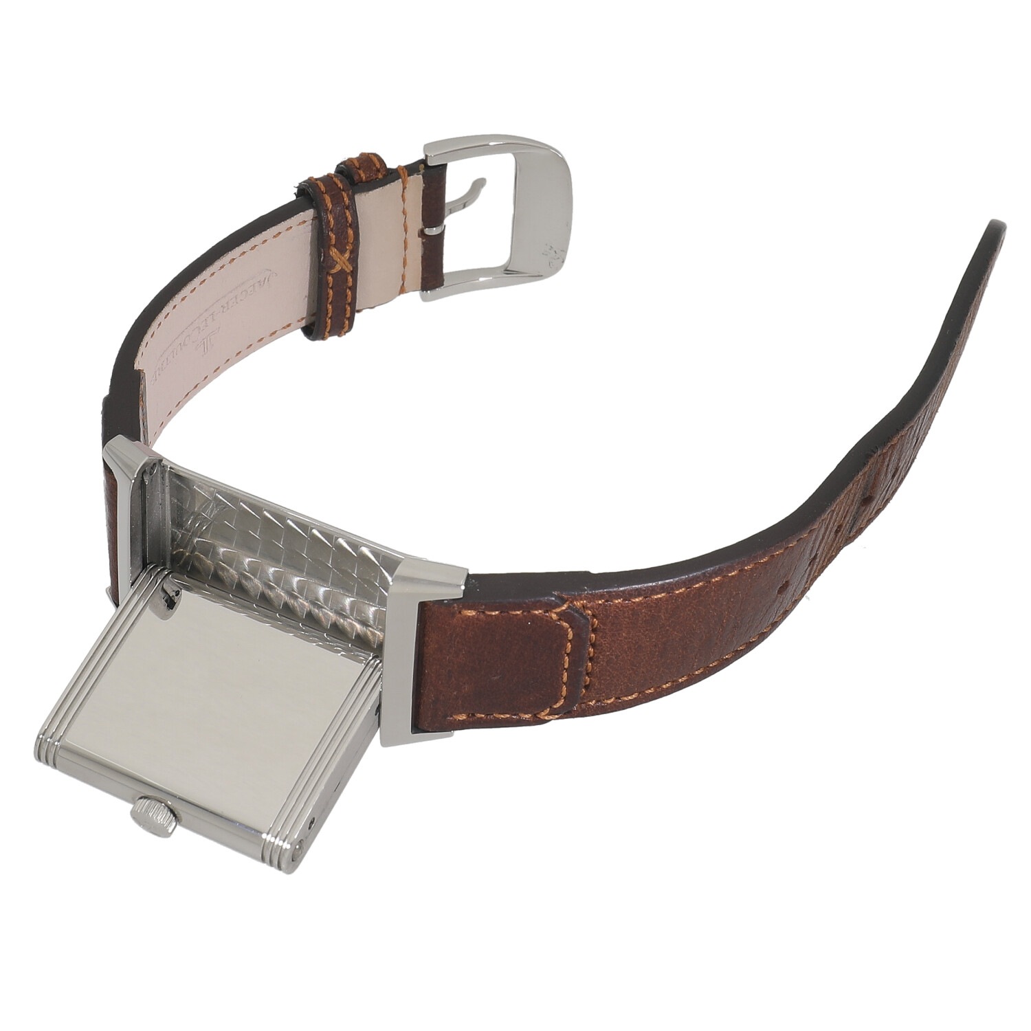 | モデルについて / Features | マスターシリーズと並びジャガールクルトを代表するコレクションであるレベルソ。インド駐在の英国人将校から『ポロの試合中でも着けられる時計を』という要望を受け、ケースを表裏と反転させる事で文字盤を守る事が出来るように設計・デザインしたのがレベルソの特徴です。チョコレートブラウンのカーフストラップは、アルゼンチンの名高いブーツメーカーであるファリアーノによってデザインされています。ミディアムサイズは男女で兼用できるユニセックスなサイズ感です。 |