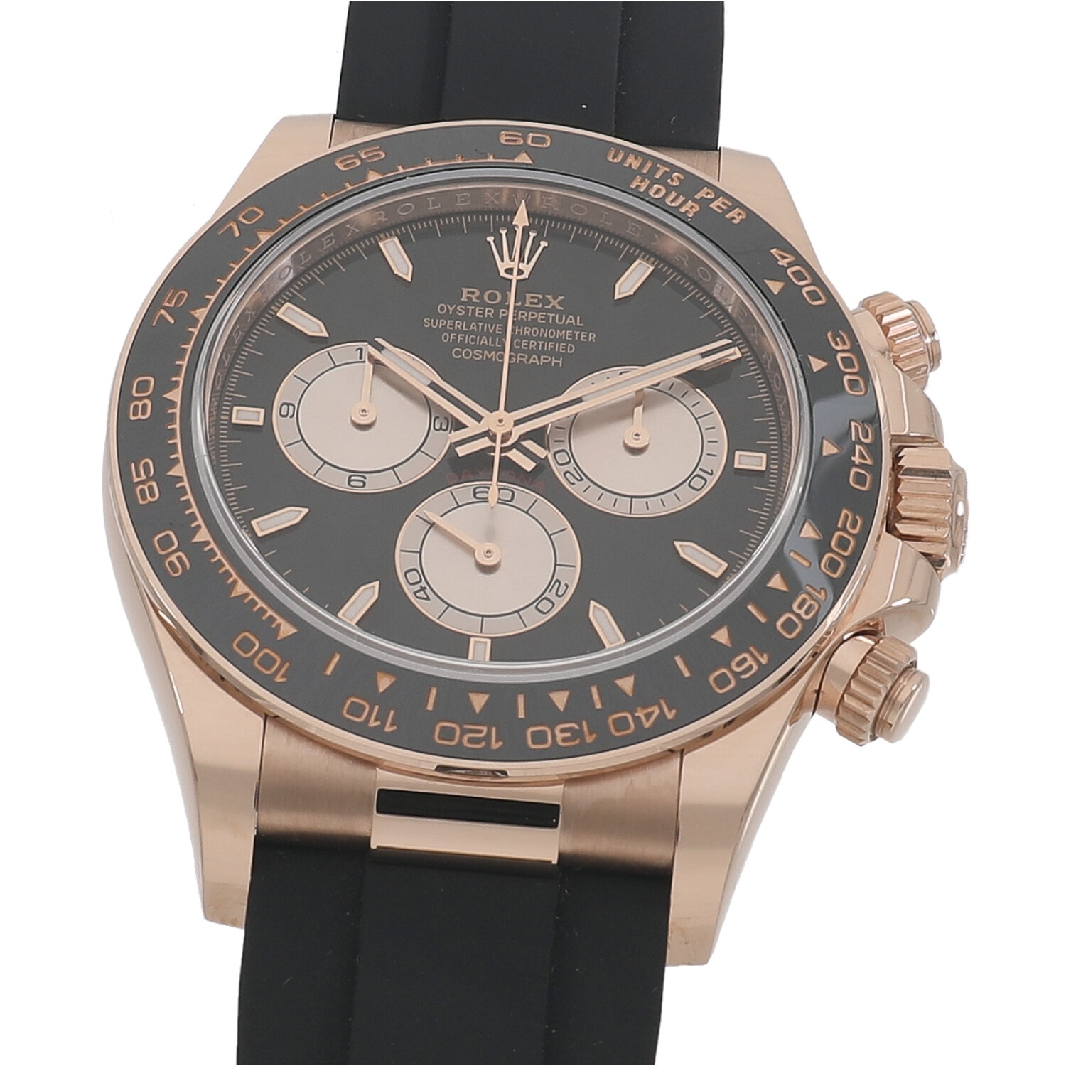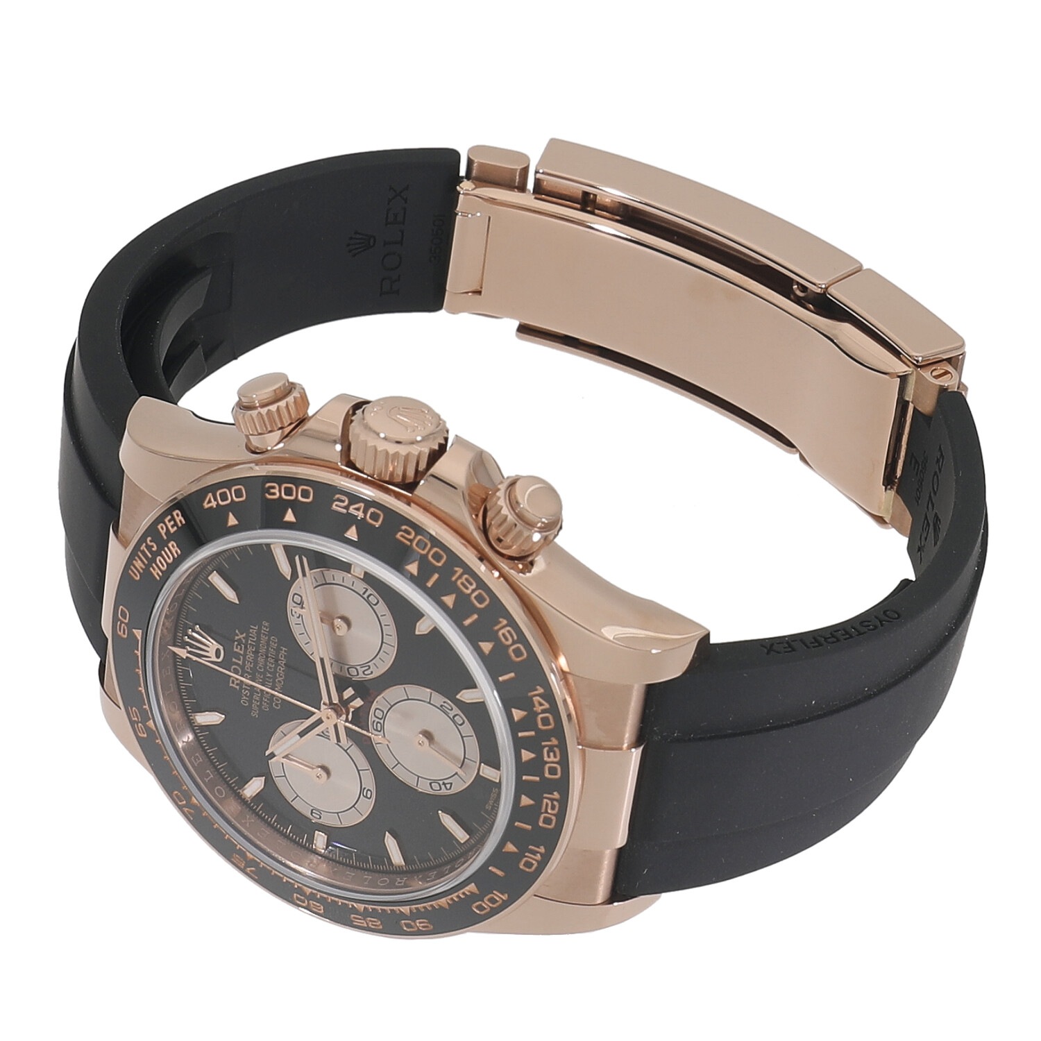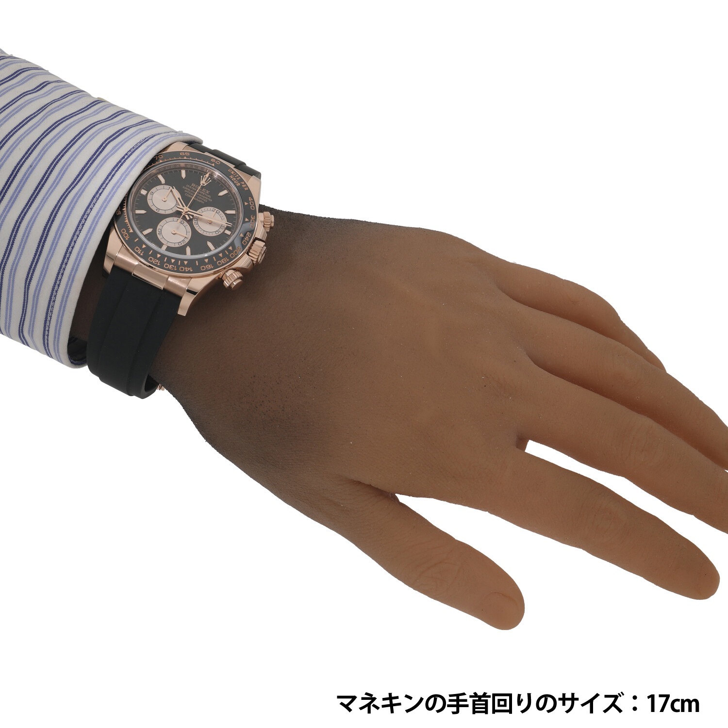 | モデルについて / Features | 2023年の新作 ロレックスのプロフェッショナルモデルの頂点に君臨し、キングオブクロノグラフとも称されるデイトナ。ケースとバックルにはロレックスの独自素材であるエバーローズゴールド、ブレスレットは柔軟性のあるチタン・ニッケル合金製ブレードを耐久性に優れる高性能ブラックエラストマーで覆ったオイスターフレックスを採用しています。重厚なゴールドケースですがオイスターフレックスを組み合わせる事で存在感がありつつも重すぎない着け心地です。ムーブメントはロレックス自社製キャリバー4131を搭載しています。 |