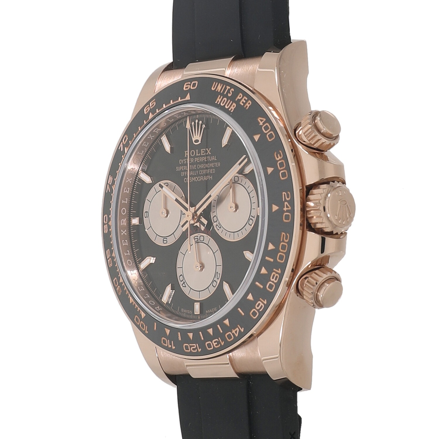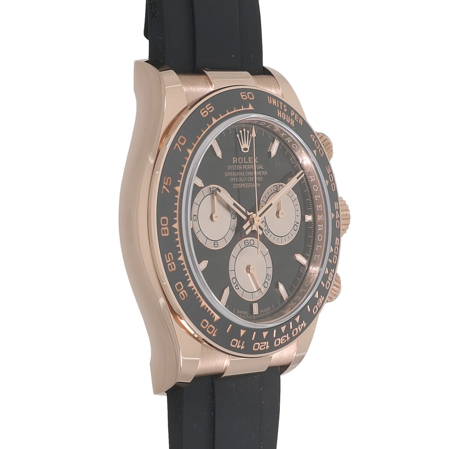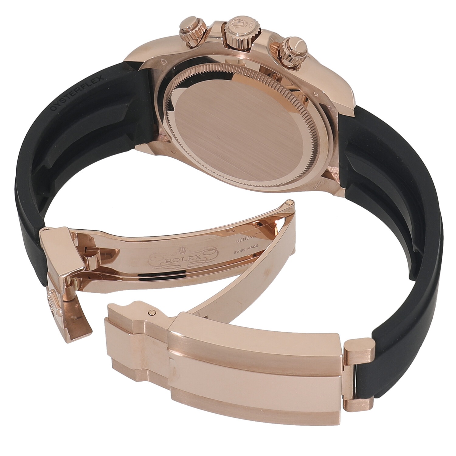 | モデルについて / Features | 2023年の新作 ロレックスのプロフェッショナルモデルの頂点に君臨し、キングオブクロノグラフとも称されるデイトナ。ケースとバックルにはロレックスの独自素材であるエバーローズゴールド、ブレスレットは柔軟性のあるチタン・ニッケル合金製ブレードを耐久性に優れる高性能ブラックエラストマーで覆ったオイスターフレックスを採用しています。重厚なゴールドケースですがオイスターフレックスを組み合わせる事で存在感がありつつも重すぎない着け心地です。ムーブメントはロレックス自社製キャリバー4131を搭載しています。 |