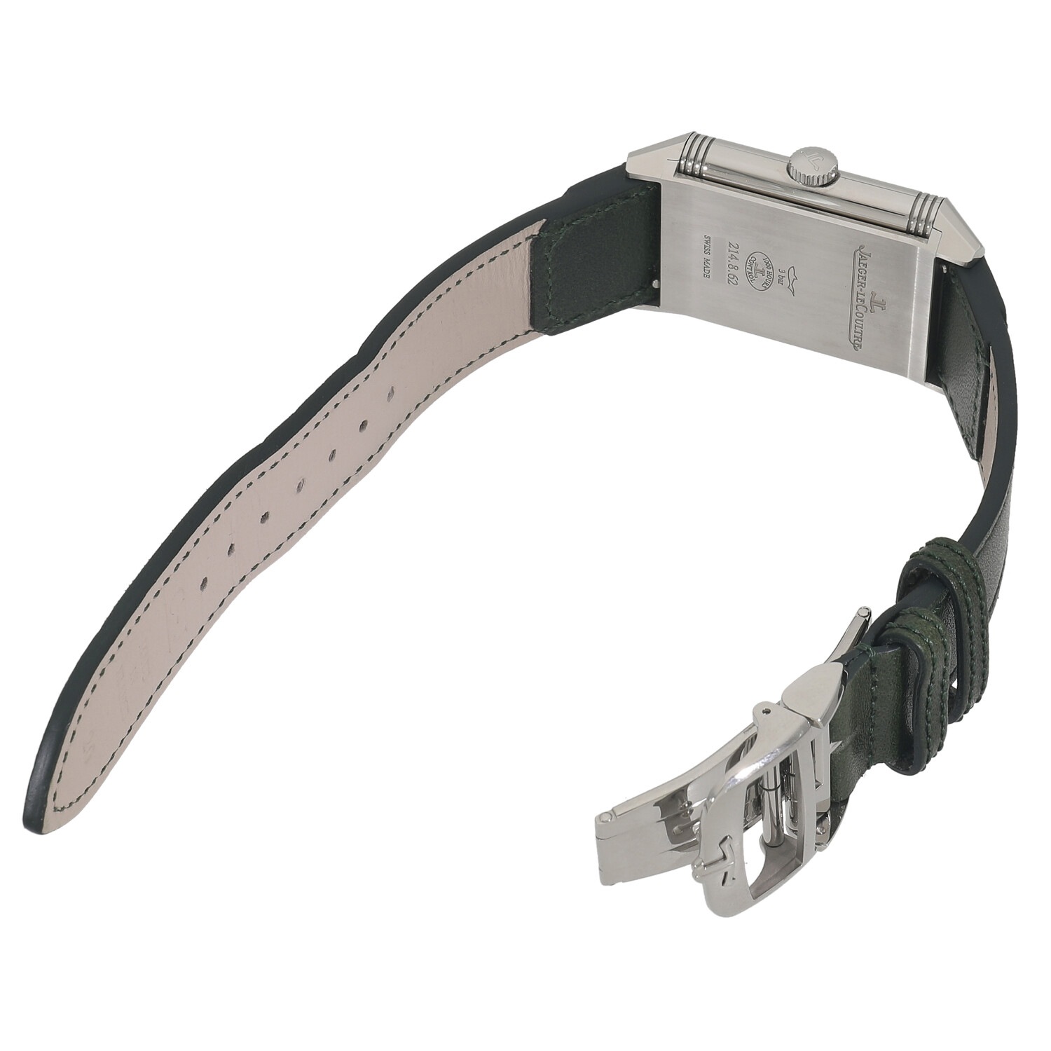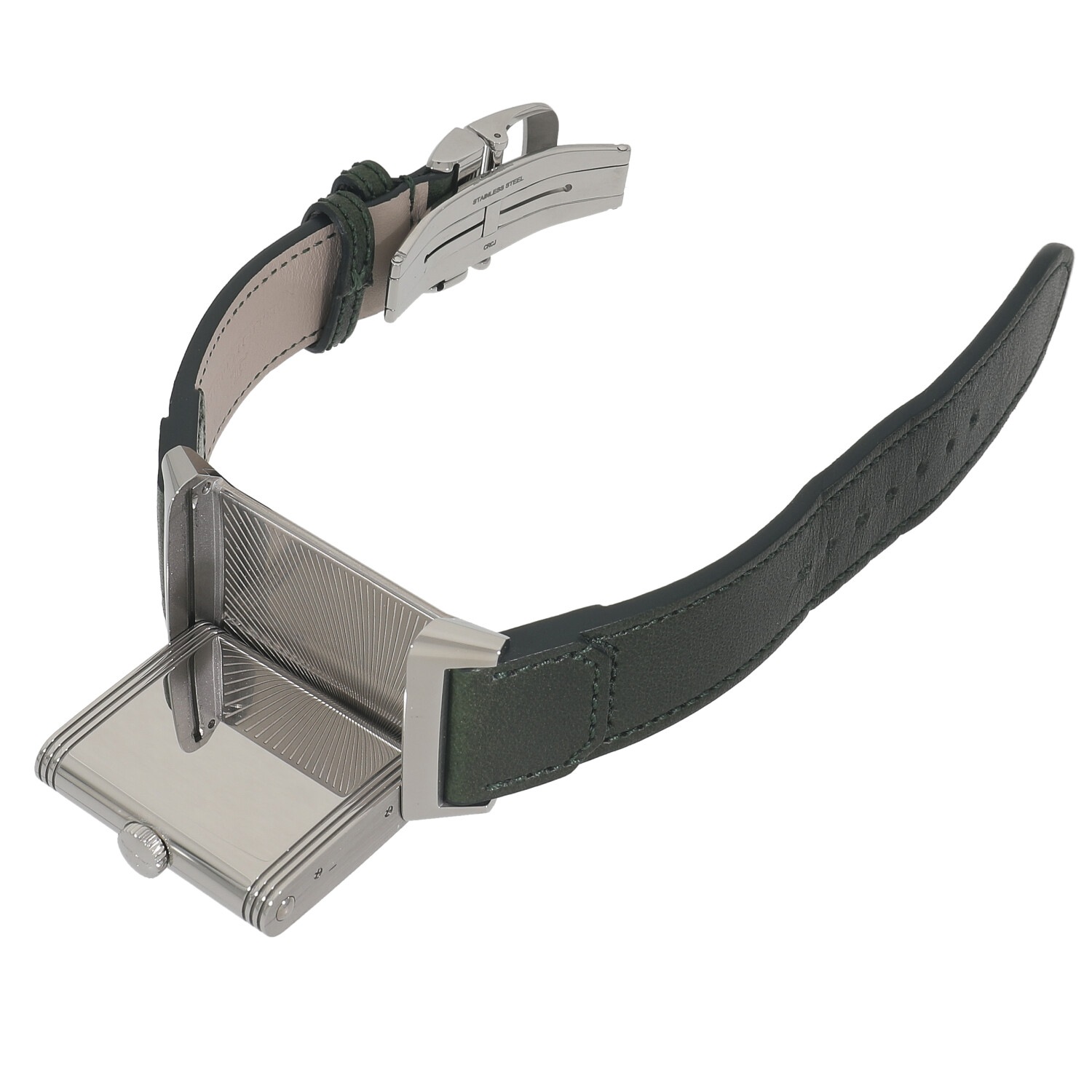 | モデルについて / Features | マスターシリーズと並びジャガールクルトを代表するコレクションであるレベルソ。インド駐在の英国人将校から『ポロの試合中でも着けられる時計を…』という要望を受け、ケースを表裏と反転させる事で文字盤を守る事が出来る様に設計・デザインしたのがレベルソの特徴です。1931年に誕生したレベルソ初代モデルにインスパイアされデザインされたトリビュートモデルになります。サンレイ仕上げが施された上品で落ち着いた印象のグリーン文字盤が目を惹きます。しなやかで着け心地の良いカーフ製ストラップは、アルゼンチンのブーツメーカーとして名高いファリアーノコレクションを採用しています。 |