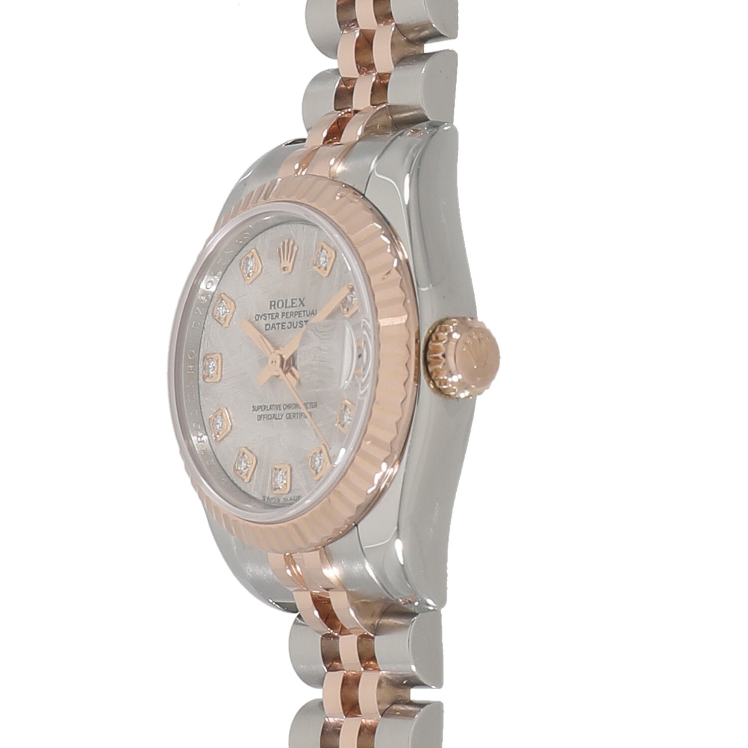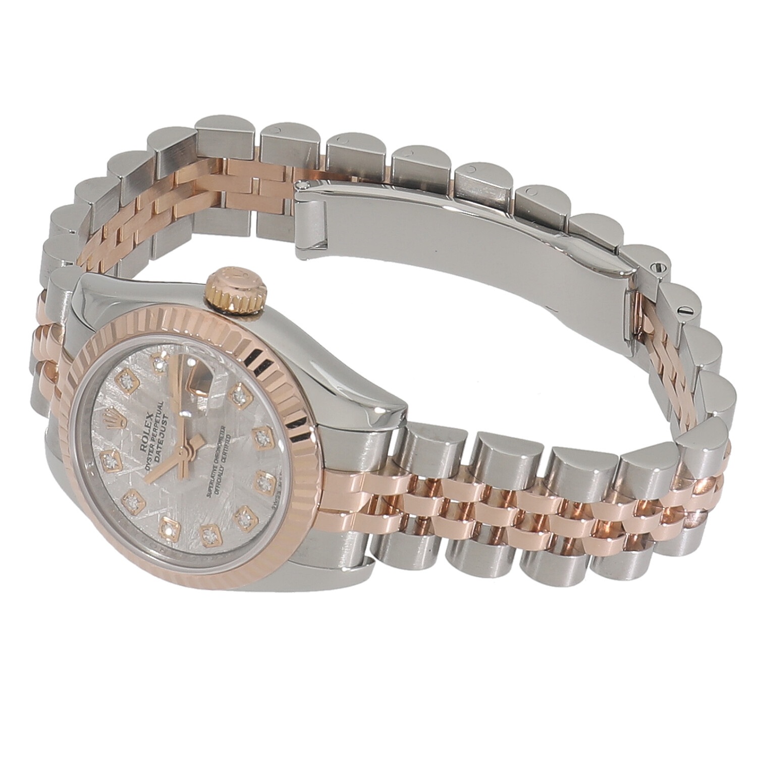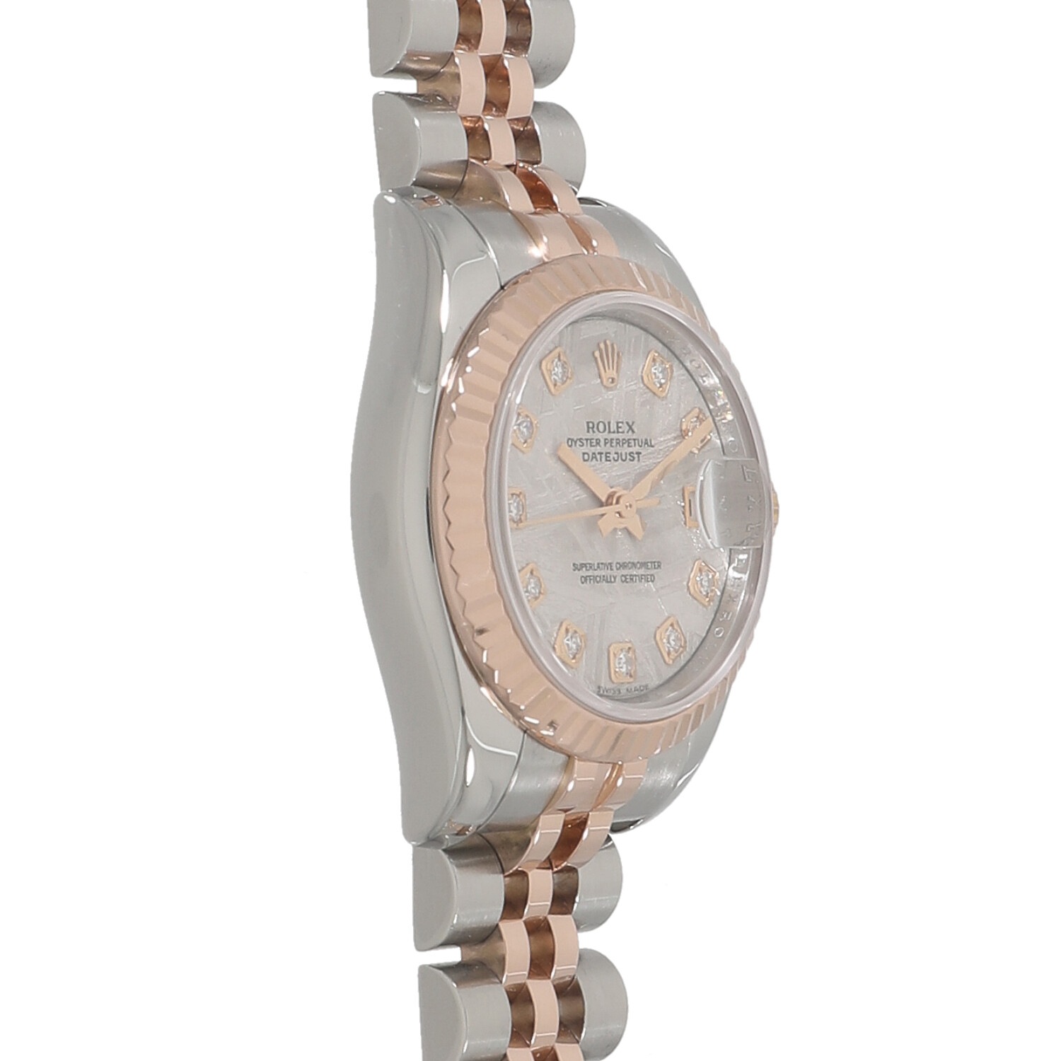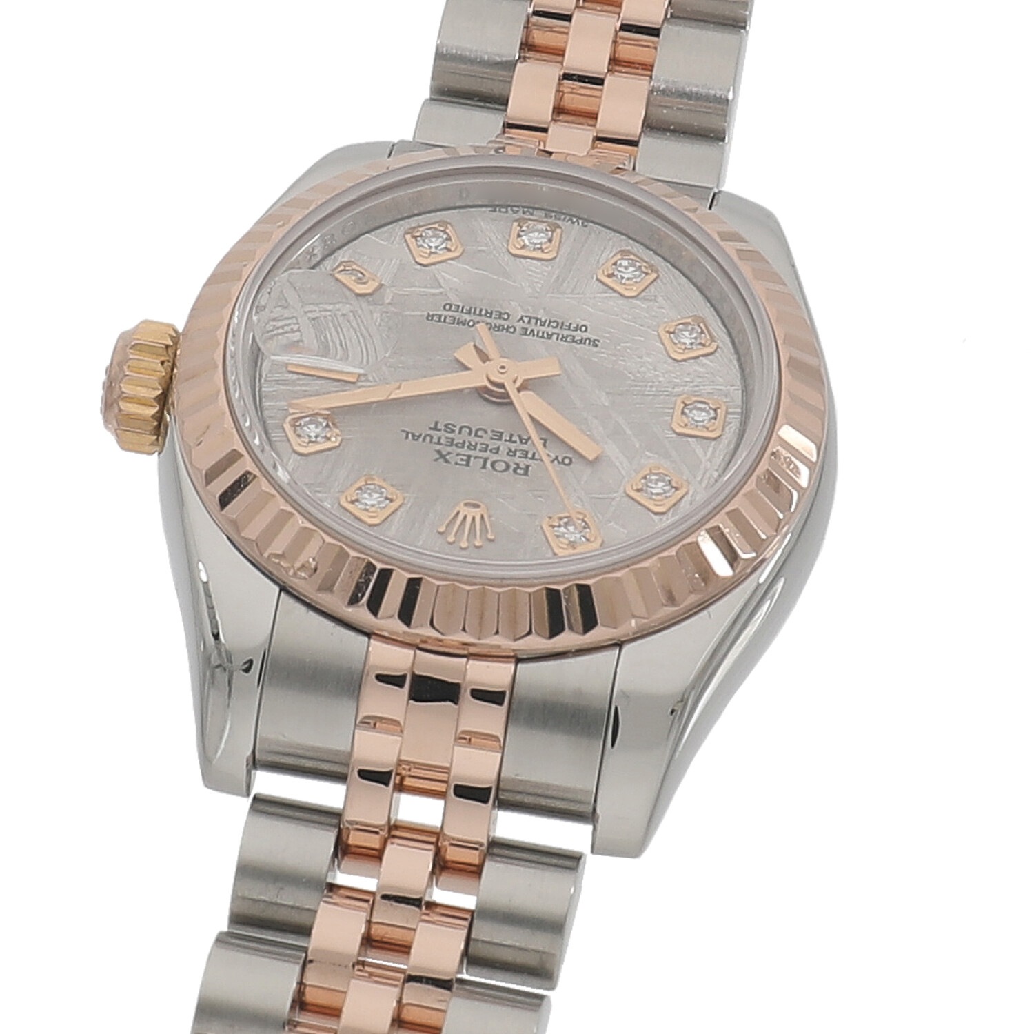 | モデルについて / Features | 1945年の誕生から現在に至るまでラインナップを続けるデイトジャストは、ロレックスの三大発明であるオイスター(防水)、パーペチュアル(自動巻)、デイトジャストの全てを備えており、まさにロレックスのアイコン的存在であると言えます。数あるロレックスのコレクションの中でも、文字盤や素材の組み合わせ、メンズやレディースのサイズなど、非常に多くのバリエーションが展開されるコレクションです。タイムレスで飽きの来ないデザインは多くの男女を魅了し続けています。文字盤には希少なメテオライト、インデックスにはダイヤモンドがセッティングされています。 |