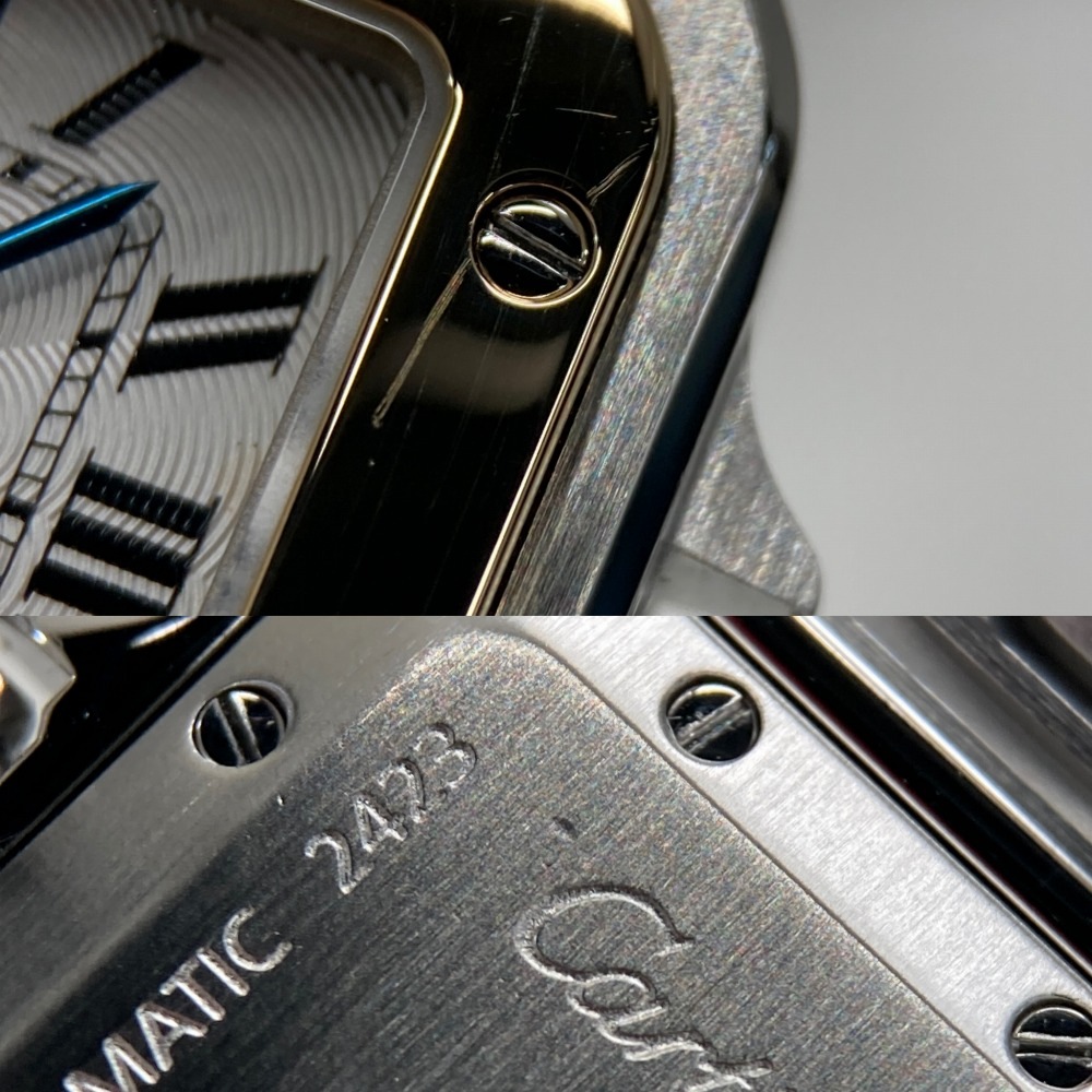 | モデルについて / Features | カルティエの数ある人気コレクションの一つであるサントス。オリジナルのサントスをベースにして作られたサントスガルベ。ガルベとはフランス語で「膨らみのある、美しい曲線」を意味し、直線的だったサントスのケースにやや丸みと厚みを持たせ、ゆったりとしたカーブを描き柔らか印象となり、更にスタイリッシュさが増し装着感も向上しました。サントスの特徴でもあるビスモチーフが施されたブレスレットとベゼルの表面が目を惹きます。ケースサイズやムーブメントの違いなどで様々なバリエーションが展開され、誕生以来多くの男女を魅了するコレクションです。 |