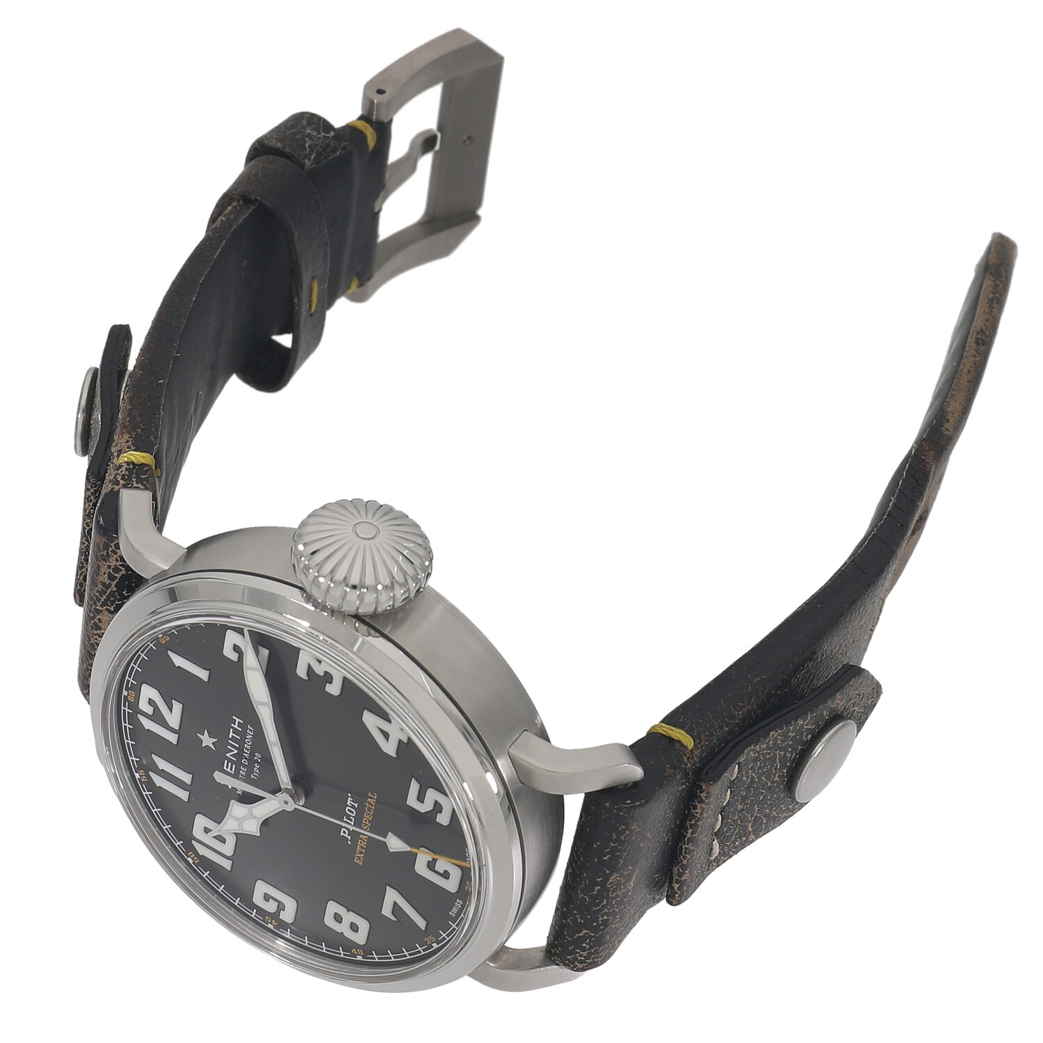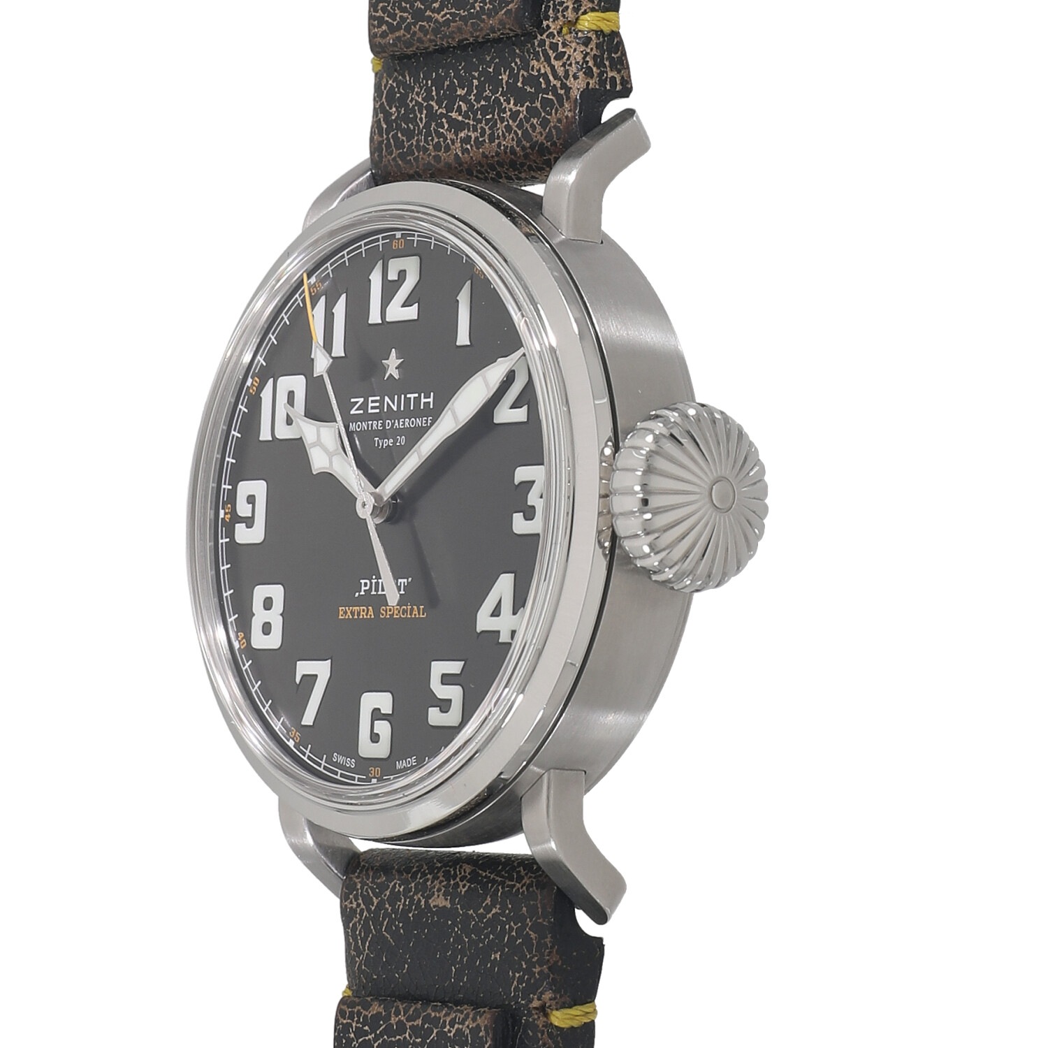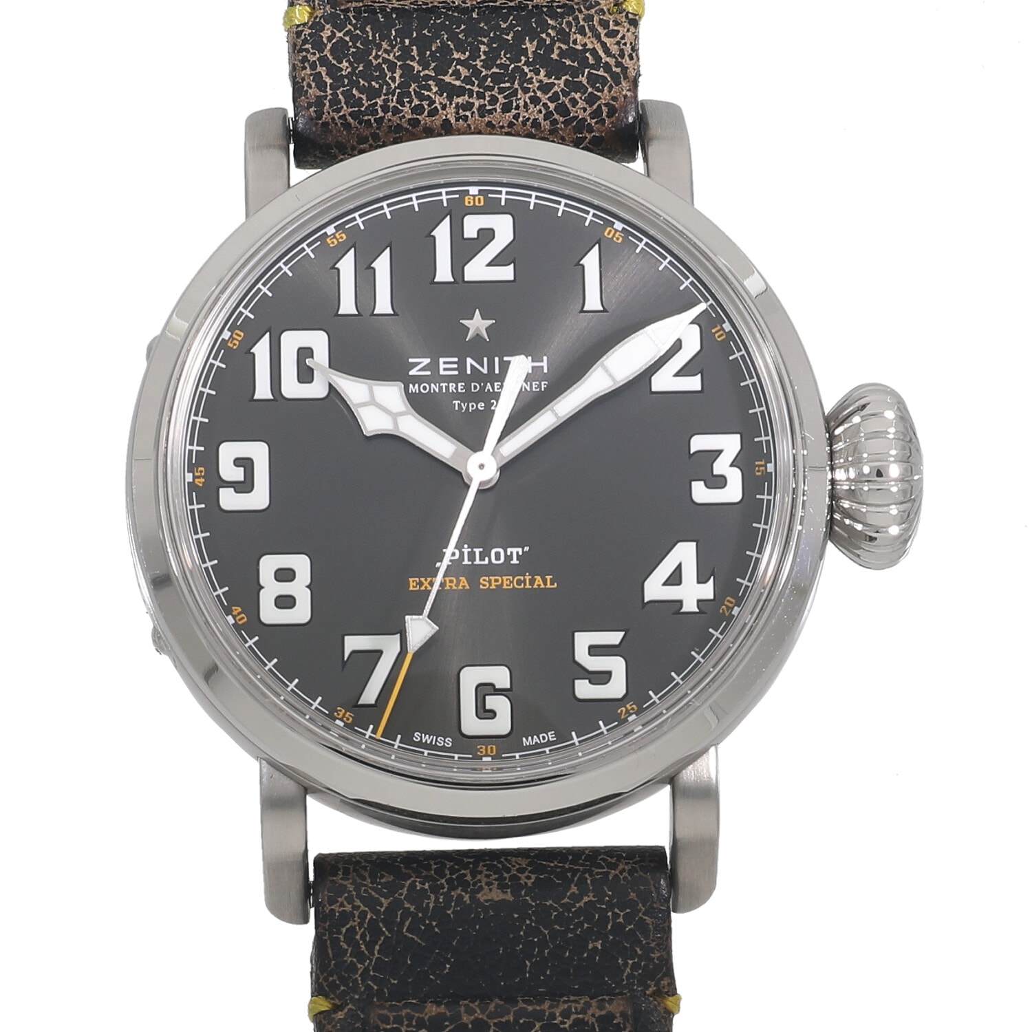| モデルについて / Features | ゼニスのパイロットウォッチコレクションとして展開されたタイプ20シリーズ。45ミリと存在感を存分に感じる大型のケース、玉ねぎ型で大きく操作性の良いリューズ、航空機の計器類を想わせる大きめの針やインデックスなどが、古き良きアビエーションウォッチを彷彿とさせるデザインが特徴です。スレートグレーの落ち着いた色目のダイヤル、秒針の先端や5分ごとのアワーマーカーなど随所に差し色となるイエローを組み合わせます。大きいアラビア数字のインデックスに太い針は視認性が良く、着古したフライトジャケットを連想させるエイジングカーフなどがパイロットウォッチらしさを演出しています。 |