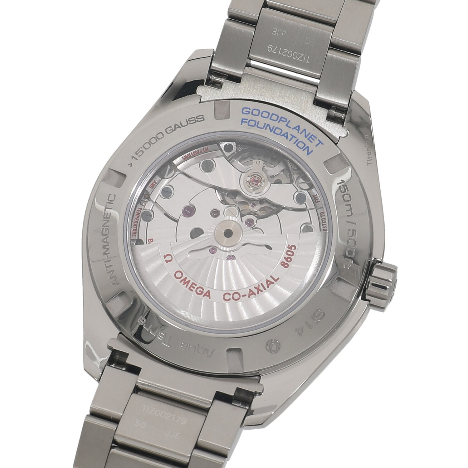 | モデルについて / Features | 落ち着いたシックな趣のデザインでビジネスシーンでも打ってつけのモデルであるアクアテラ。シースルーバックからはGMT機能を備えるCal.8605の美しいムーブメントを堪能でき、15,000ガウス以上の磁気に耐える超耐磁機能を備えています。地球と地球上の生命を尊重し積極的な行動を促すことを目的とした基金である、グッドプラネット財団とのパートナーシップを記念し作られました。アクアテラらしい縞模様のチークコンセプトダイヤルではなく、艶やかなラッカー仕上のホワイトダイヤルにブルーの各針とインデックスの組み合わせの美しさが印象的なモデルです。ケースとブレスレットの素材にはグレード5ののチタンを採用しており、大きめのケースながら軽快な装着感も魅力です。 |