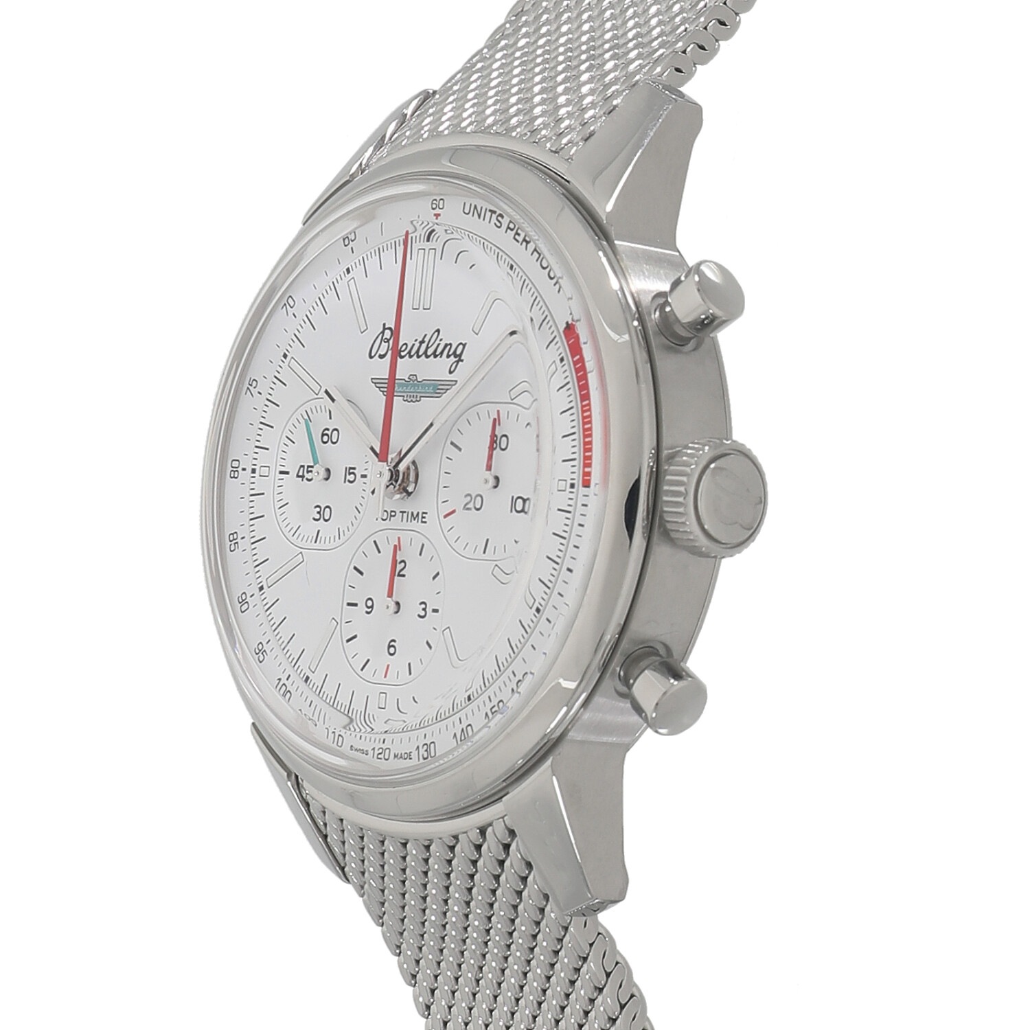 | モデルについて / Features | 2023年の新作 1960年代に誕生し名機と称されるトップタイム。バイクでもスポーツカーでも全力で走り抜くという自由でエネルギッシュな、当時の若者たちの雰囲気を感じ取りウイリー・ブライトリングが開発に着手。ダイナミックで自由奔放なライフスタイルの若者をターゲットとし、スポーティーで現代的なデザインで誕生します。2023年にブライトリング社製Cal.B01を搭載し新生トップタイムとして誕生します。1954年のデトロイトモーターショーでお披露目されたフォード サンダーバードとのコラボレーションモデルで、文字盤と裏蓋のサファイアクリスタルにはサンダーバードのエンブレムがペイントされます。 |