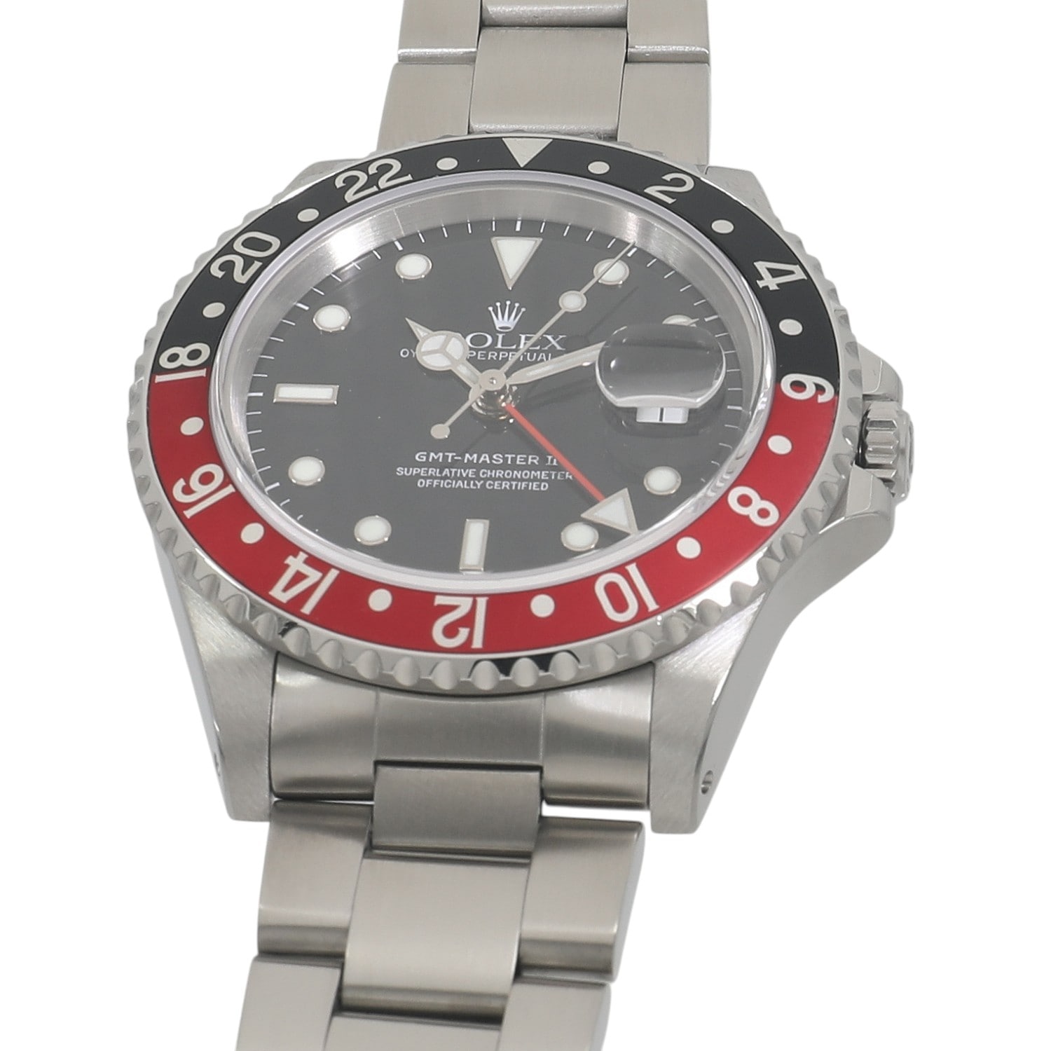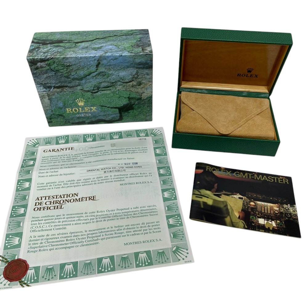 | モデルについて / Features | 2か国の時刻を同時に読み取れるパイロットウォッチとして誕生したGMTマスター。短針(時針)を単独で操作できる様になったCal.3085が開発され、同時に3か国の時刻を読み取れるようになったGMTマスターII。GMTマスターIIの初代モデルであるRef.16760の後継機種として、新型キャリバー3185を搭載し1990年に誕生したRef.16710。2007年まで製造が続いたロングセラーモデルです。ブラック、ブラック*レッド、ブルー*レッドと3種類のカラーリングのベゼルインサートで展開されます。ベゼルのカラーリングの見た目から、黒赤はコーク(コカ・コーラ)、赤青はペプシの愛称で親しまれる人気モデルです。 |