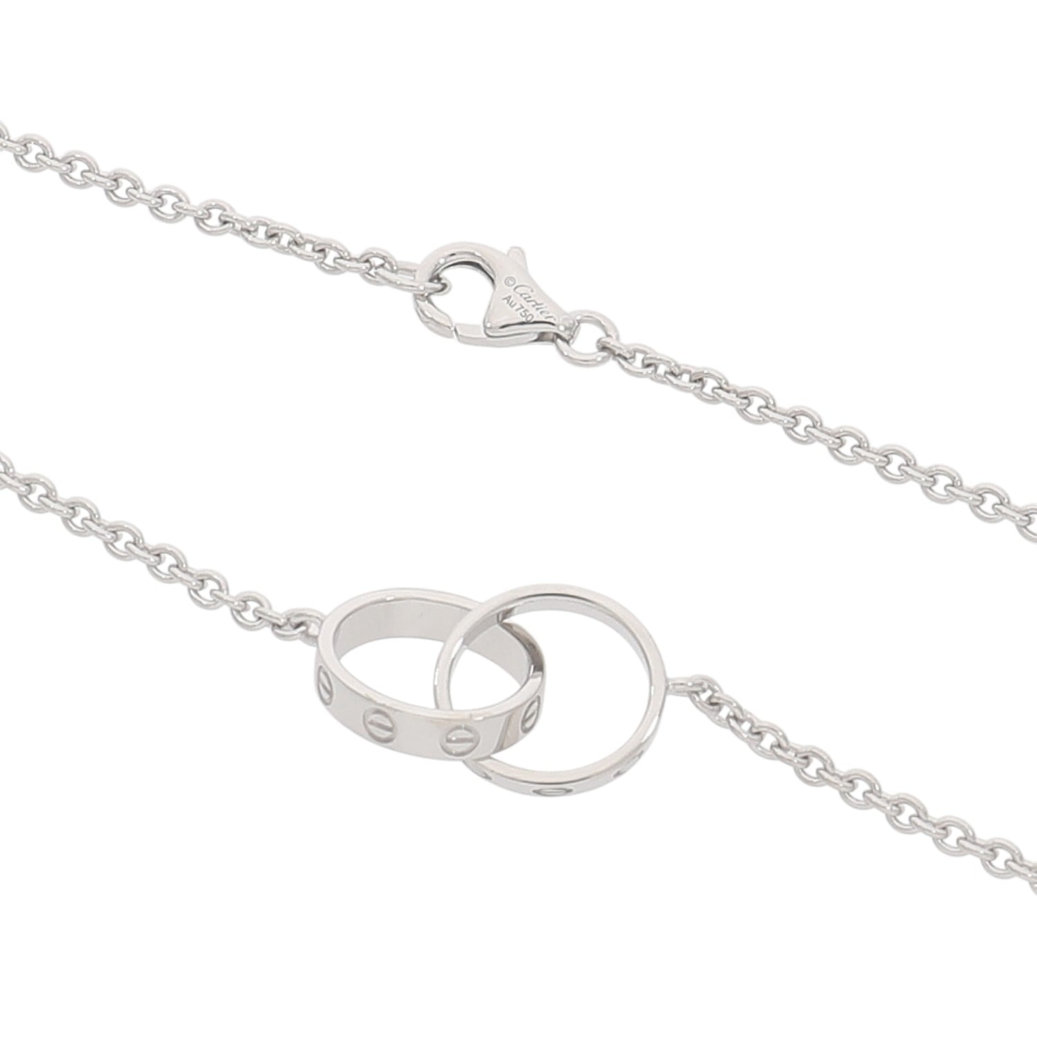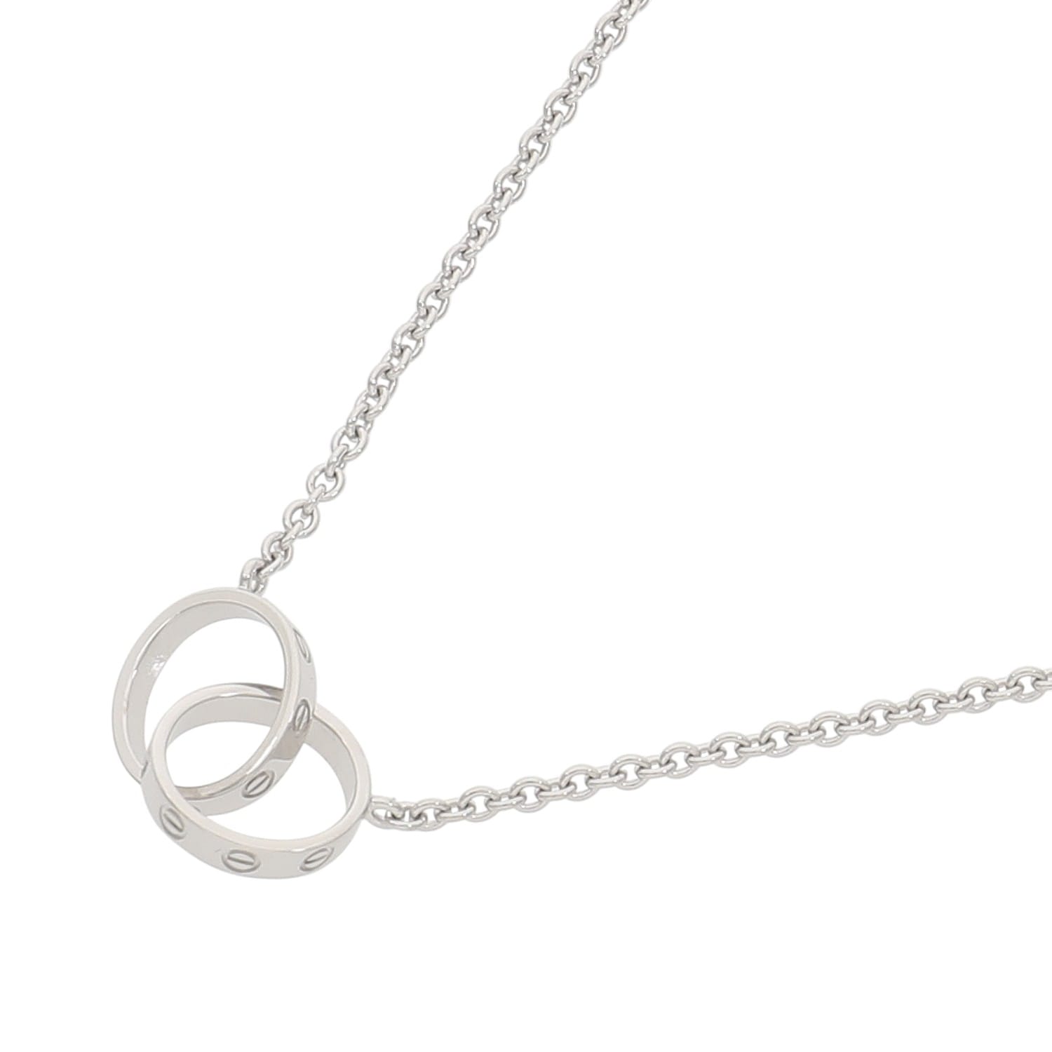 | モデルについて / Features | ふたつの楕円形のリングが絡み合うベビーラブ。ラブコレクションのアイコンともいえるビスが刻まれており、カルティエらしさのあるデザインとなっています。ホワイトゴールド製のチェーンはやや太めで、クールなファッションにも合わせやすい印象です。 |