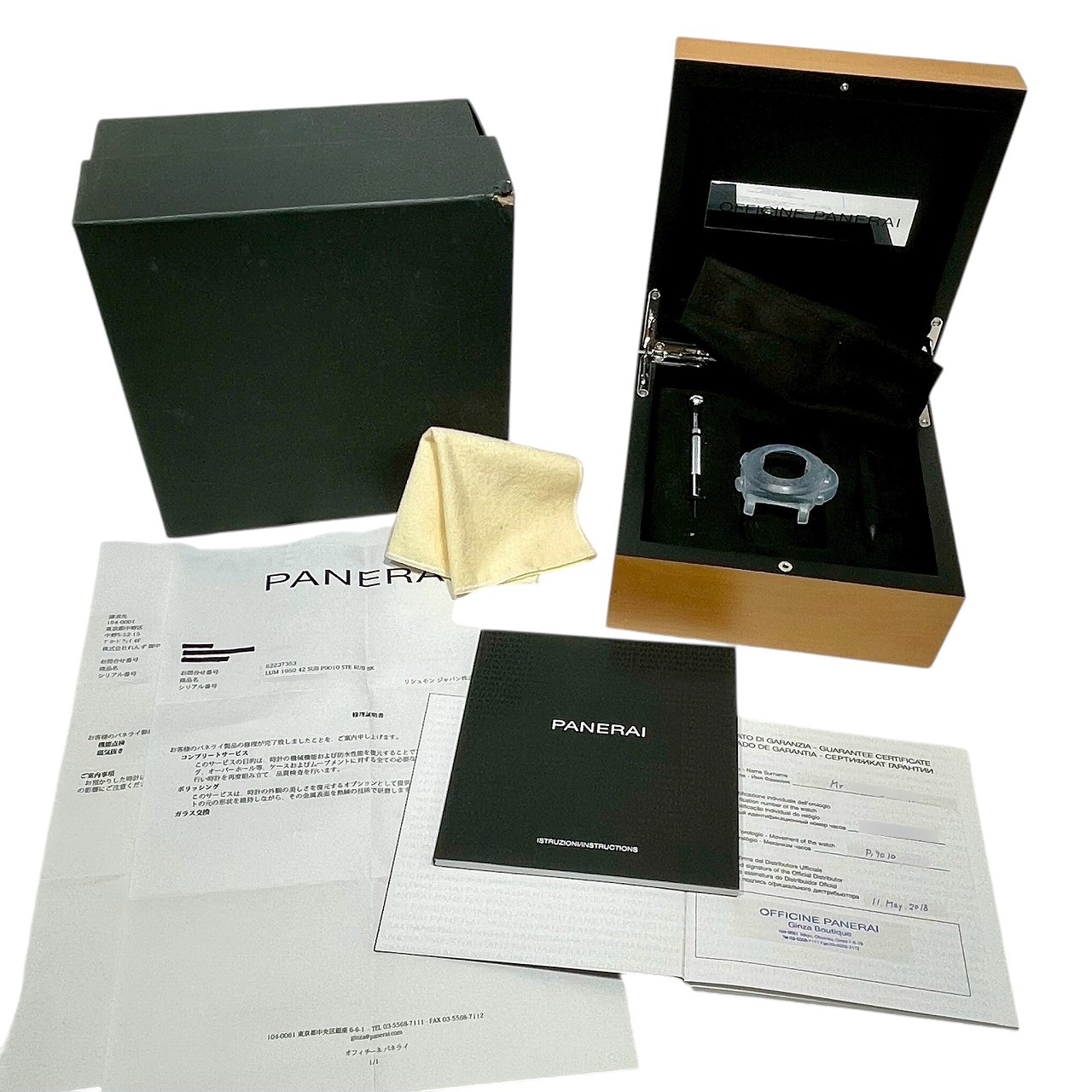 | 付属品 / Accessories | 純正ボックス(外箱ダメージ) / 国際保証書(国内:2018年5月 ) / 修理明細書(2025年8月 点検・磁気抜き、2024年8月:コンプリートサービス、ポリッシュ、ガラス交換) / 説明書、工具、ケースカバー |