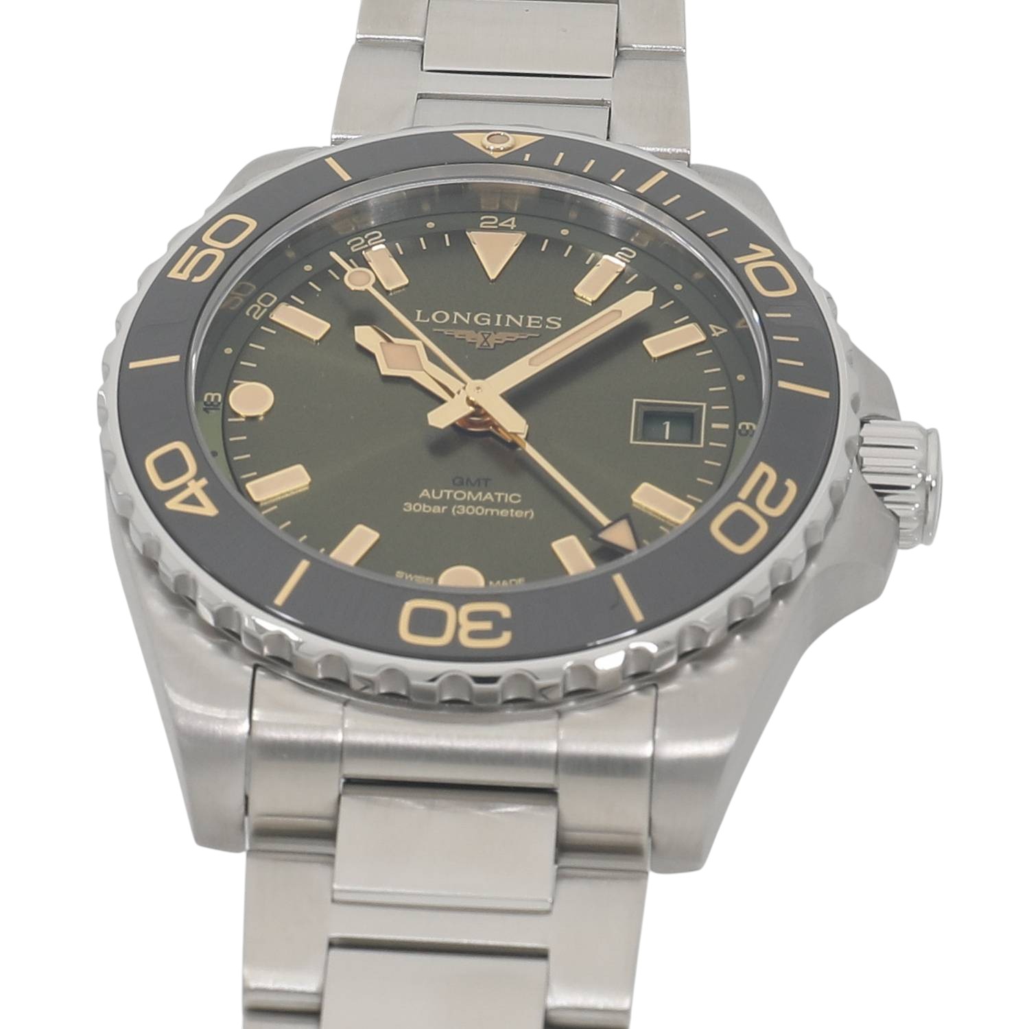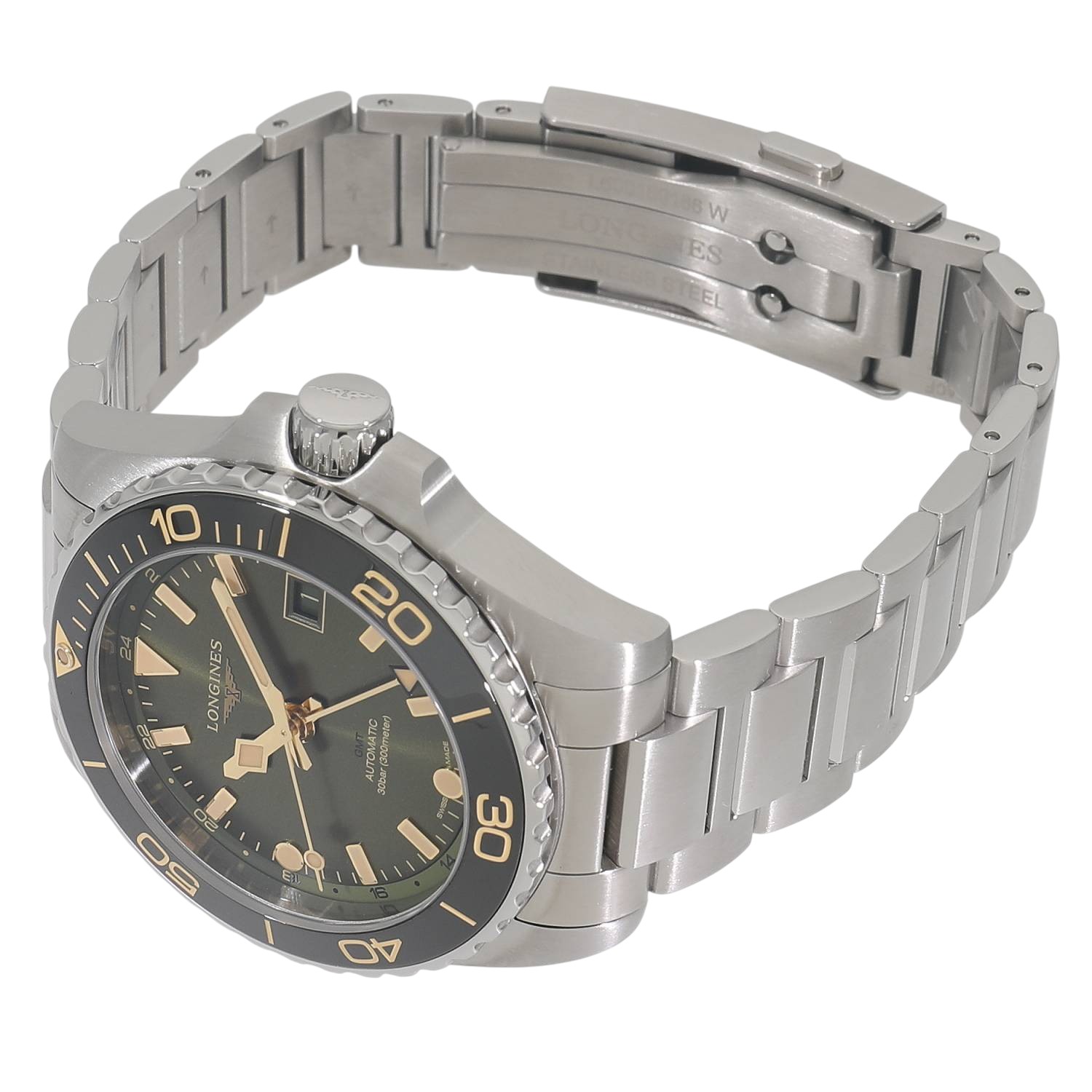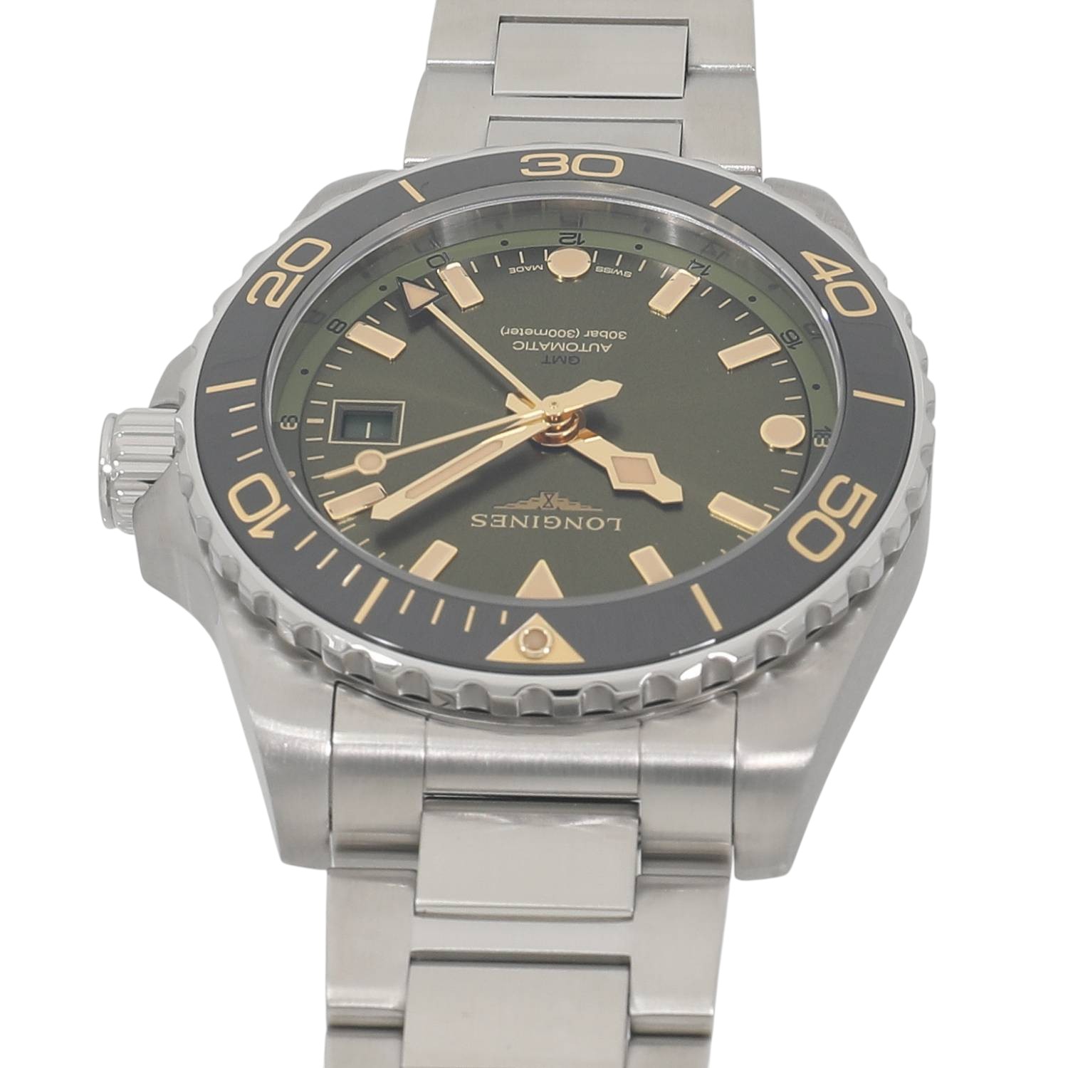 | モデルについて / Features | 2023年の新作 ロンジンのダイバーズウォッチコレクションとなるハイドロコンクエストシリーズ。本格的な300メートル防水に加え、2か国の時刻を同時に読み取れるGMT機能を追加したハイドロコンクエストGMTが登場。72時間のパワーリザーブとシリコン製ヒゲゼンマイを備えたロンジン製ムーブメントであるL844を搭載します。サンレイ仕上げを施した上品なグリーン文字盤に、セラミック製のベゼルインサートを組み合わせる事で高級感を感じます。薄く滑らかなステンレス製ブレスレットの装着感は良好です。 |