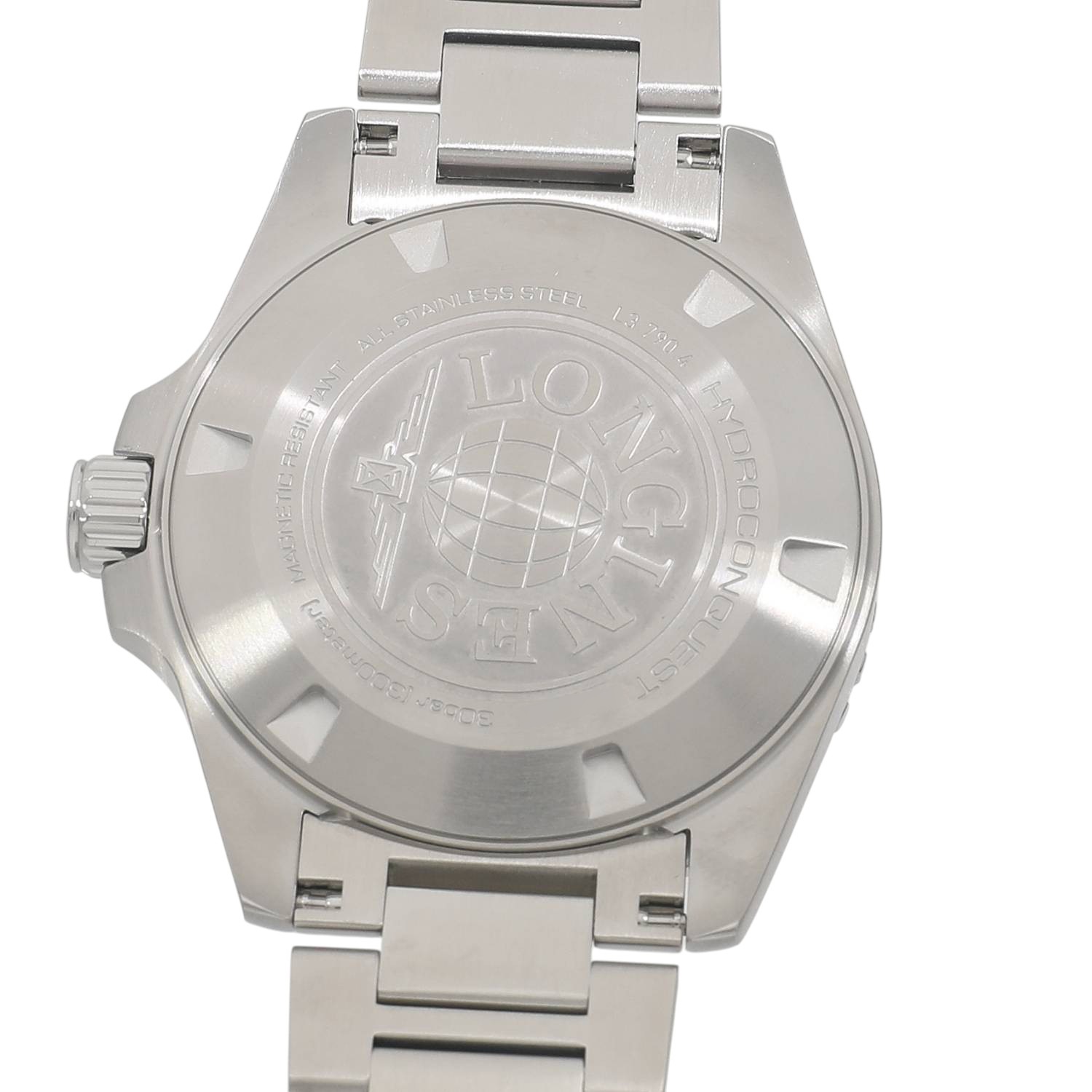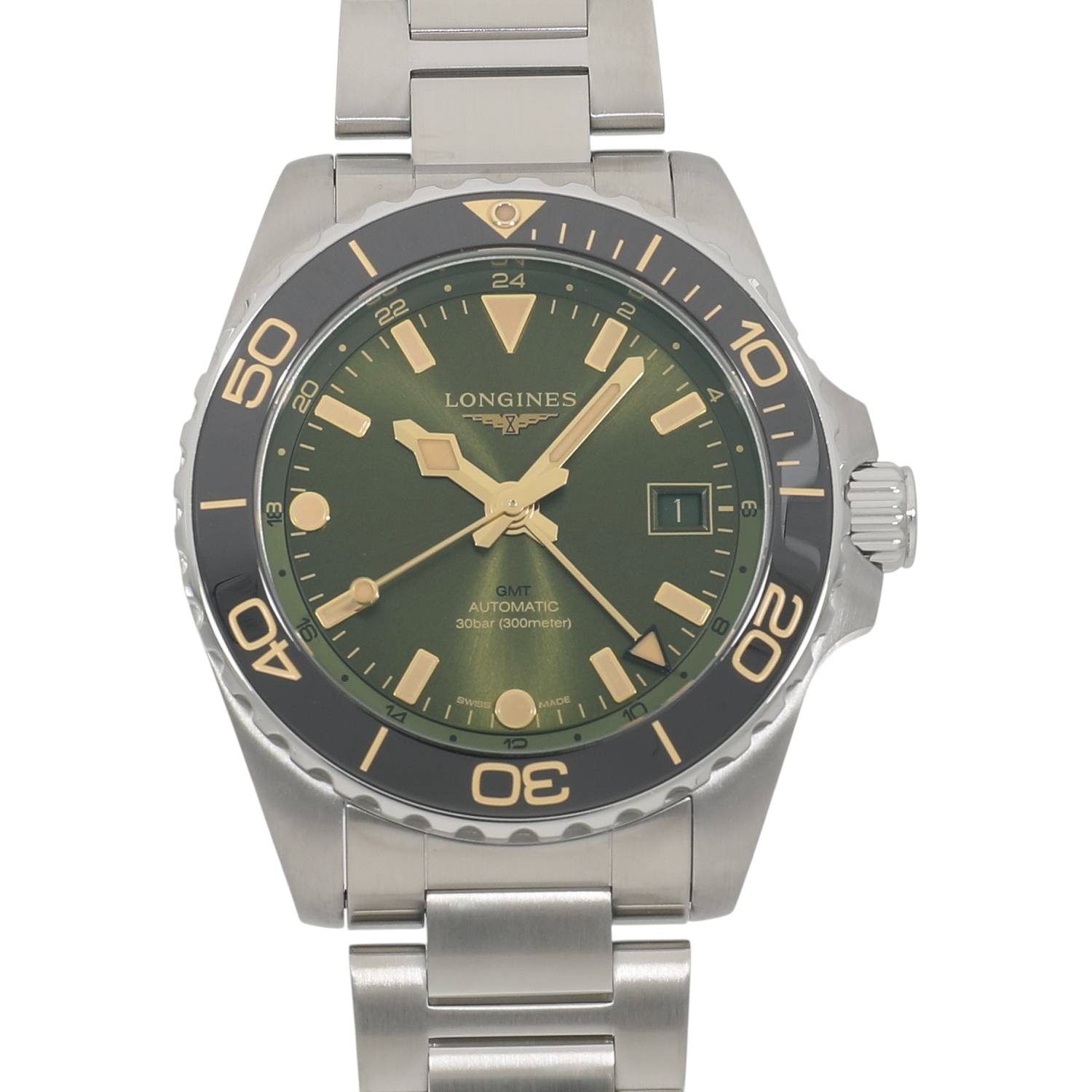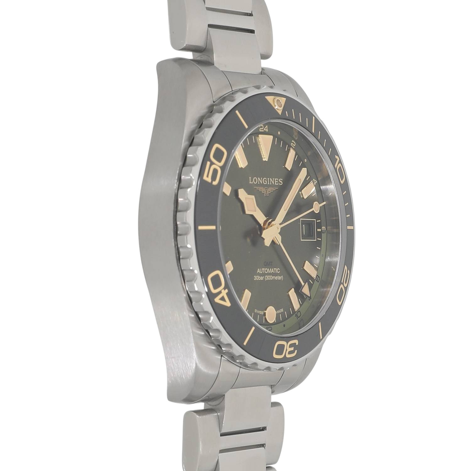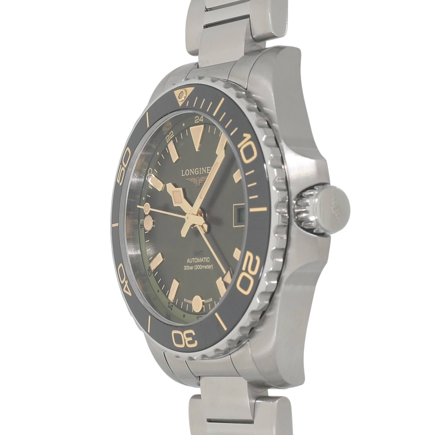 | モデルについて / Features | 2023年の新作 ロンジンのダイバーズウォッチコレクションとなるハイドロコンクエストシリーズ。本格的な300メートル防水に加え、2か国の時刻を同時に読み取れるGMT機能を追加したハイドロコンクエストGMTが登場。72時間のパワーリザーブとシリコン製ヒゲゼンマイを備えたロンジン製ムーブメントであるL844を搭載します。サンレイ仕上げを施した上品なグリーン文字盤に、セラミック製のベゼルインサートを組み合わせる事で高級感を感じます。薄く滑らかなステンレス製ブレスレットの装着感は良好です。 |