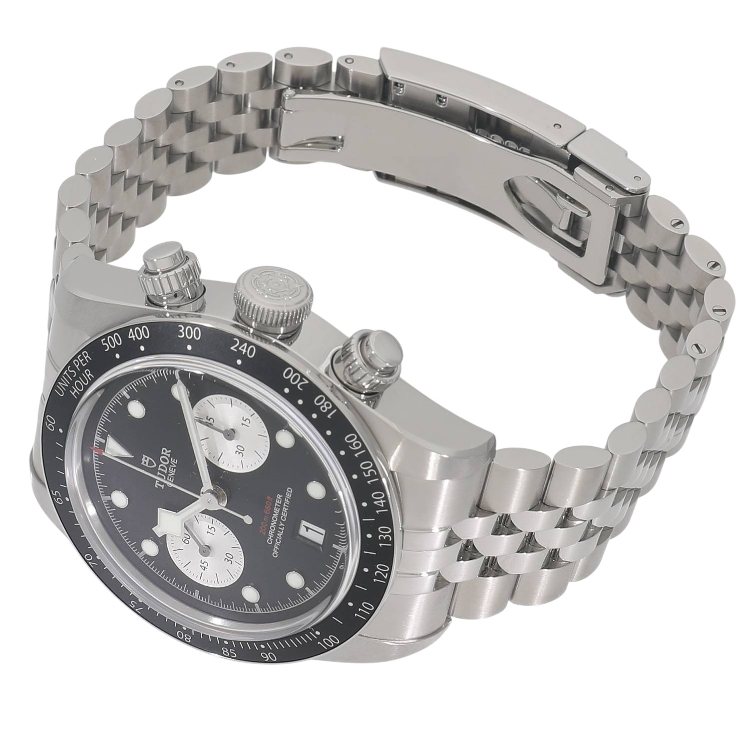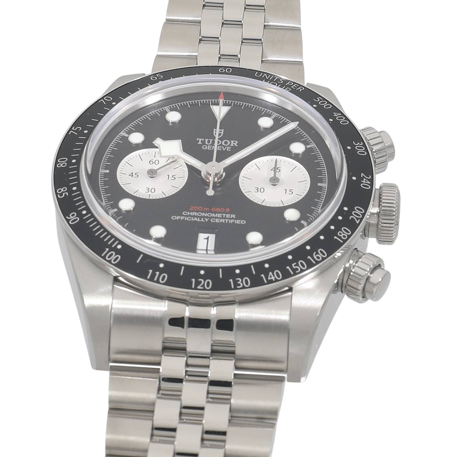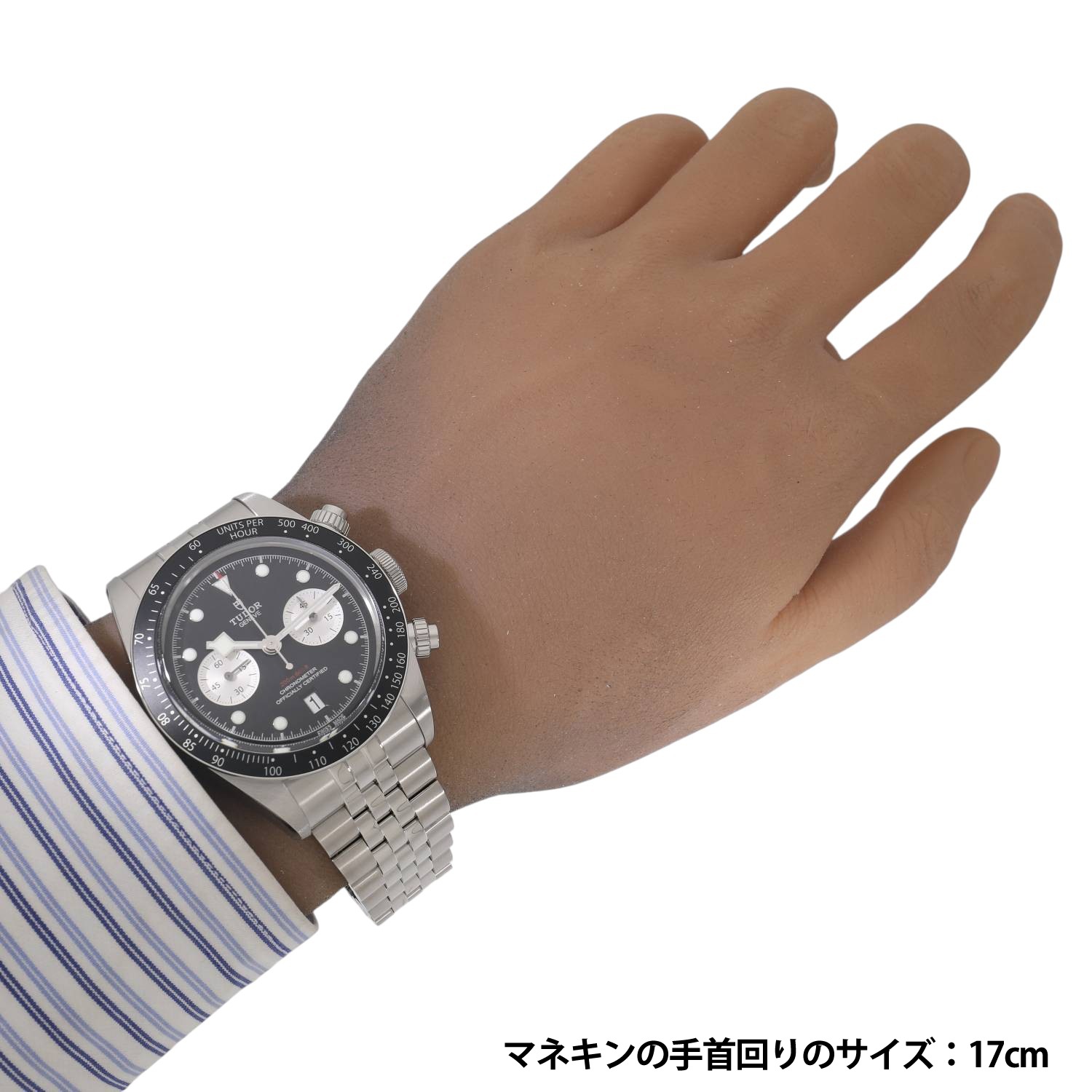 | モデルについて / Features | 2025年の新作 チューダーのアイコン的コレクションとして、人気のブラックベイシリーズ。ブラックベイらしくダイバーズウォッチの流れを組んだケースデザインに、モータースポーツのイメージを結びつけるストップウォッチ機能を備えるクロノグラフモデルが2019年に発表されます。ステンレスケースを採用したブラックベイクロノグラフは、2021年にラインナップに加わり、更に高い人気と支持を得る事になります。2025年の最新仕様では工具を使わず8ミリの長さを5段階で簡単に調整できるT-fitクラスプへと変更されました。 |