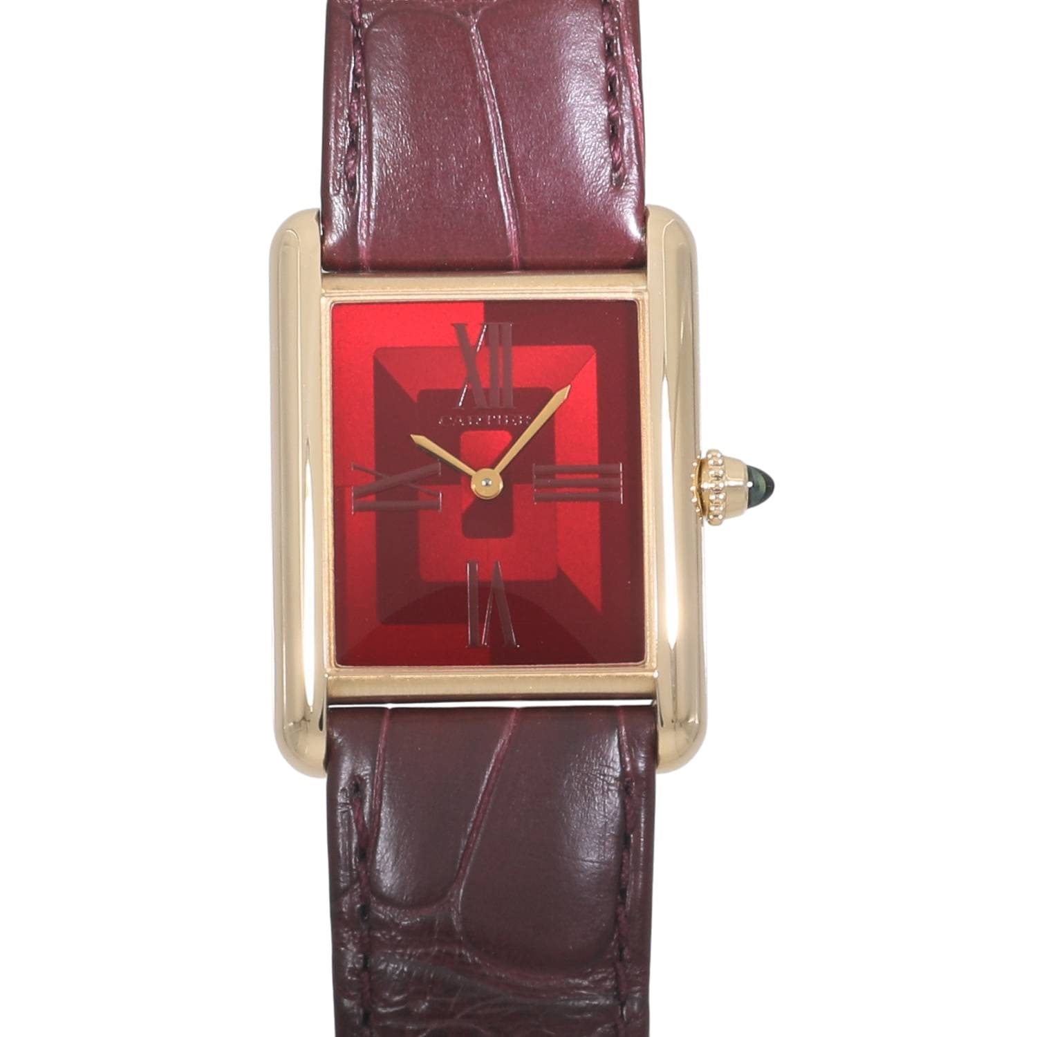 | モデルについて / Features | タンクウォッチは遡る事100年以上前の1917年にプロトタイプが制作され、その2年後の1919年に発売となって以来カルティエを代表するアイコンとして多くの女性を魅了し高い人気を誇り続けています。創業者本人の名前をコレクション名に冠しており、まさにカルティエの象徴とも言えます。レクタンギュラーケースはイエローゴールド素材を採用し、深紅のレッドカラーの文字盤を組み合わせます。柔らかな曲線を描くミネラルクリスタルガラスに、リュウズ先端のサファイアカボションがカルティエらしい気品ある美しさを持っています。ムーブメントはジャガールクルト社が開発し、傑作とも称されるトノー型のCal.846をベースにカルティエが改良を施したCal.1917MCを搭載しています。 |