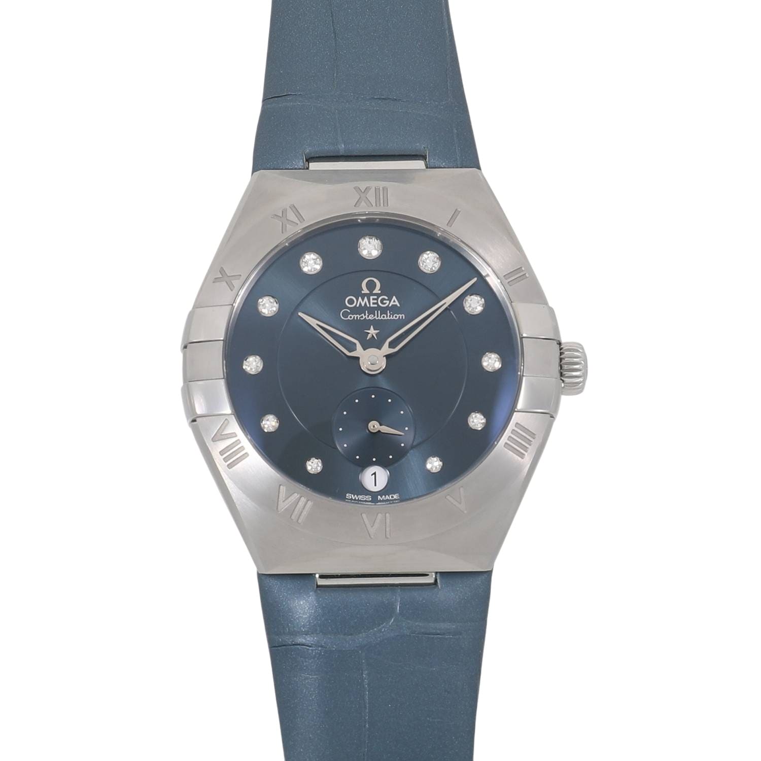 | モデルについて / Features | オメガのアイコン的コレクションであるコンステレーションは1952年に初代モデルが誕生しました。3時と9時位置にある爪が特徴的で、発表されてから不朽のデザインコンセプトで多くの男女に愛されるオメガのドレスウォッチにおける象徴的モデルです。34mmのステンレススティール製モデルは、ベゼルにローマ数字を刻印。サンブラッシュ仕上げを施したピーコックブルーのダイアルには、6時位置にラウンドシェイプの日付窓が備えられています。12時方向に向かって徐々に大きくなるダイヤモンドのインデックスは18Kホワイトゴールドのホルダーにセットされており、高級感漂うモデルです。 |