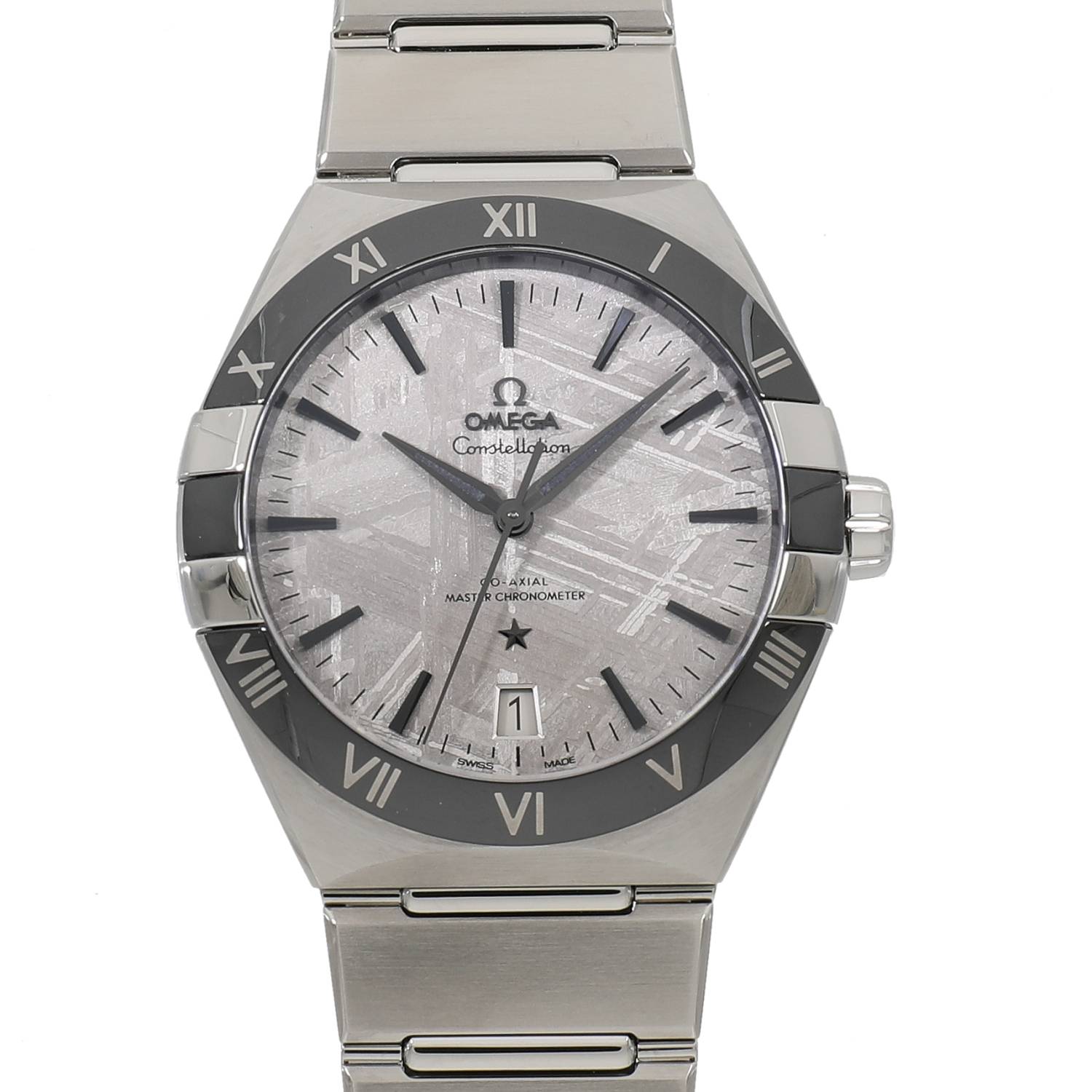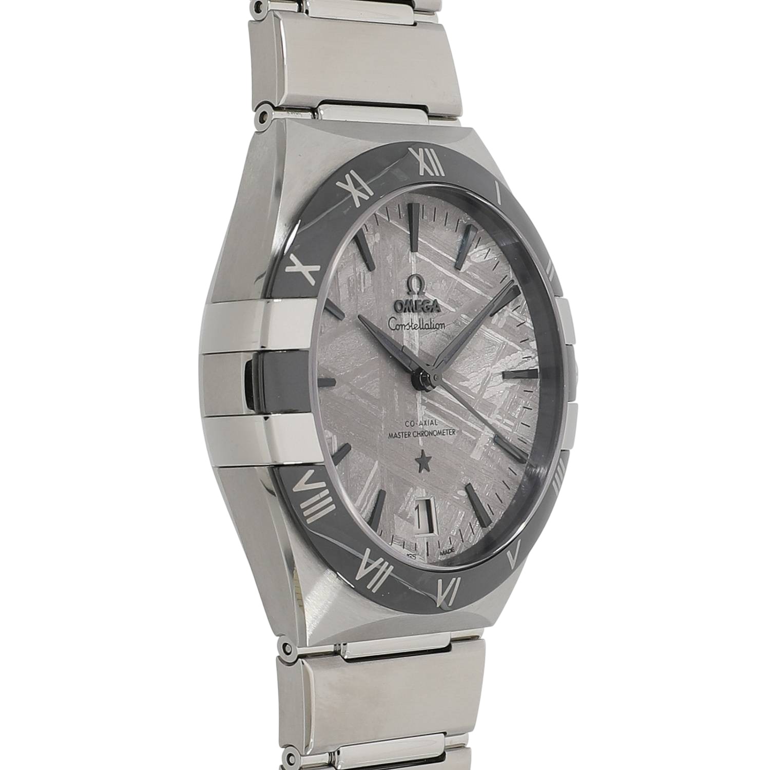 | モデルについて / Features | オメガのアイコン的コレクションであるコンステレーションは1952年に初代モデルが誕生しました。星座を意味する「コンステレーション」は、3時と9時にある4つの「爪」、6時に輝く星、ローマ数字が刻まれたベゼルが特徴で、ドレッシーなスタイルが目を惹くオメガの人気コレクションです。ステンレス製のケースに艶やかなセラミック製のブラックカラーのベゼルを組み合わせたデザインは非常にシックで高級感のある面持ちです。文字盤にはロジウムグレーのガルバニック加工を施した鉄隕石(アイアン メテオライト)を採用しており、世に二つとして同じ柄のない唯一無二の存在です。 |