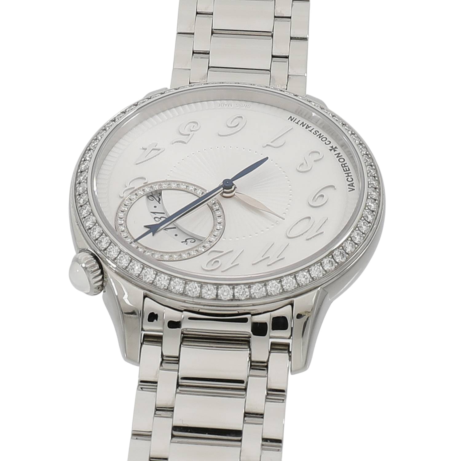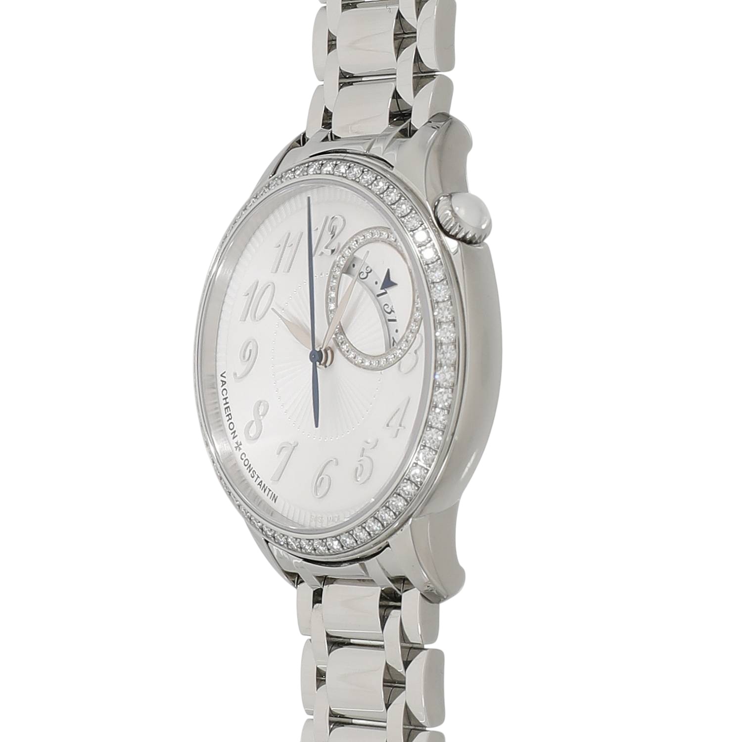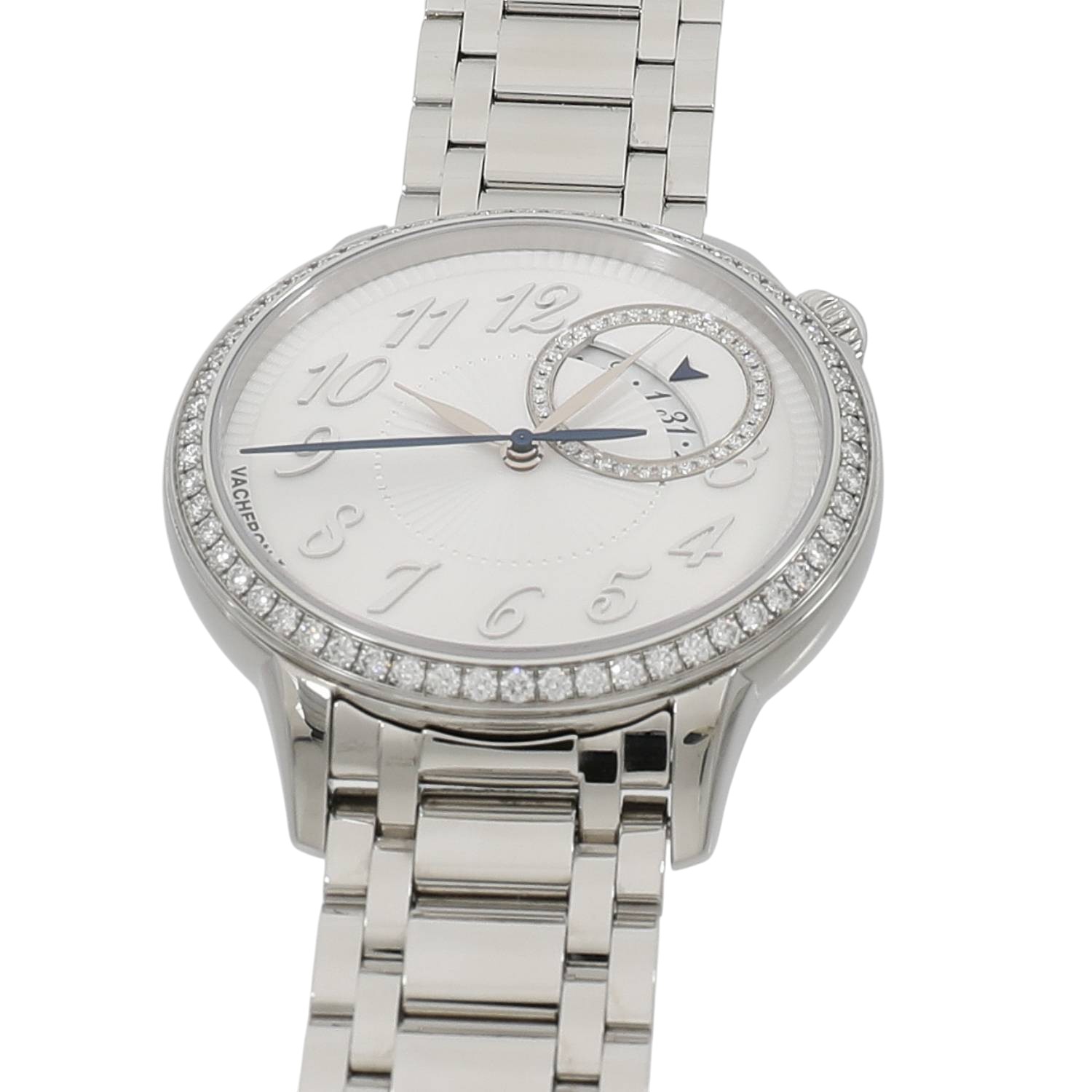 | モデルについて / Features | 老舗メゾンであるヴァシュロンコンスタンタンの新たな女性向けのコレクションとして2020年に展開を開始したエジェリー。オートオルロジュリーとオートクチュールの世界観の融合をコンセプトとしており、洗練されたデザインの美しいレディースウォッチを数多くラインナップしています。シルバーオパーリンカラーの文字盤には、オートクチュールのファブリックを想起させるプリーツ状のモチーフを施し、ベゼルと日付表示の外周部に合計92個のラウンドカットのダイヤモンドをセッティングしたエレガントなレディースウォッチです。1時位置にあるリュウズの先端にはダイヤルのカラーに併せ白いムーンストーンがセットされます。ケースバックはサファイアガラス製のスケルトン仕様となり、40時間のパワーリザーブを備えるヴァシュロンコンスタンタン社製Cal.1088を搭載しています。 |