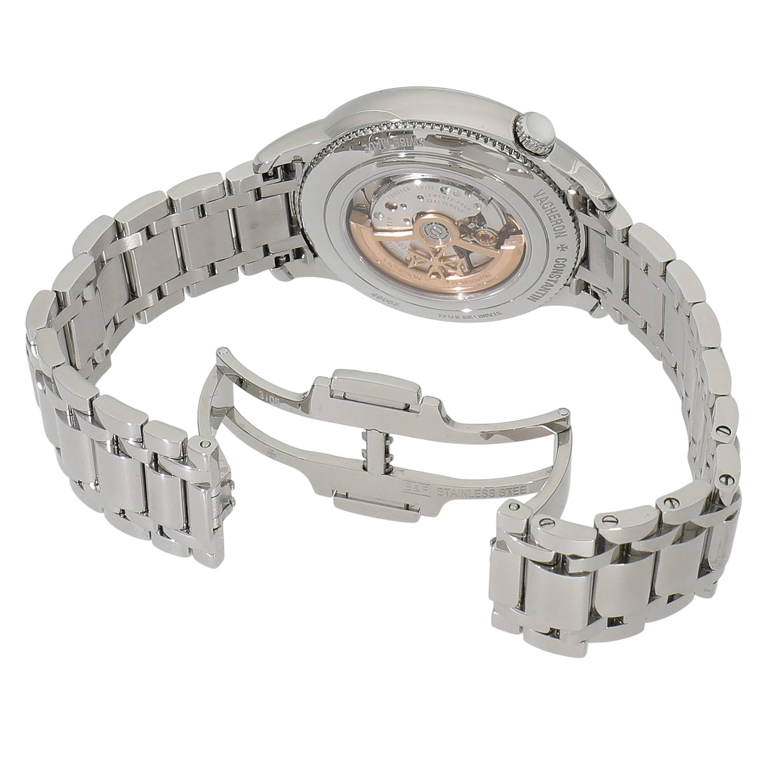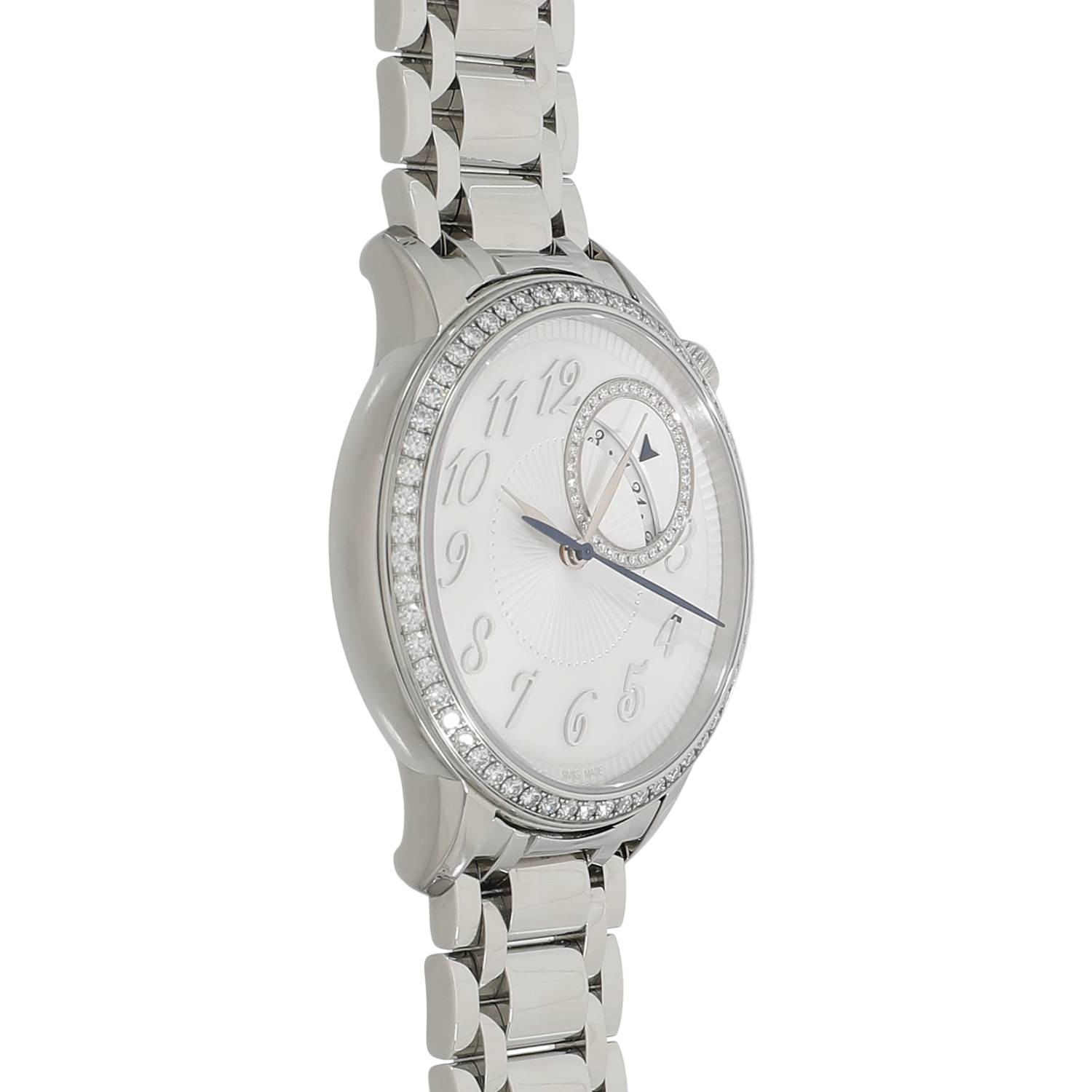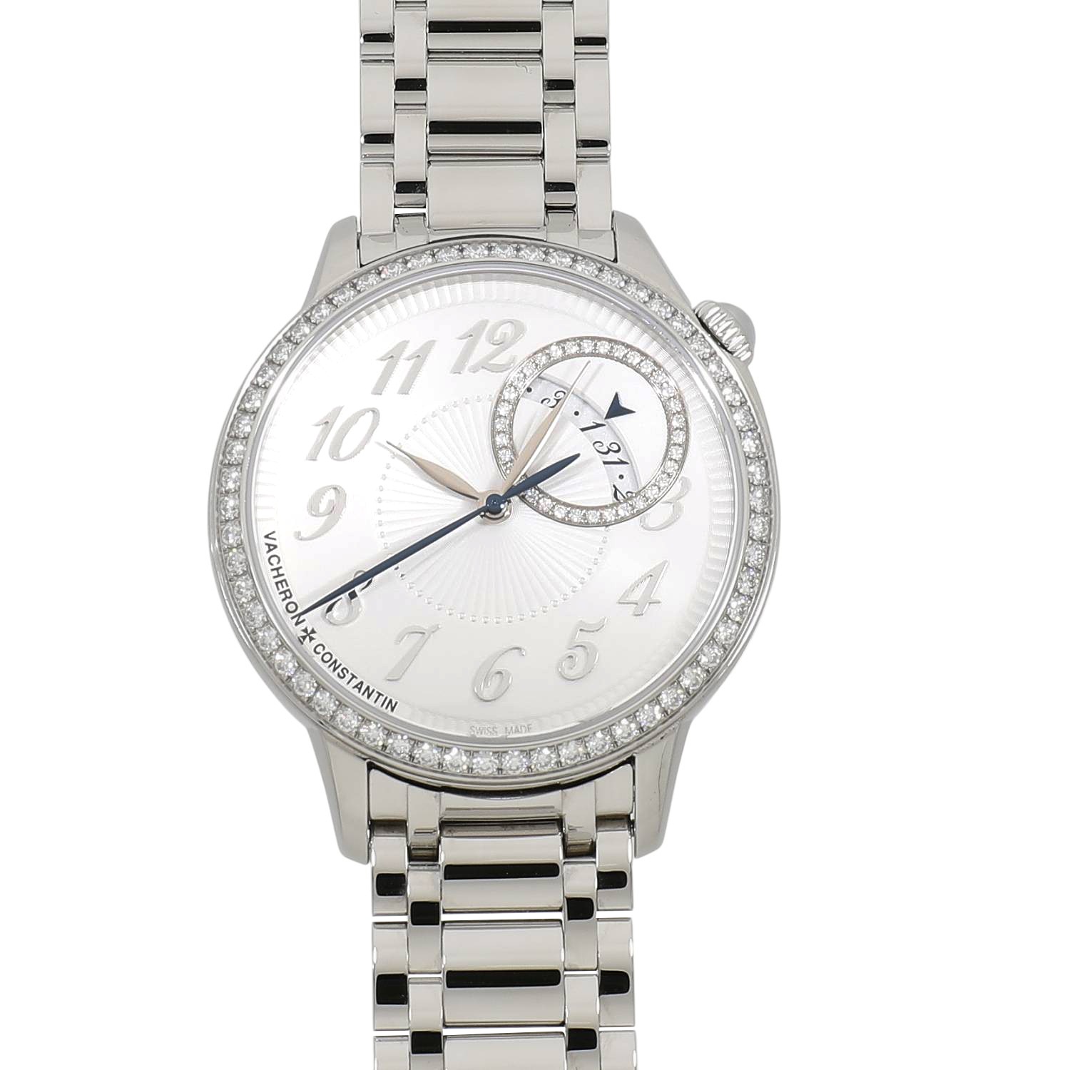 | モデルについて / Features | 老舗メゾンであるヴァシュロンコンスタンタンの新たな女性向けのコレクションとして2020年に展開を開始したエジェリー。オートオルロジュリーとオートクチュールの世界観の融合をコンセプトとしており、洗練されたデザインの美しいレディースウォッチを数多くラインナップしています。シルバーオパーリンカラーの文字盤には、オートクチュールのファブリックを想起させるプリーツ状のモチーフを施し、ベゼルと日付表示の外周部に合計92個のラウンドカットのダイヤモンドをセッティングしたエレガントなレディースウォッチです。1時位置にあるリュウズの先端にはダイヤルのカラーに併せ白いムーンストーンがセットされます。ケースバックはサファイアガラス製のスケルトン仕様となり、40時間のパワーリザーブを備えるヴァシュロンコンスタンタン社製Cal.1088を搭載しています。 |