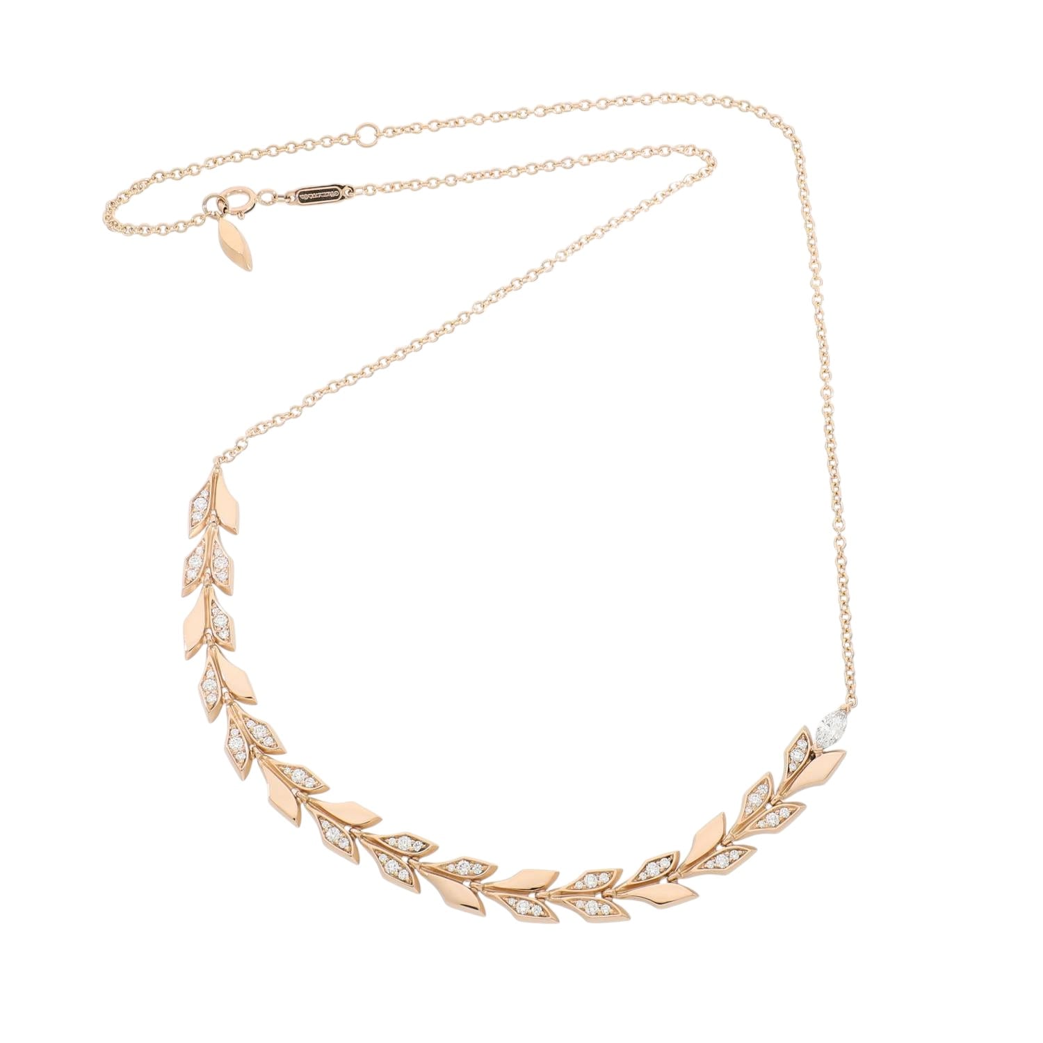 | モデルについて / Features | 壮大な自然界に着想を得て美しい花々、蔓、葉っぱの流れるような躍動感を表現した「ティファニー ビクトリア」。18K ローズゴールドと精巧にカットされたダイヤモンドの組み合わせで作り上げられた、周囲の視線を釘付けにするこのペンダントは、艶やかな光沢のある仕上がりと、サンドブラスト仕上げのコントラストの効いたディテールが印象的なアイテムです。 |