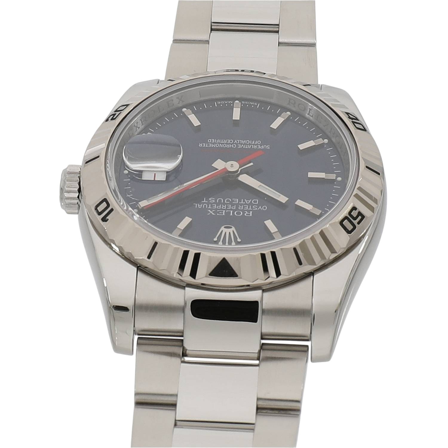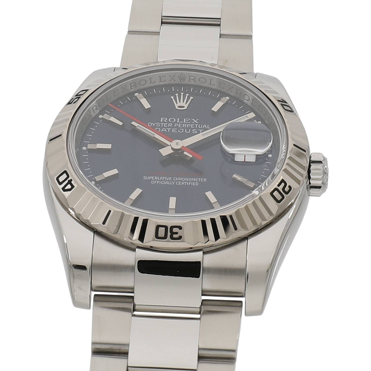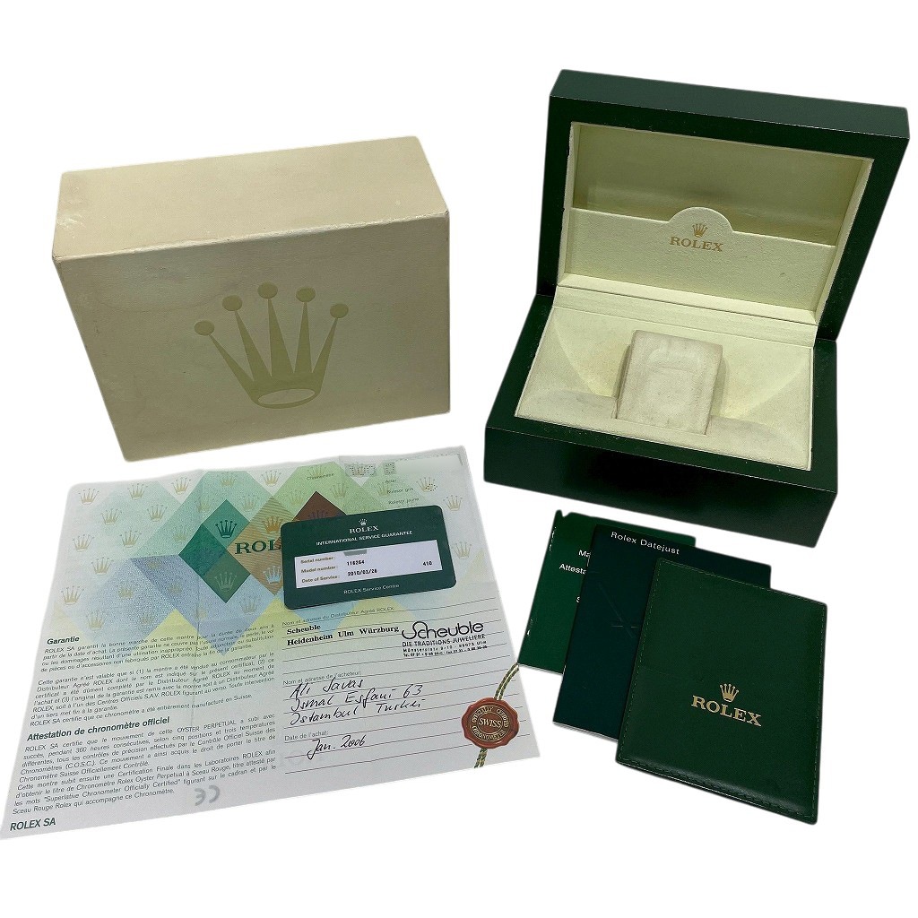 | モデルについて / Features | 初代ターノグラフRef.6202の誕生から、約50年が経過した2004年の新作モデルとして発表されました。デイトジャストをベースとして両方向に回転するホワイトゴールド製のベゼルを備え、サンダーバードの後継機種として誕生します。ベゼルが回転しゼロに戻ることから「turn-O-graph」というモデル名が付けられました。文字盤色のバリエーションも多彩で、ジュビリーとオイスターの2種類のブレスレットを選べる点も魅力です。2013年に生産終了となりましたが、通常のデイトジャストに比べ流通量は少なく、2018年頃からじわじわと価格高騰を始めている人気モデルです。 |