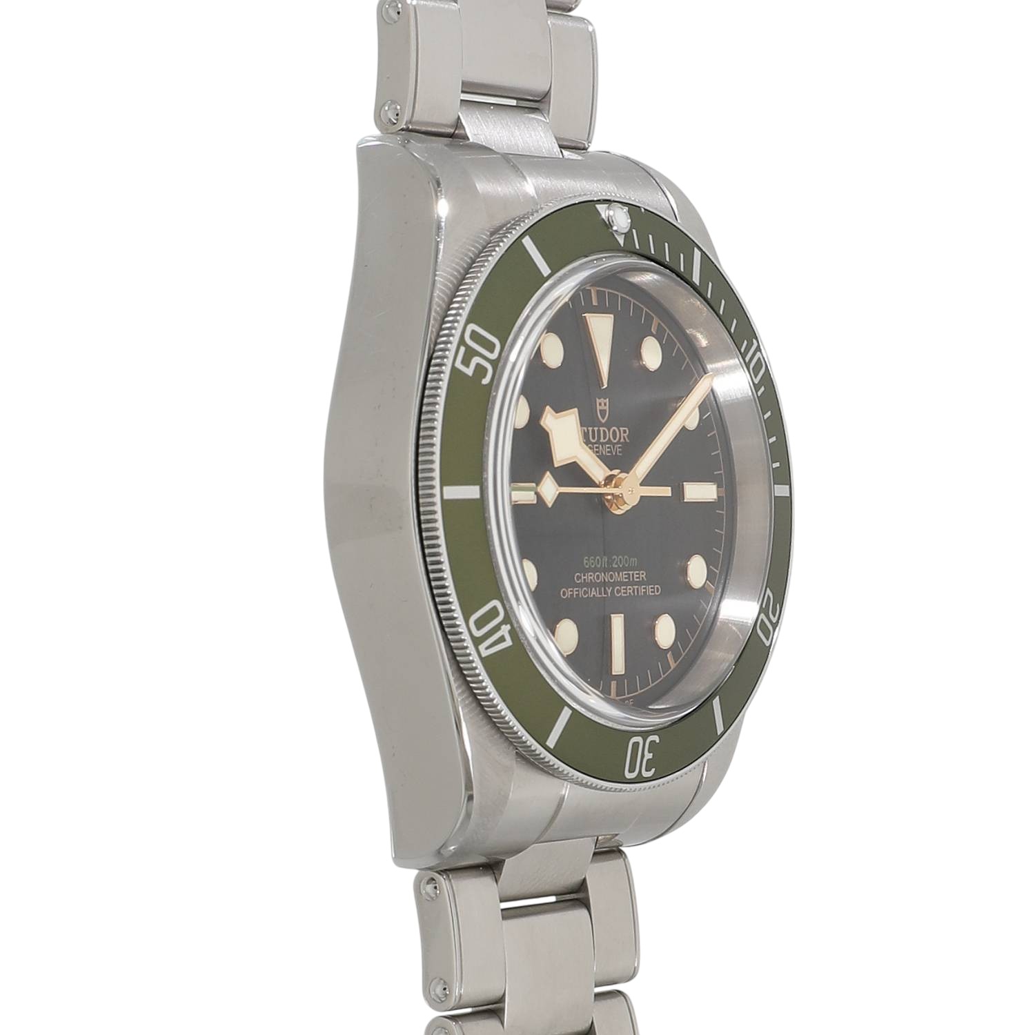 | モデルについて / Features | 1950年代中頃に誕生した、チューダーの初代ダイバーズウォッチRef.7922の意匠を忠実に受け継いで生まれたブラックベイは、今やチューダーを代表するアイコン的コレクションとなりました。初代ダイバーズモデルを彷彿とさせるデザインでありながら、200mの防水性や70時間のパワーリザーブ等、実用性のある作りとなっています。このRef.79230からはブランドロゴが薔薇から盾へと変更され、クロノメーター表記がプリントされるようになりました。またブレスレットもリベットタイプへと変更され、ヴィンテージ感がより濃く演出されています。グリーンのベゼルを纏い2019年の新作とした発表されたこのモデルは、イギリスの老舗高級百貨店ハロッズでのみ販売される希少なコレクションです。 |