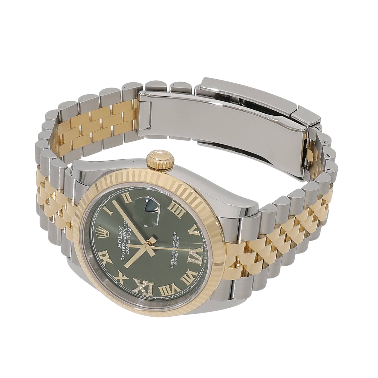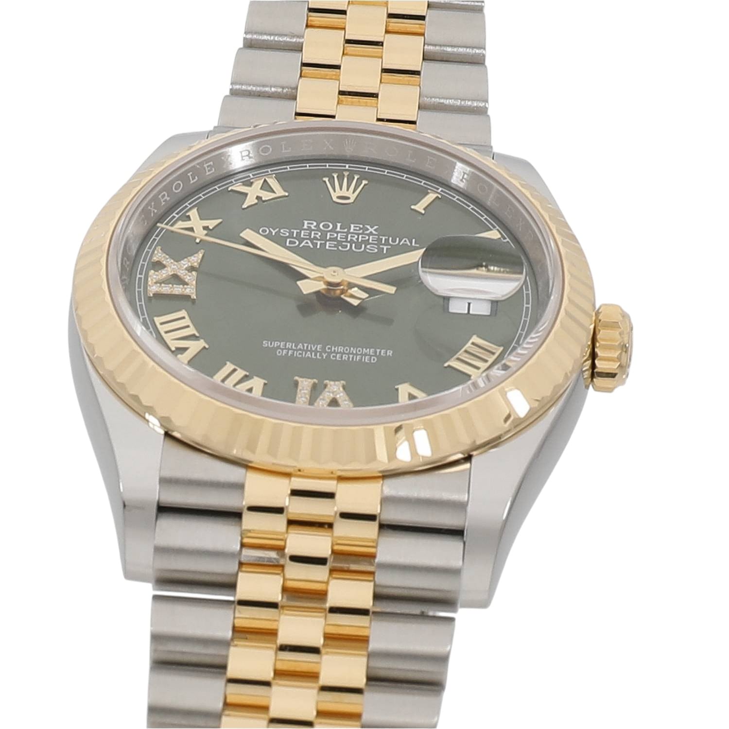 | モデルについて / Features | オイスターケース・パーペチュアル機構・デイトジャスト機構、この3つを集約したスタンダードモデルのデイトジャスト。数あるロレックスのコレクションの中でも、最も素材やサイズなどのバリエーションが豊富にラインナップされています。2018年に発表されたデイトジャストは、パワーリザーブを70時間まで延長し、日付変更の禁止時間帯を無くすなど、様々な改良が加えられた新型Cal.3235を搭載しています。6時と9時位置のローマンインデックスにはダイヤモンドがセットされており、エレガントさが際立っております。 |