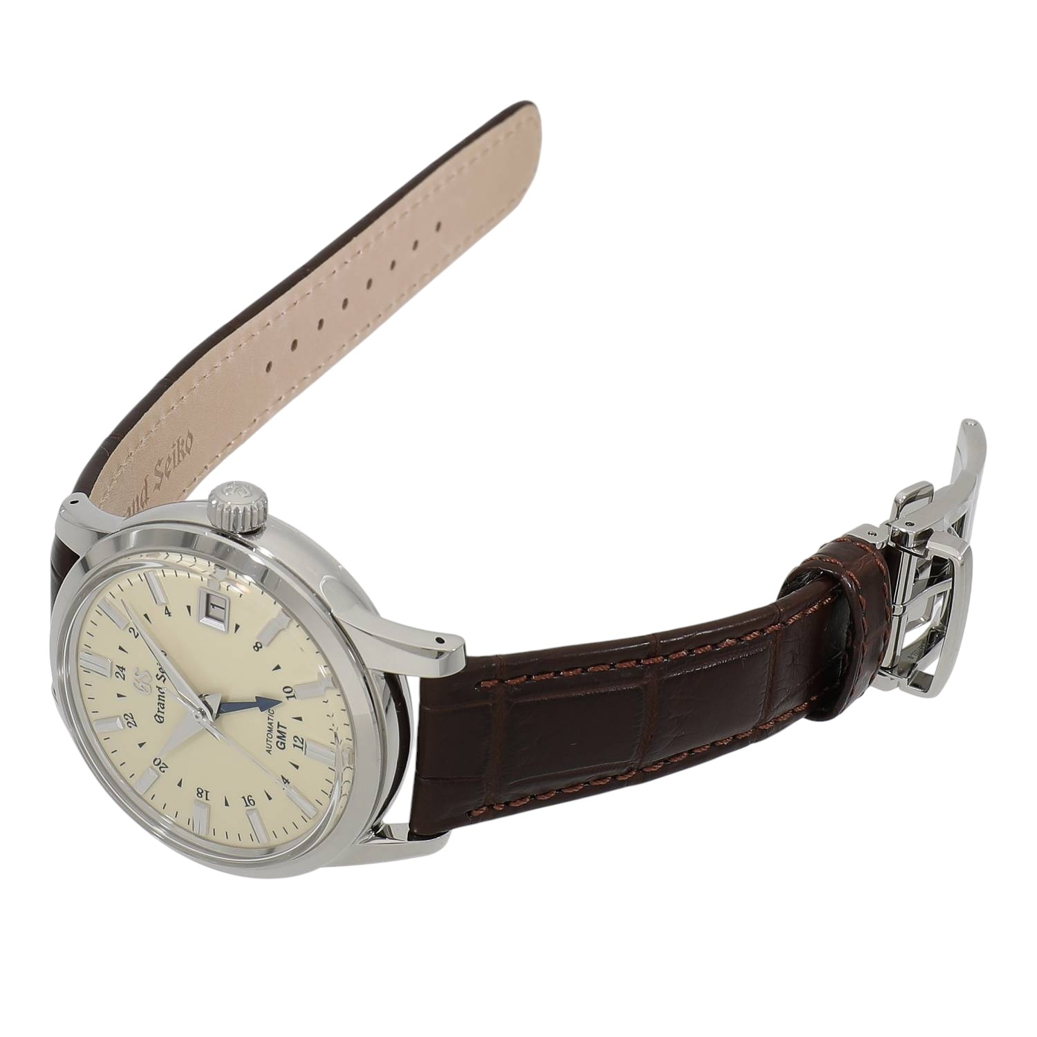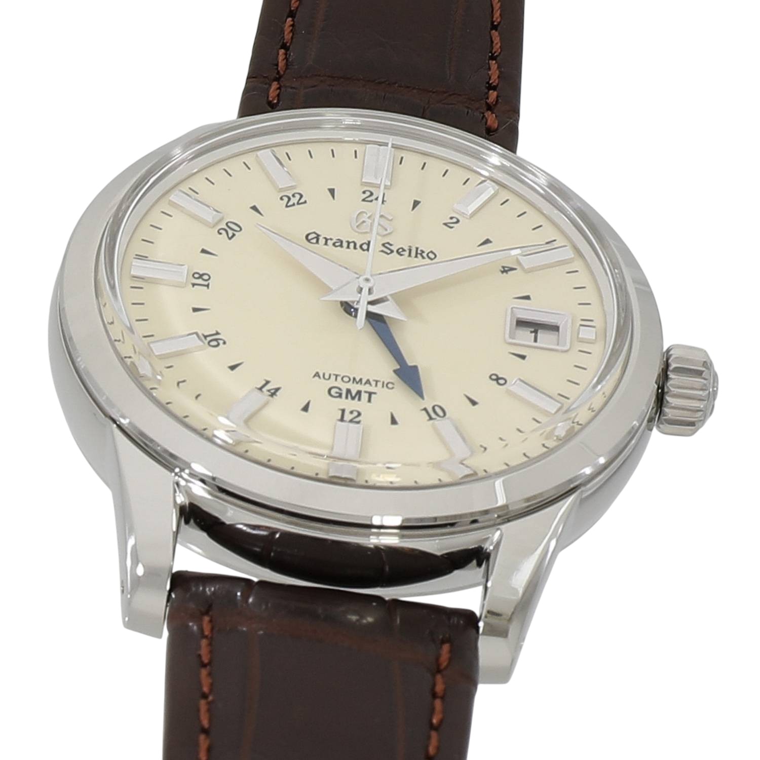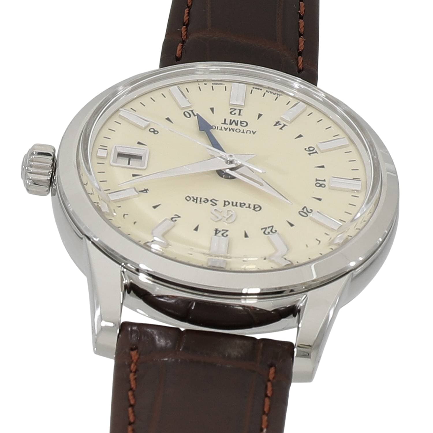 | モデルについて / Features | 1960年に初代モデルが誕生したグランドセイコーは、世界に誇るメイドインジャパンの高級ウォッチブランドの代表格と言えます。GMT機能と3日間のパワーリザーブを備えるキャリバー9S66を搭載しており、2か国の時間を同時に読み取る事が出来ます。上品さと優雅さを兼ね備えるエレガンスコレクションにラインナップされ、クラシカルな趣を感じさせるボックス型のサファイアガラス、艶やかなアイボリーダイヤルに青焼きされた24時間針など、随所にデザイナーの拘りが見て取れます。文字盤色のバリエーションが多いこのGMTモデルは、国内外問わず人気の高いコレクションです。 |