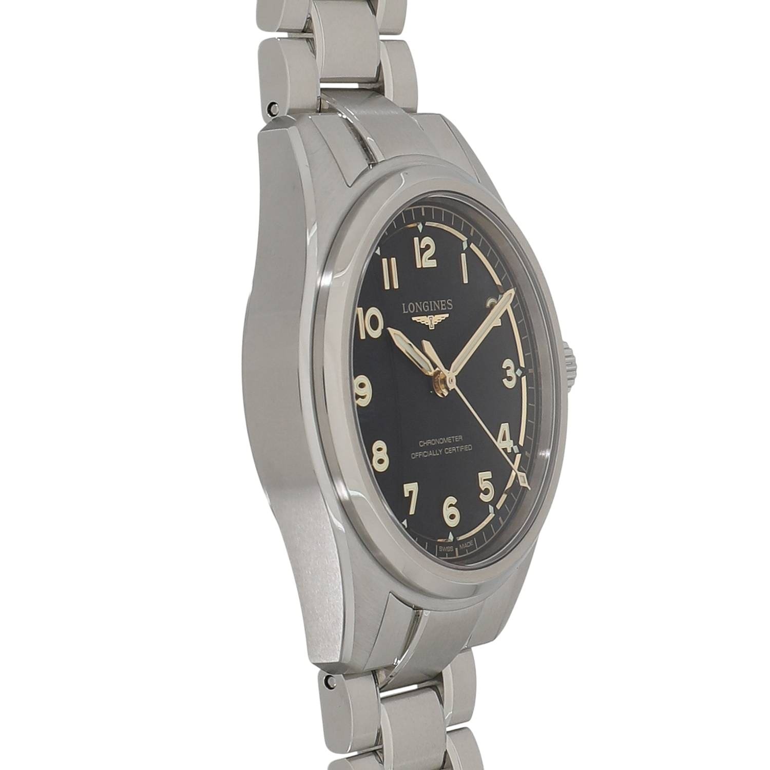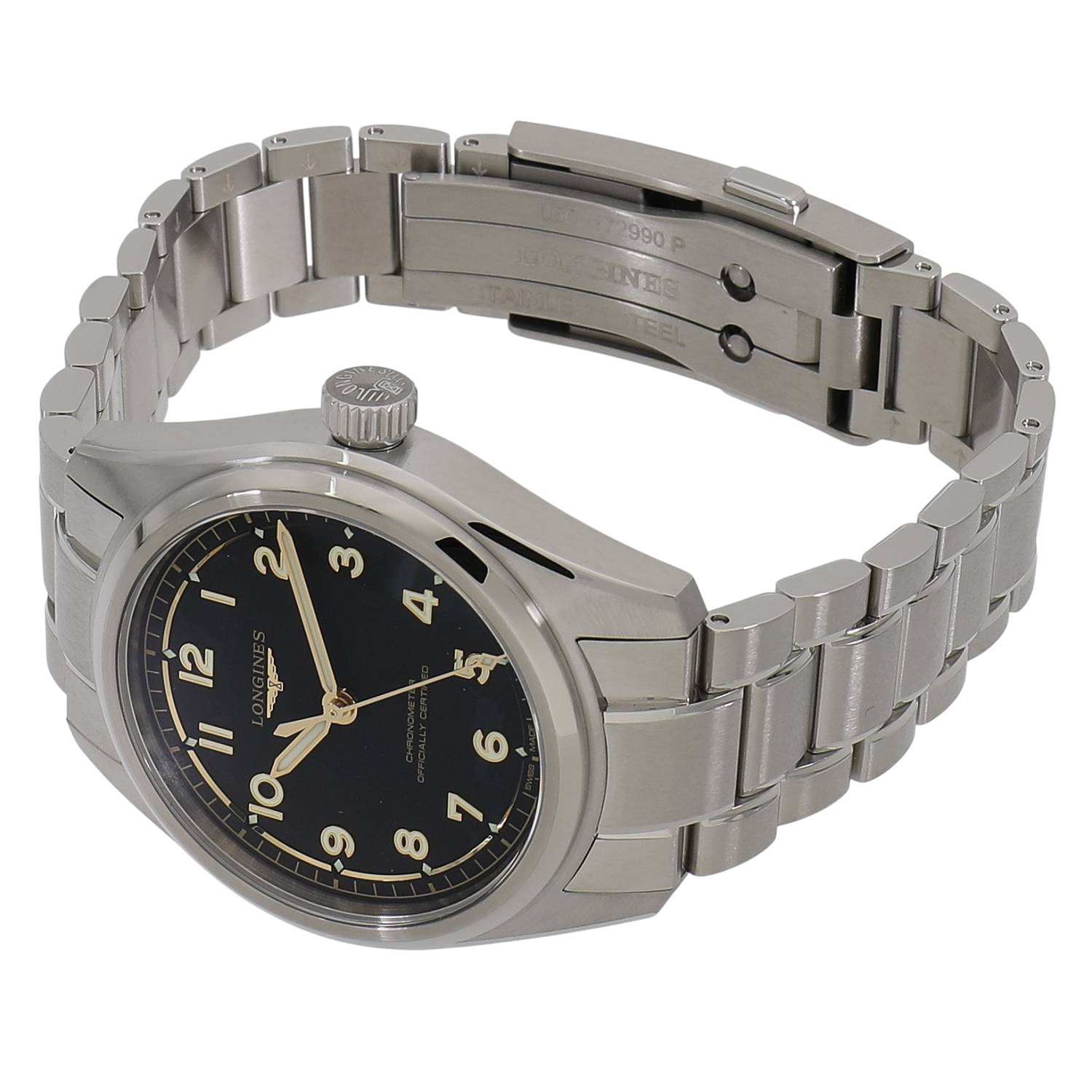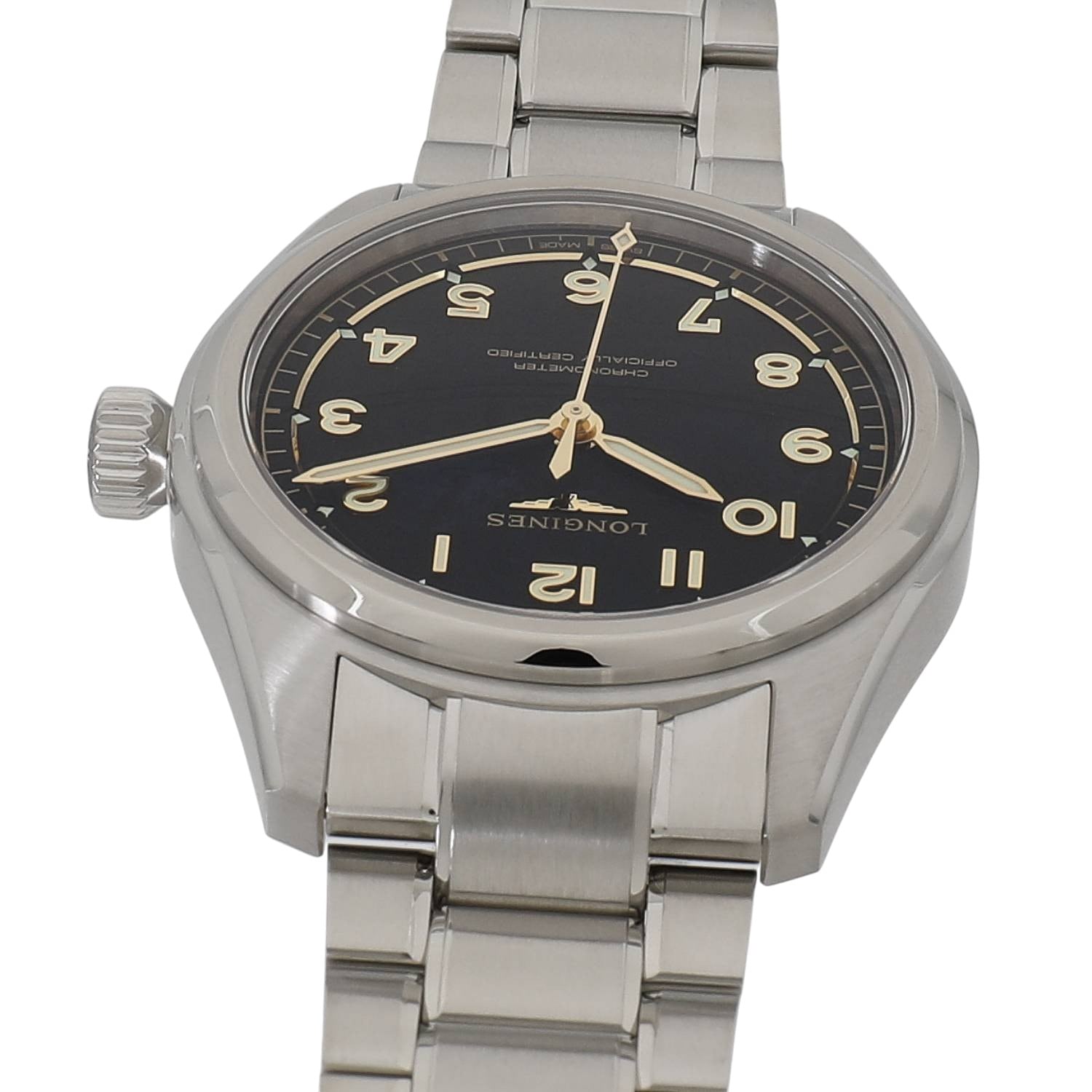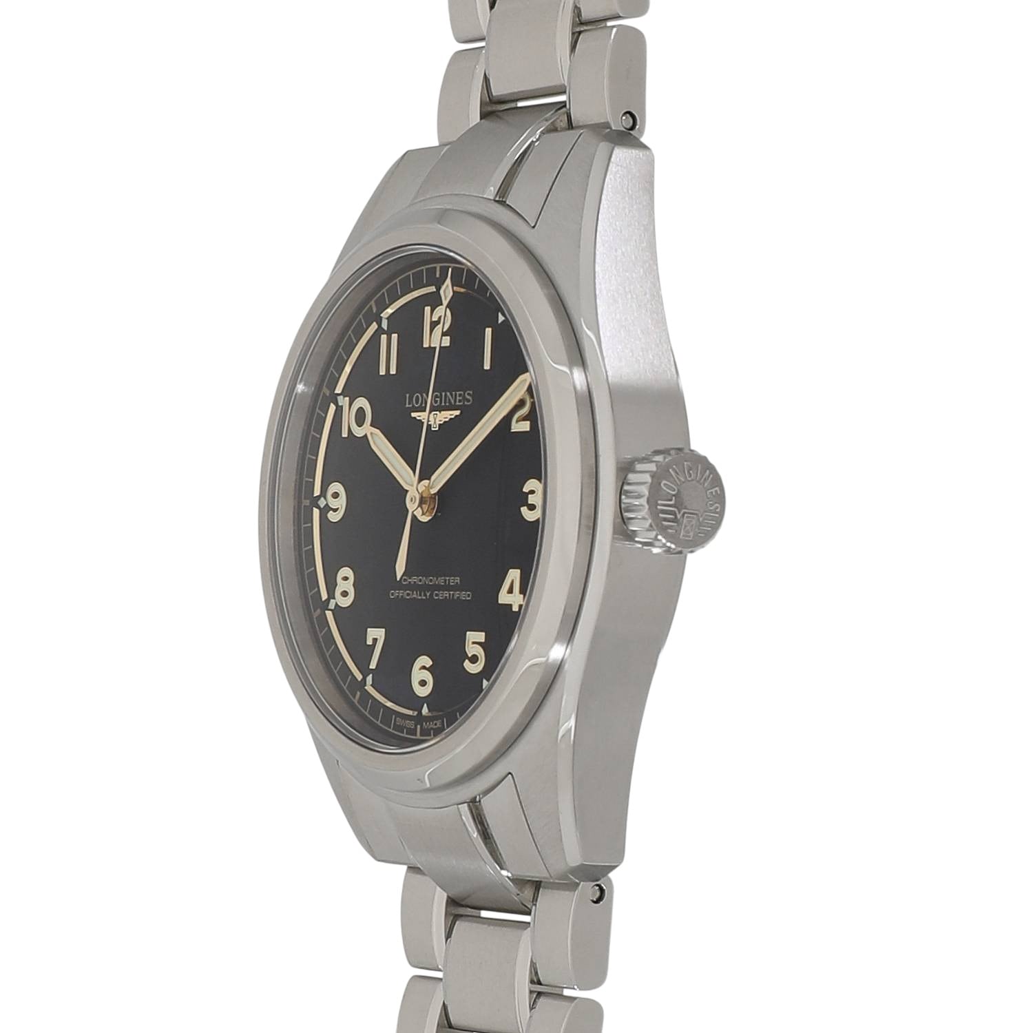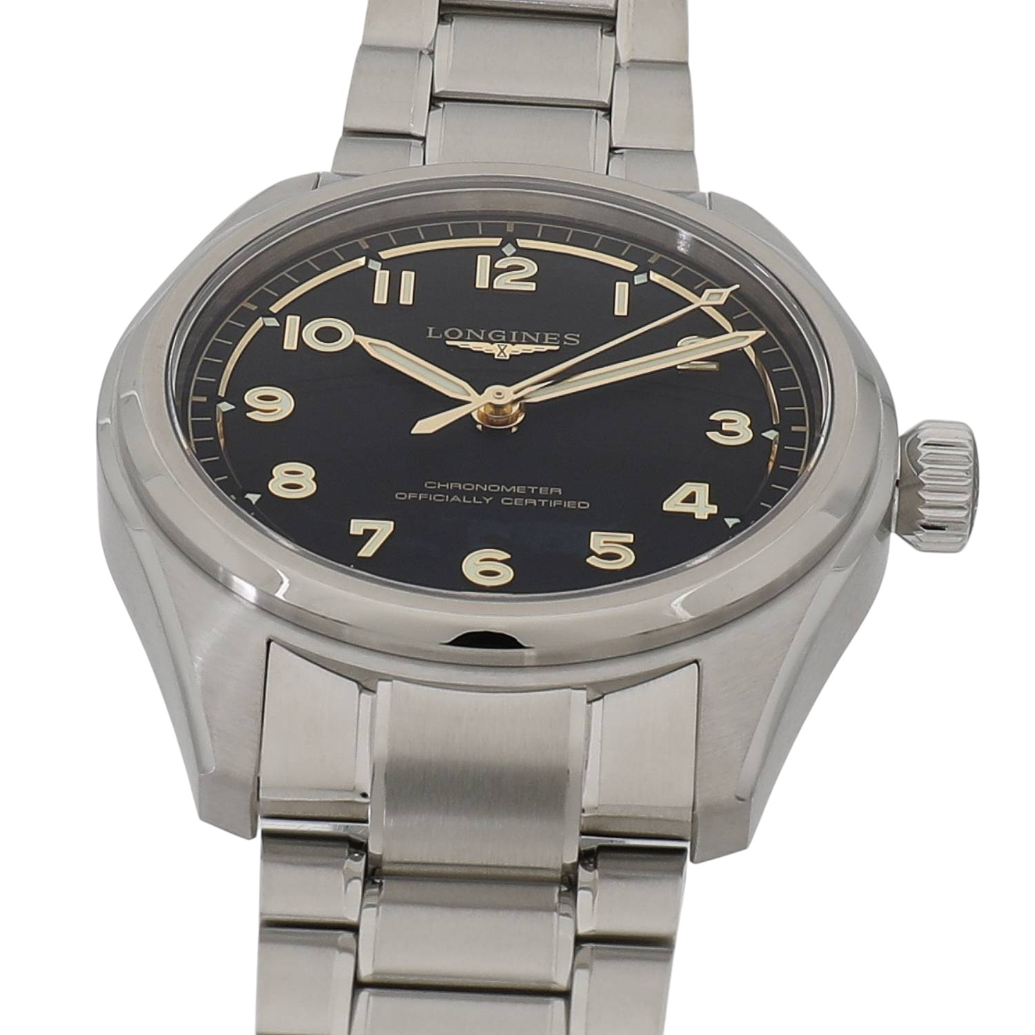 | モデルについて / Features | 2025年の新作 「ロンジン スピリット」コレクションのルーツである、航空技術を忠実に再現した流線型の 3 針モデル「ロンジン スピリット パイロット」。オリジナルの「スピリット」3 針モデルにあった5つ星と日付表示をとり、マットブラックの文字盤にゴールドカラーの針とアプライドのアラビア数字を合わせは印象的で、あらゆるコンディションでの視認性を実現しました。ヴィンテージの魅力も感じられます。ロンジン独自のキャリバーL888.4を搭載し、約 72 時間のパワーリザーブを備えています。 |