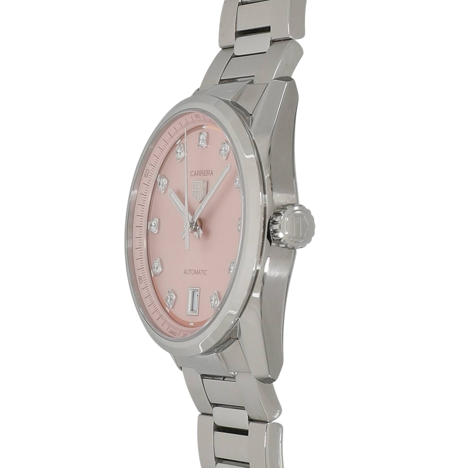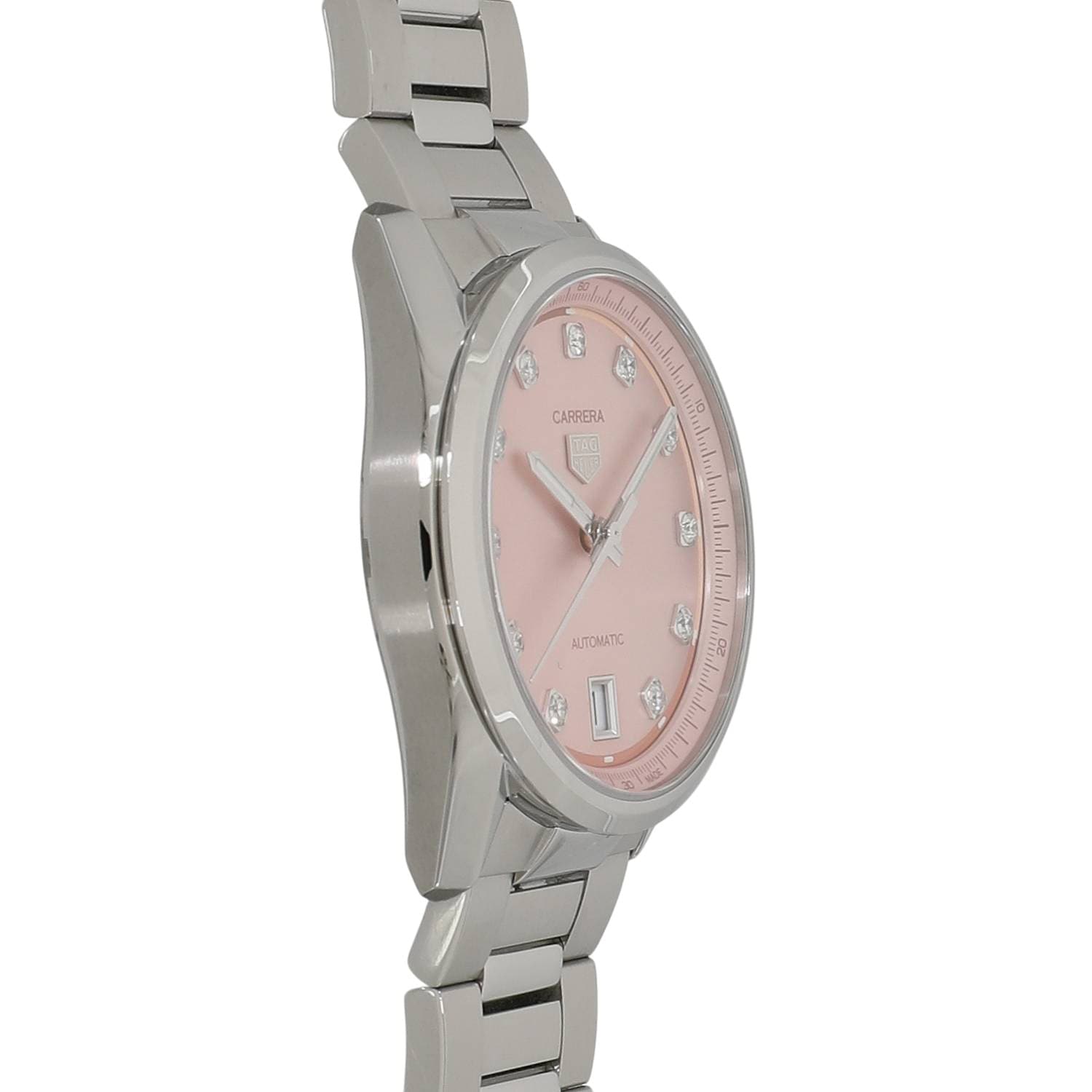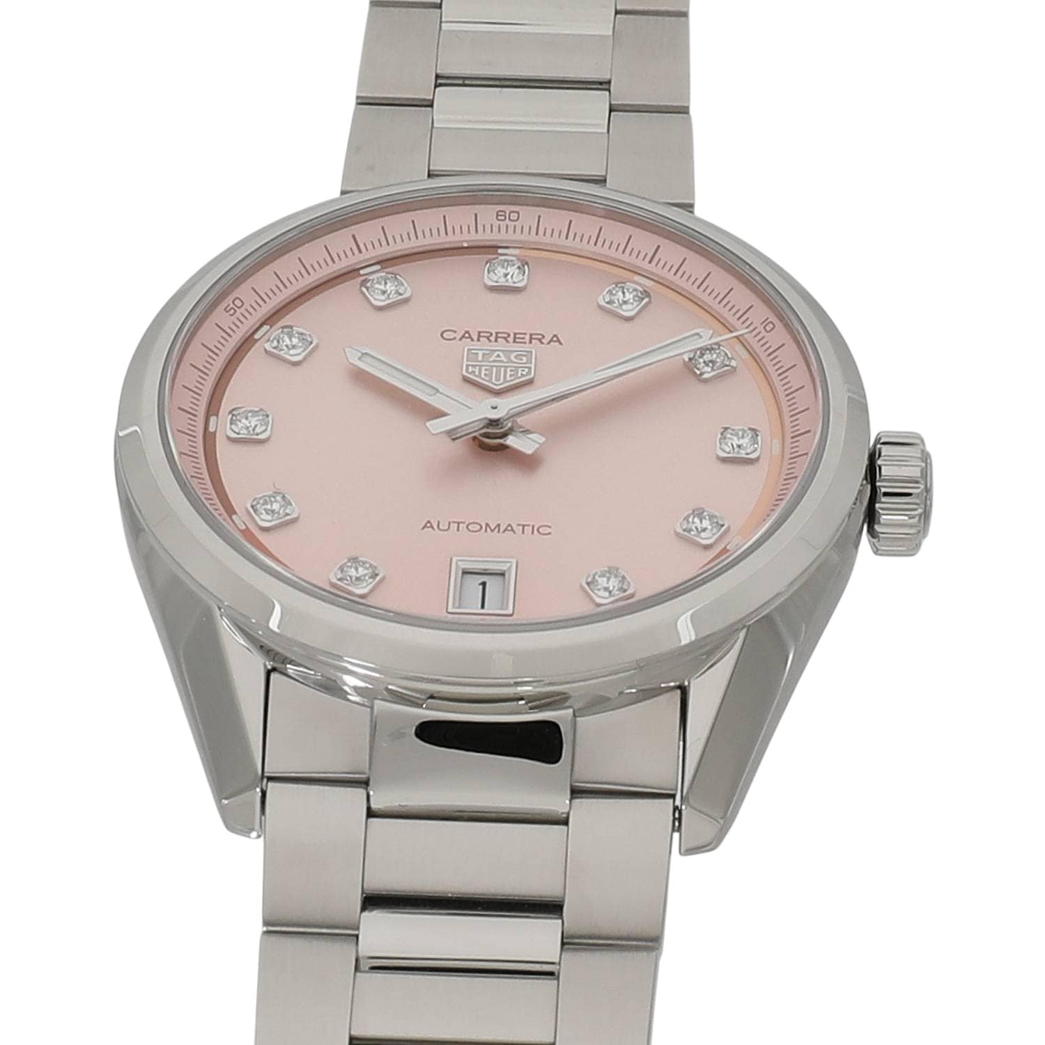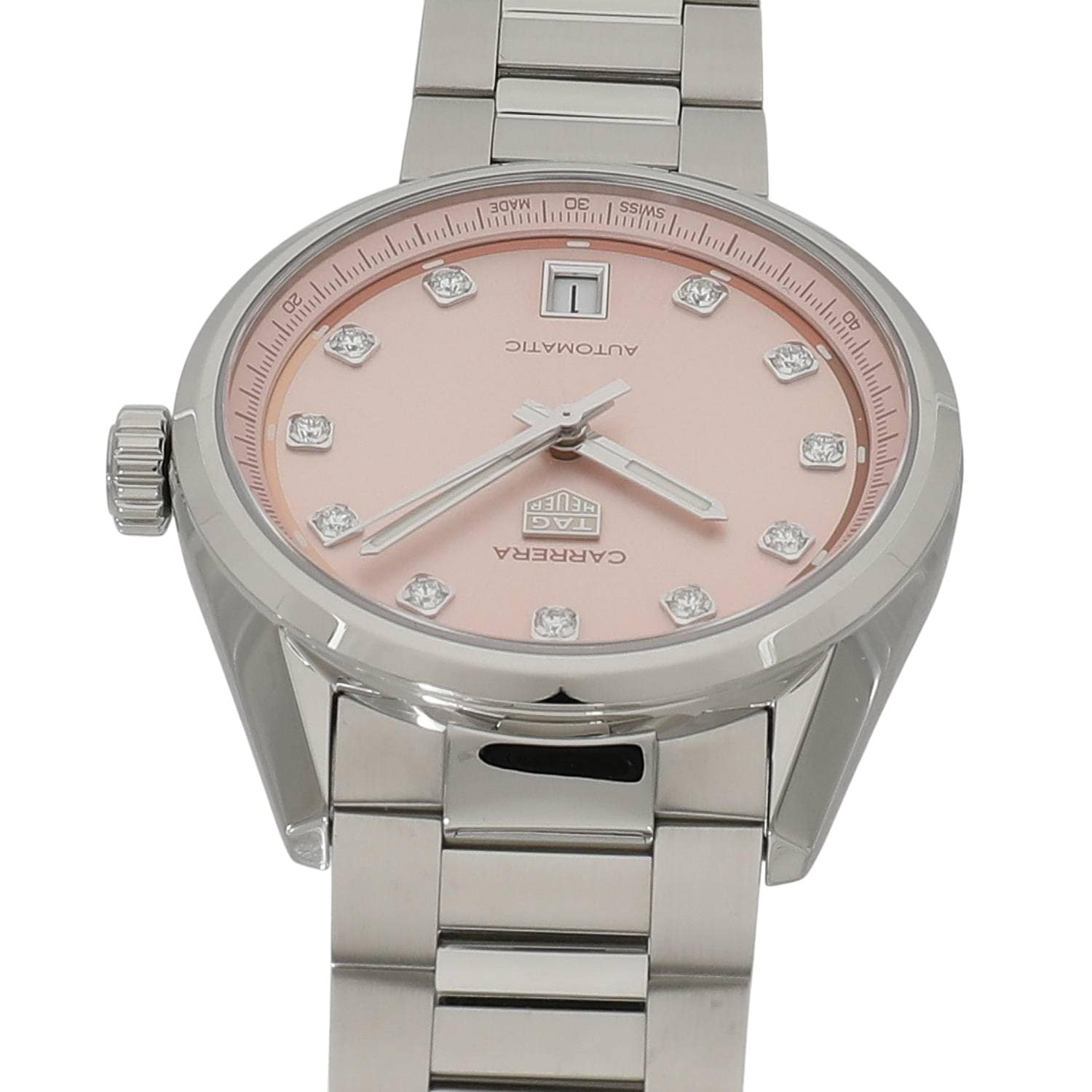 | モデルについて / Features | 2025年の新作 モータースポーツにインスピレーションを受けてデザインされスポーティーさが人気のカレラ。カレラのDNAを受け継ぎながらエレガントさも兼ね備えるデザインです。ポリッシュ仕上げとヘアライン仕上げが施されたケースは薄くなり、ブレスレットも薄く滑らかとなり装着感が向上しました。シンプルにデイト表示のみを備えております。サンレイ仕上げが施された淡いピンクカラーのダイヤルのインデックスには、11個のダイヤモンドがセッティングされています。鮮やかさが目を惹きます。ケース径は36ミリと絶妙で、男女兼用でお使い頂けるサイズ感です。 |