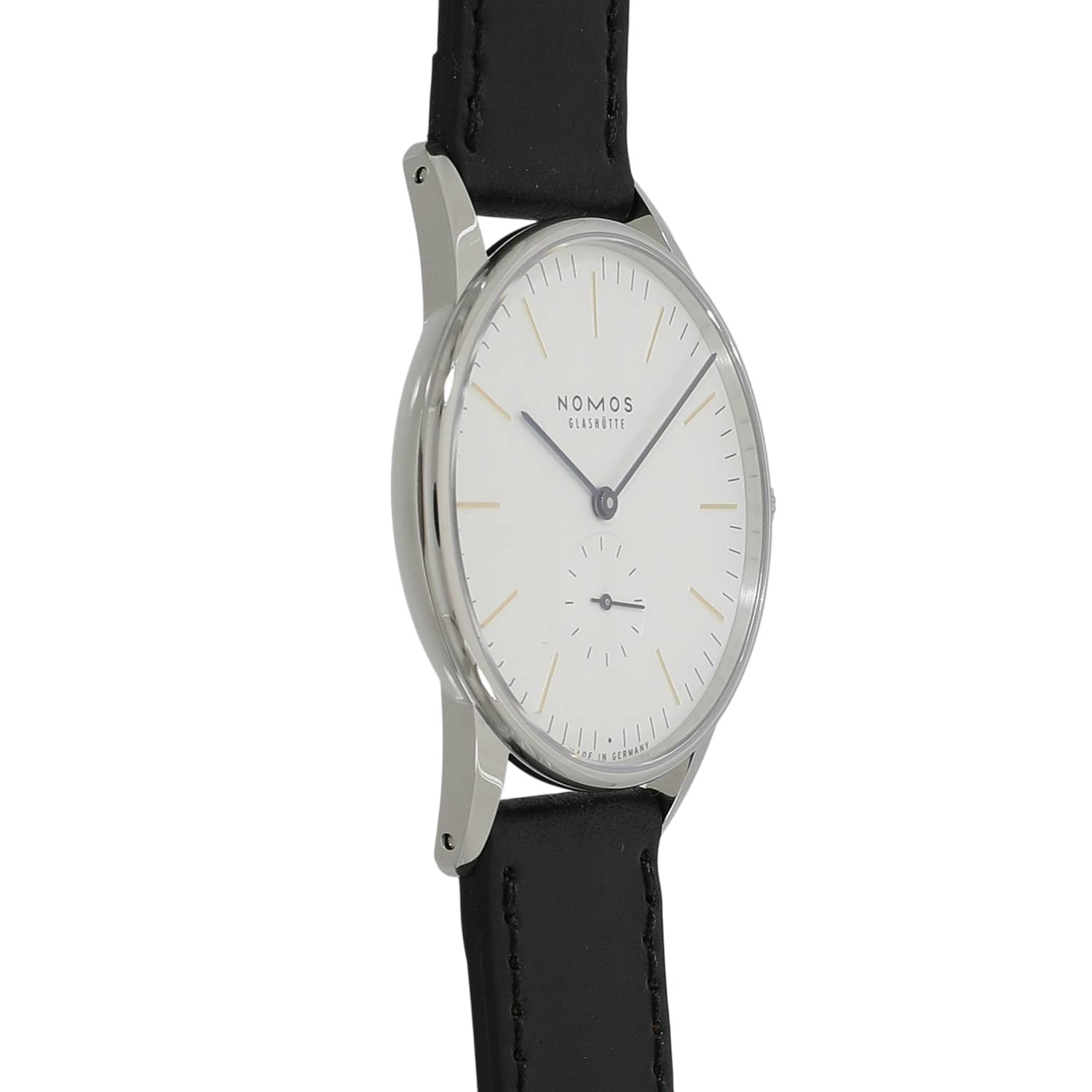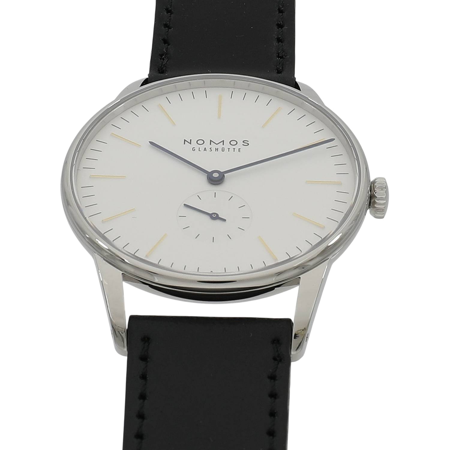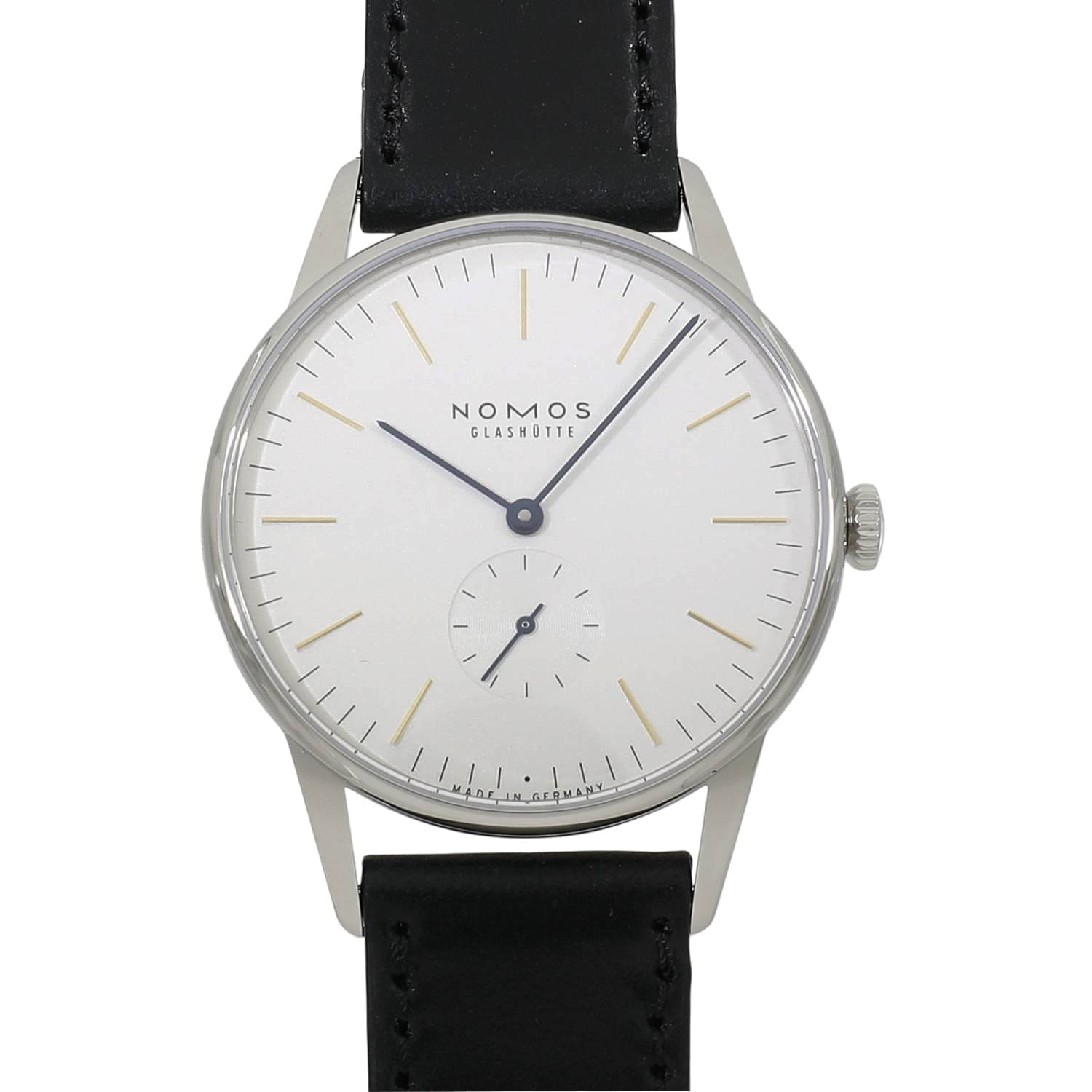 | モデルについて / Features | ドイツの時計製造の街として有名なグラスヒュッテに1990年に創業したノモス。ドイツ発祥のバウハウスの流れを組むデザインが特徴的で、極めてシンプルでありながら美しいモデルが多数展開されるブランドです。オリオンは、グラスヒュッテの夜空に輝く星の様なタイムピースをイメージしデザインされました。白銀仕上げが施されたシルバー文字盤のインデックスはゴールド、長短針と秒針はモデル名の通り青焼きされたブルースチール針を採用しています。38ミリケースのケースバックは、ドーム型のサファイアガラスを備えるスケルトン式となっており、美しい仕上げが施された手巻き式キャリバーアルファの精緻な造りと動きを見る事が出来ます。 |