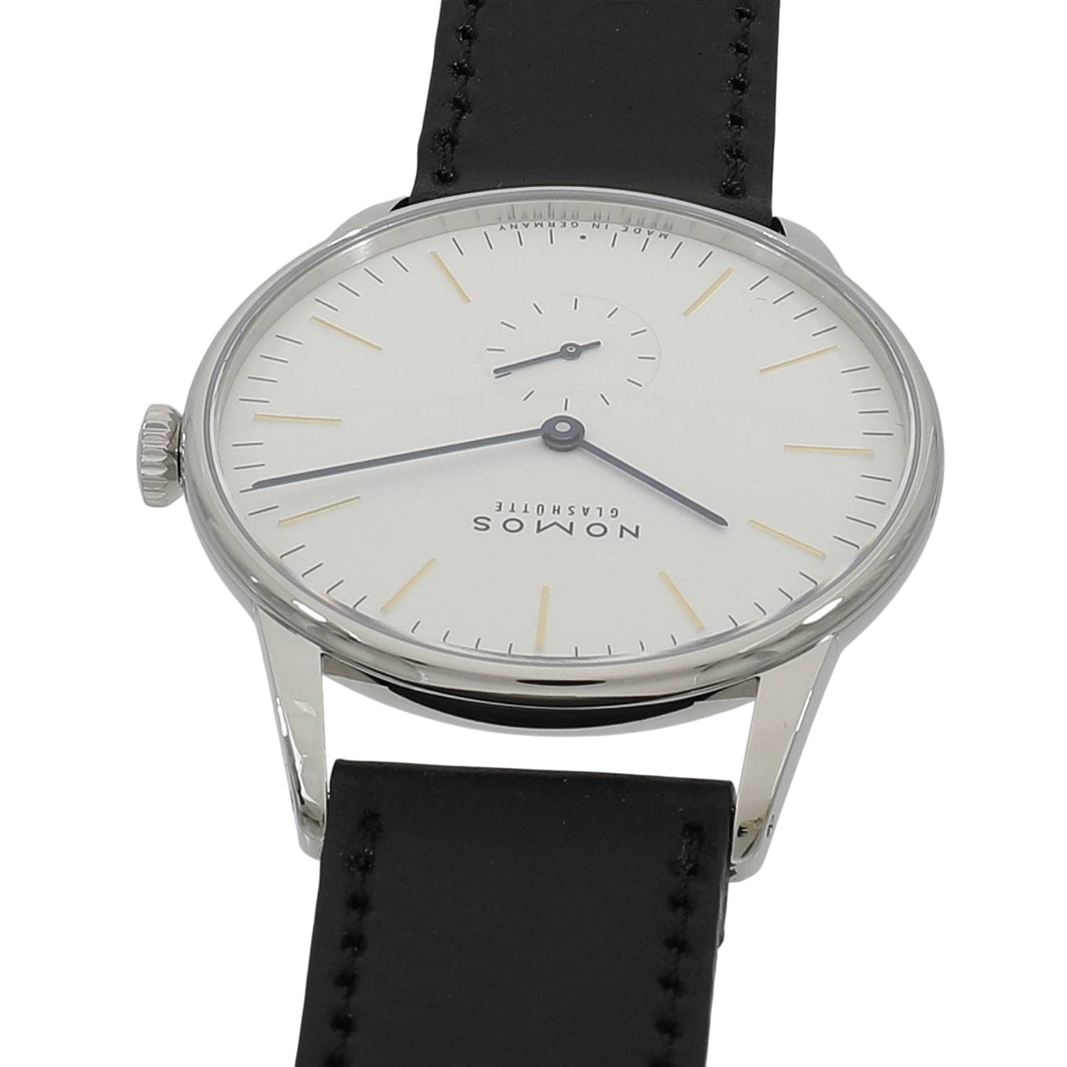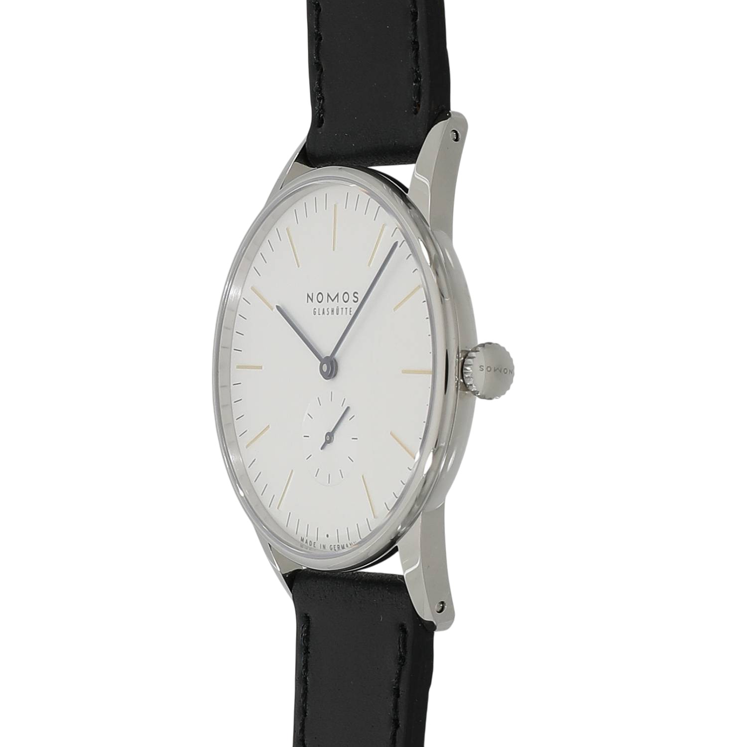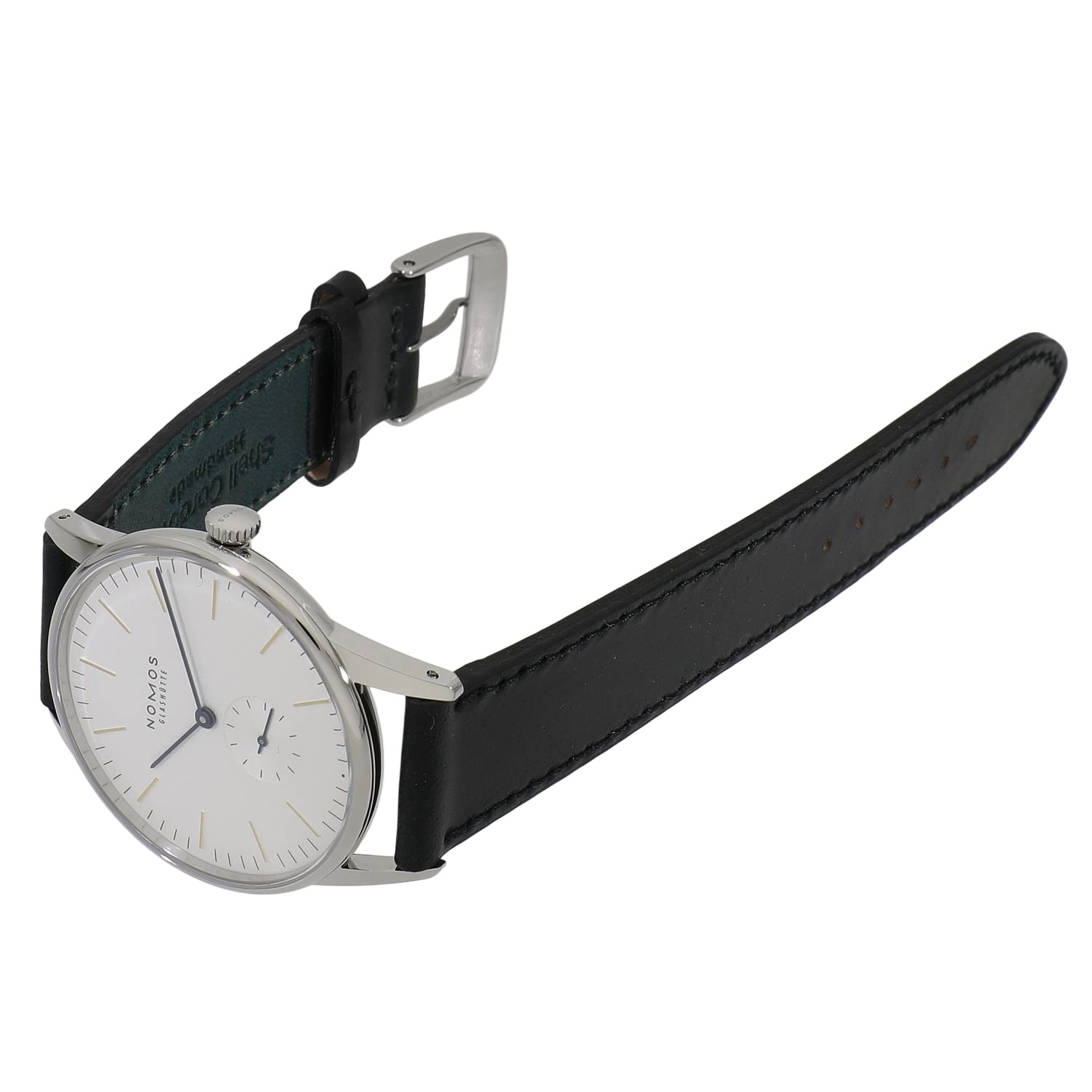 | モデルについて / Features | ドイツの時計製造の街として有名なグラスヒュッテに1990年に創業したノモス。ドイツ発祥のバウハウスの流れを組むデザインが特徴的で、極めてシンプルでありながら美しいモデルが多数展開されるブランドです。オリオンは、グラスヒュッテの夜空に輝く星の様なタイムピースをイメージしデザインされました。白銀仕上げが施されたシルバー文字盤のインデックスはゴールド、長短針と秒針はモデル名の通り青焼きされたブルースチール針を採用しています。38ミリケースのケースバックは、ドーム型のサファイアガラスを備えるスケルトン式となっており、美しい仕上げが施された手巻き式キャリバーアルファの精緻な造りと動きを見る事が出来ます。 |