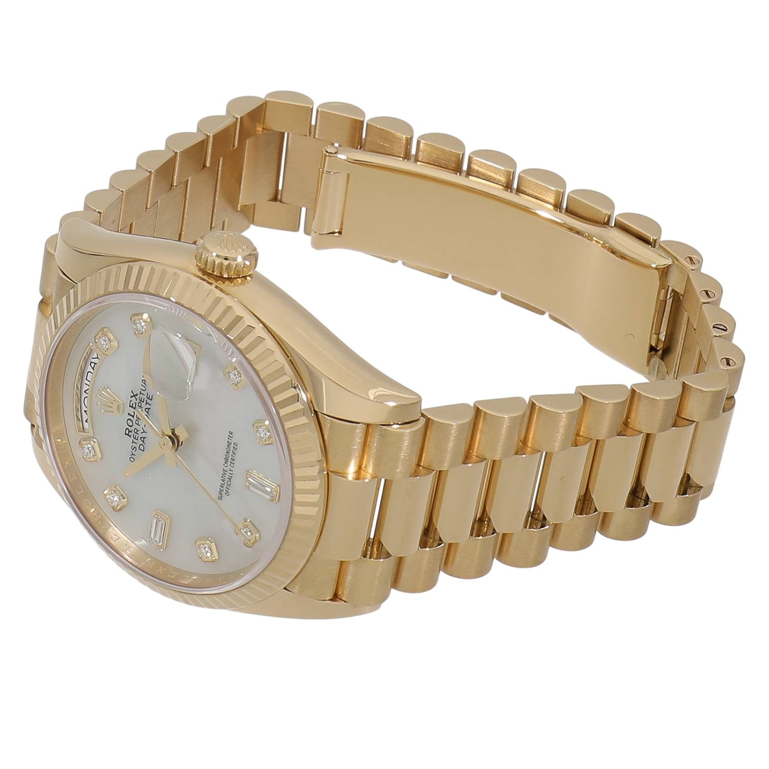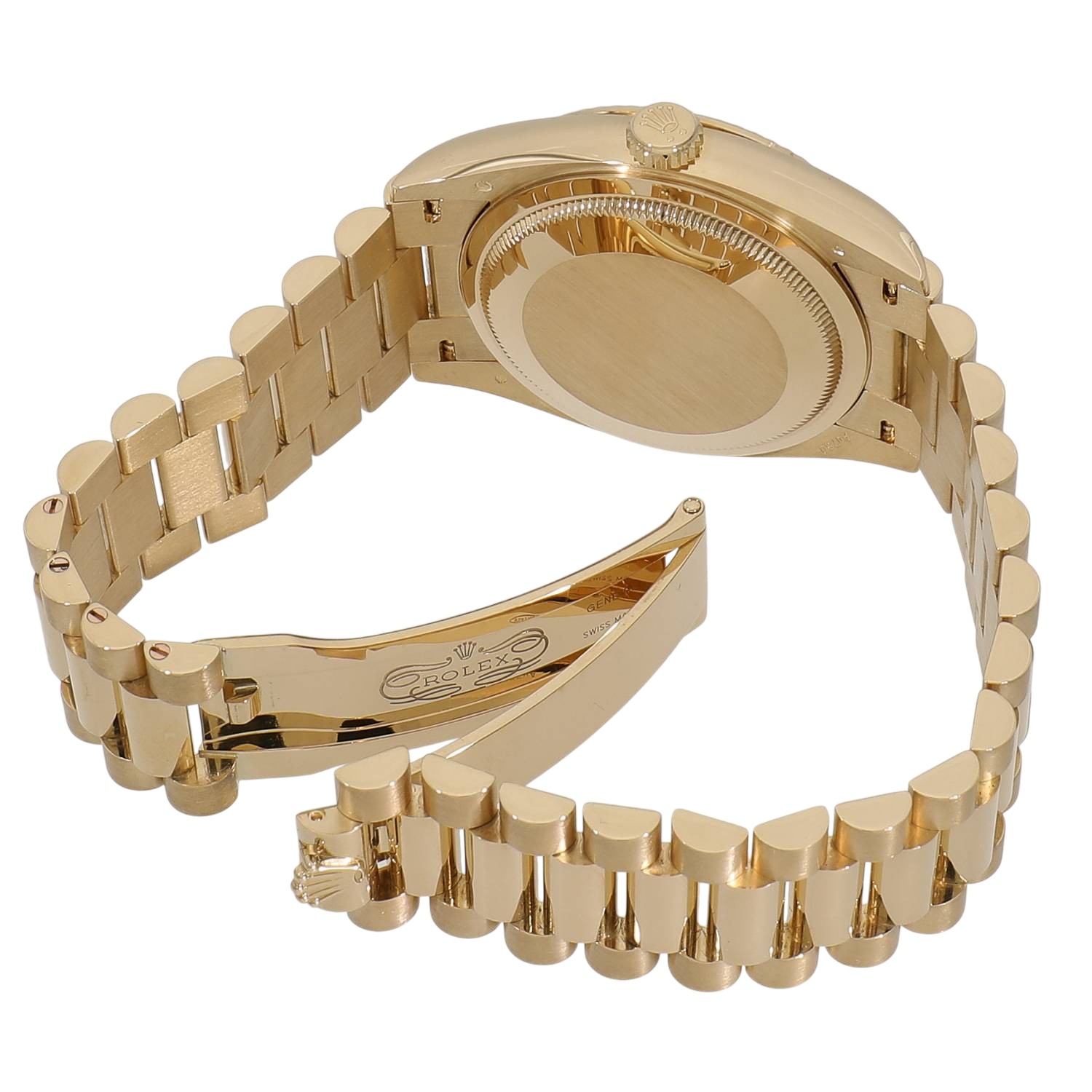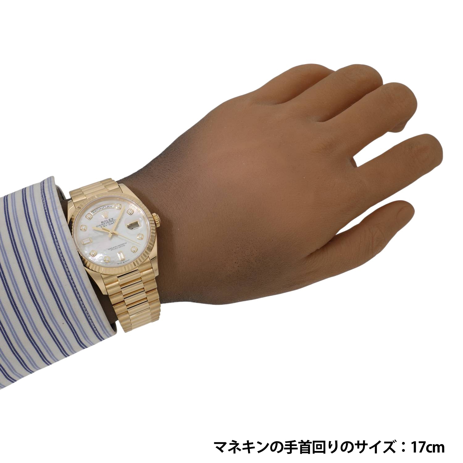 | モデルについて / Features | 1956年に初代が誕生したデイデイト。ゴールドとプラチナ素材のみが採用されるデイデイトは、数あるロレックスのカテゴリーに於いて常に最上位に君臨し続けており、ラグジュアリーな雰囲気を感じさせるプレステ-ジ性の高いコレクションです。3時位置には日付(デイト)表示、12時位置にはフルスペルの曜日(曜日)表示を備え、デイリーユースに大変便利で実用性に優れます。デイデイトのみに採用されるプレジデントブレスレットというネーミングは、アメリカのアイゼンハワー大統領にプレゼントされた事が由来とされています。 |