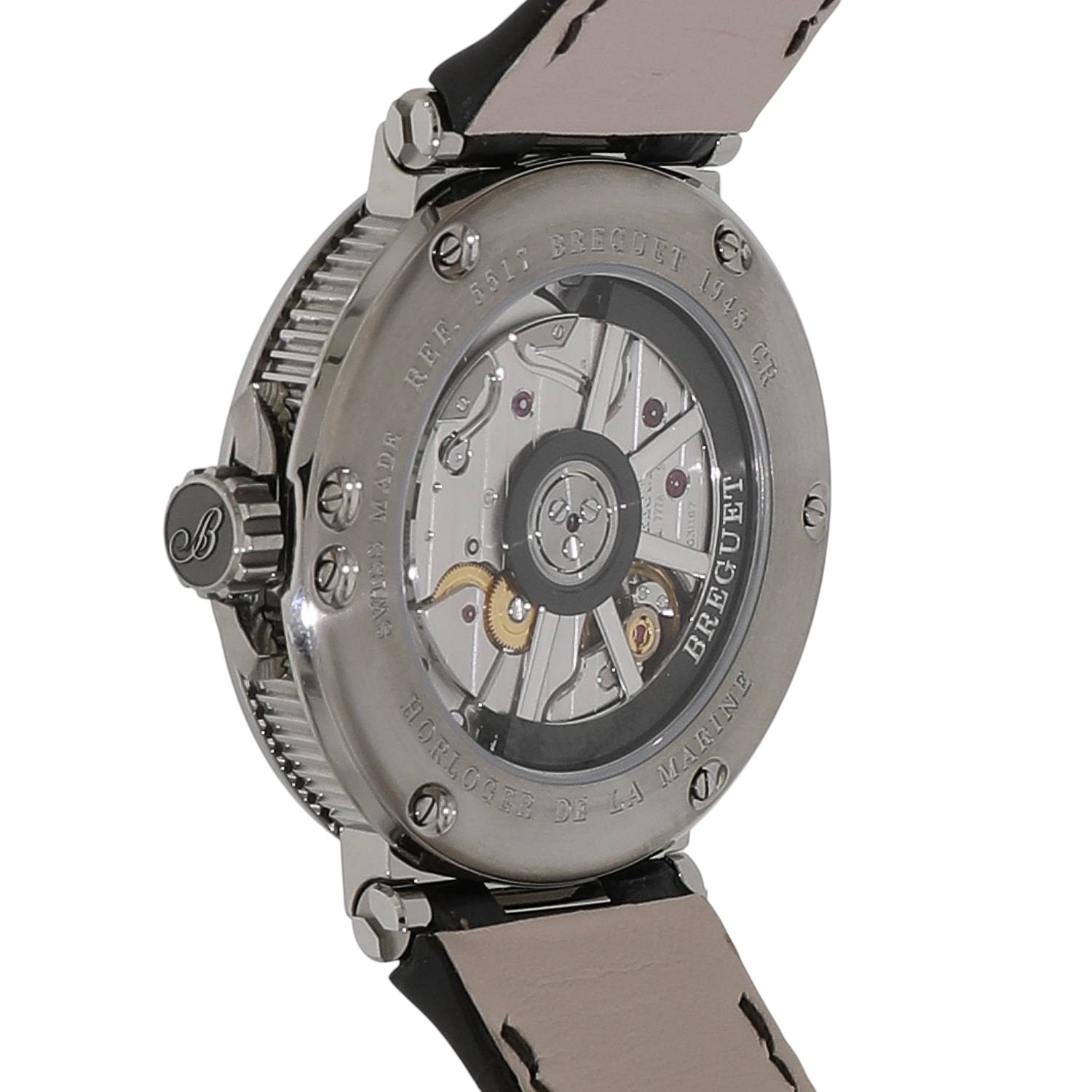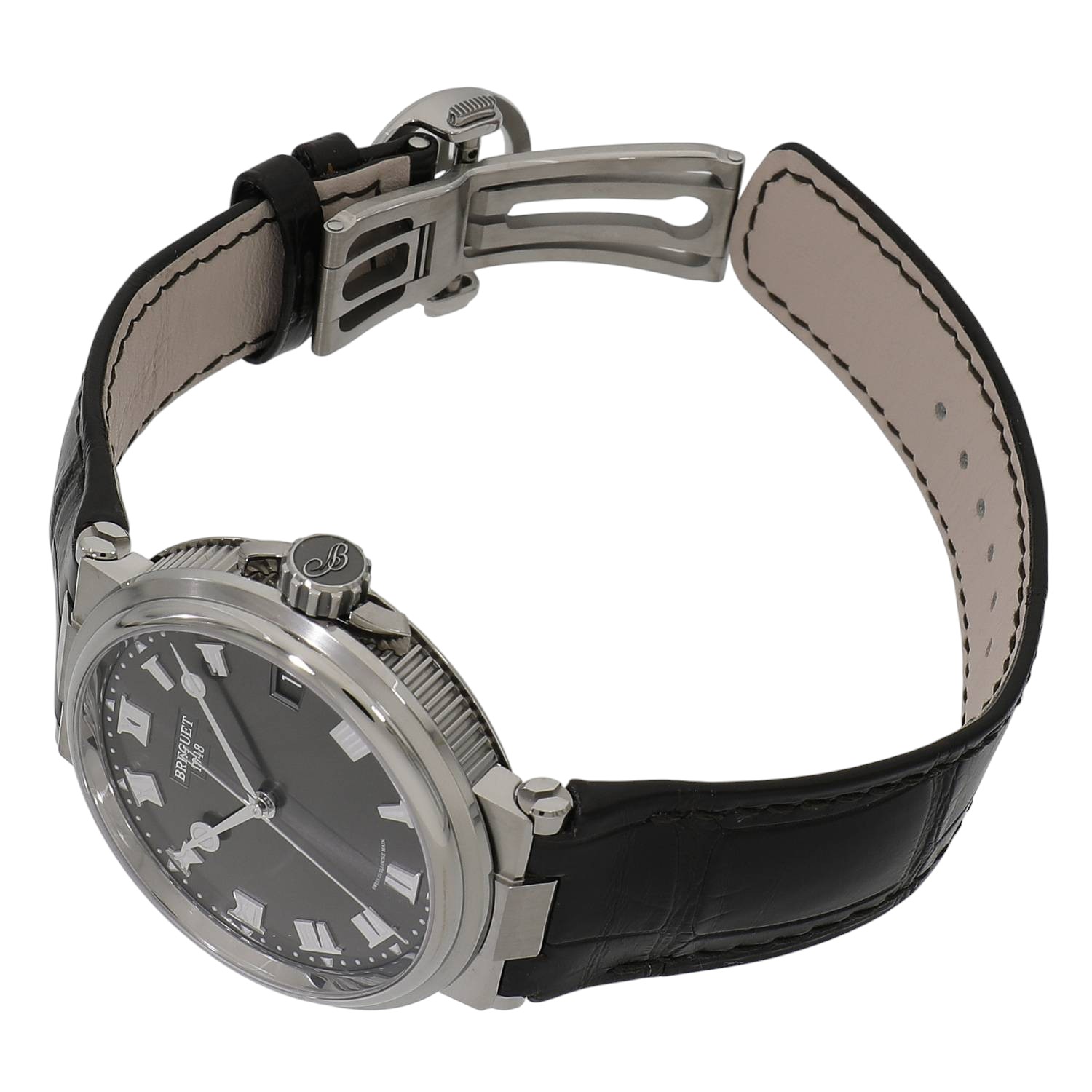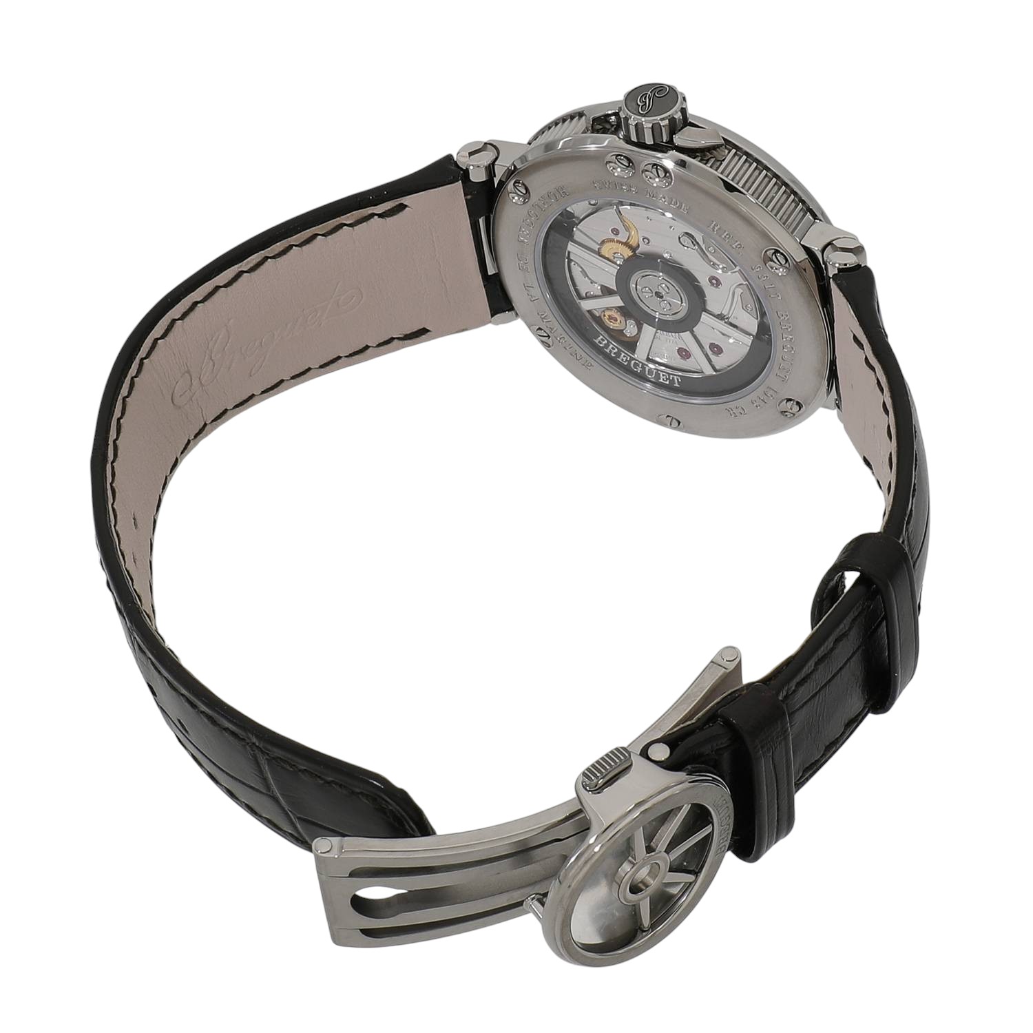 | モデルについて / Features | ブレゲの人気コレクション「マリーン」。こちらのモデルは軽量で腐食に強いチタンを採用しており、軽やかな着け心地です。秒針の末端には国際海洋信号旗の「B」のモチーフがあしらわれています。また、バックル、ローターは舵輪を想起させるデザインで、「マリーン」の名にふさわしい仕上がりです。オンオフ問わず活躍できる、上品さとスポーティーさを兼ね備えたモデルです。 |