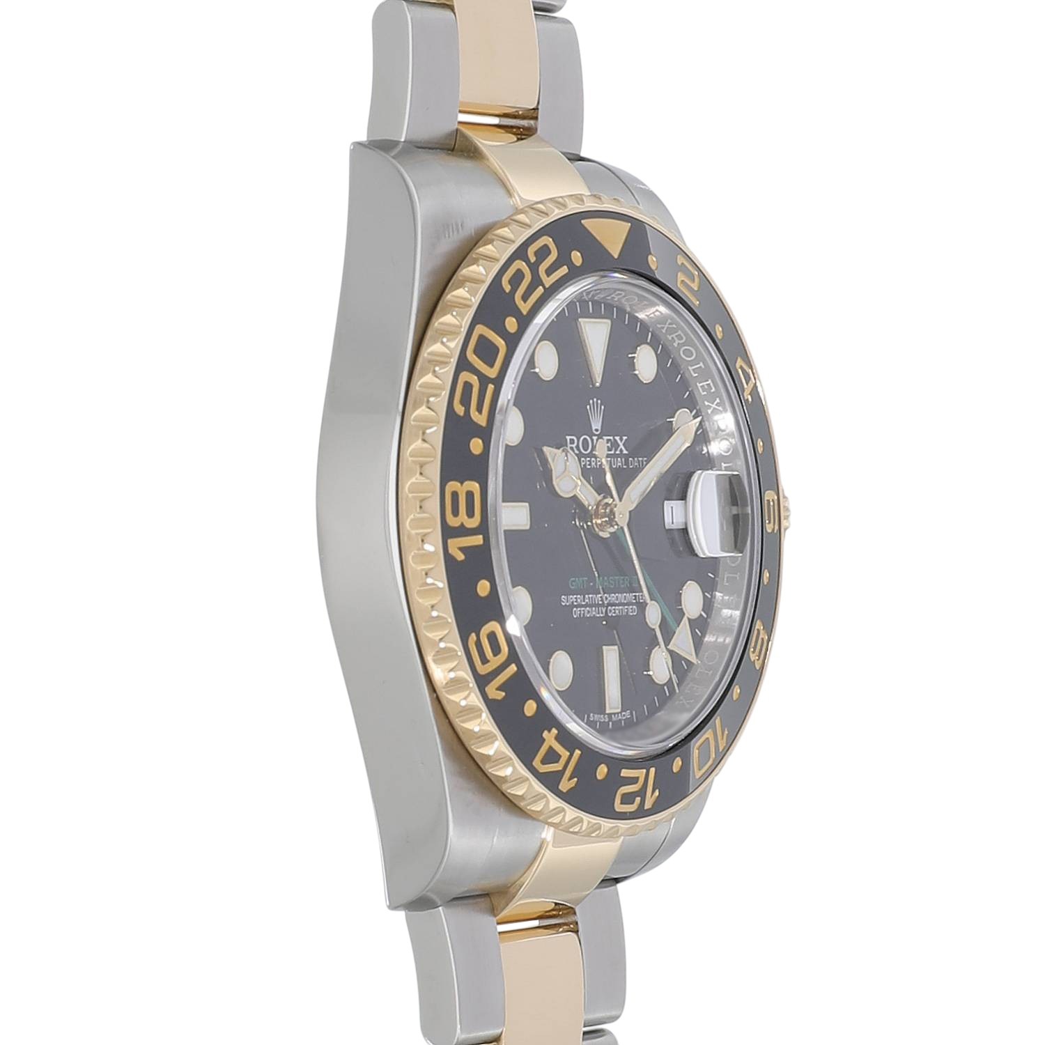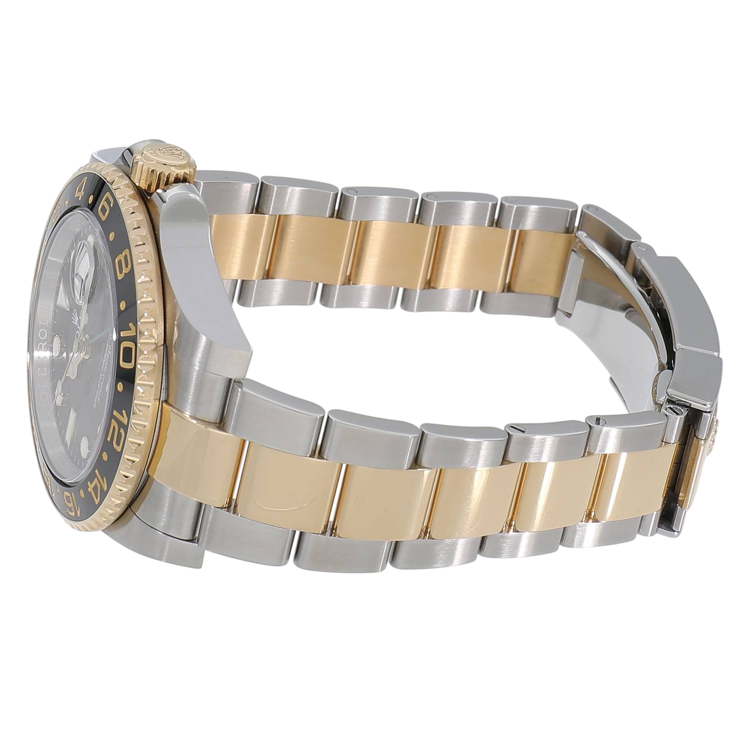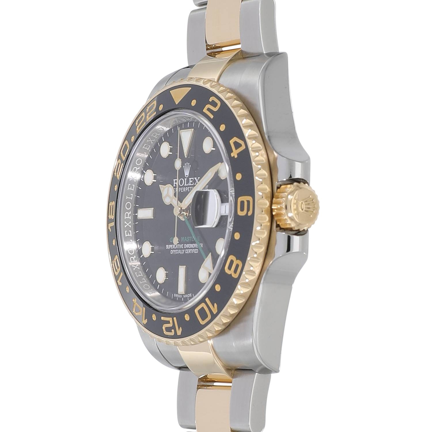 | モデルについて / Features | 24時間針と両方向に回転するベゼルを駆使する事で、3か国の時間帯を同時に読み取る事ができるGMTマスターII。2007年に発表されたモデルより、ベゼルディスクは傷が付き難いセラミック製へ、ラグ幅はより太く変更され、全体的に高級感と堅牢性そして実用性が格段に向上しました。ステンレスとイエローゴールドのロレゾール仕様でラグジュアリーさを感じさせます。GMT針はロレックス社のコーポレートカラーであるグリーンが採用されています。ポリッシュ仕上げとヘアライン仕上げを巧みに組み合わせており、スポーツモデルながらエレガントさも感じられます。 |