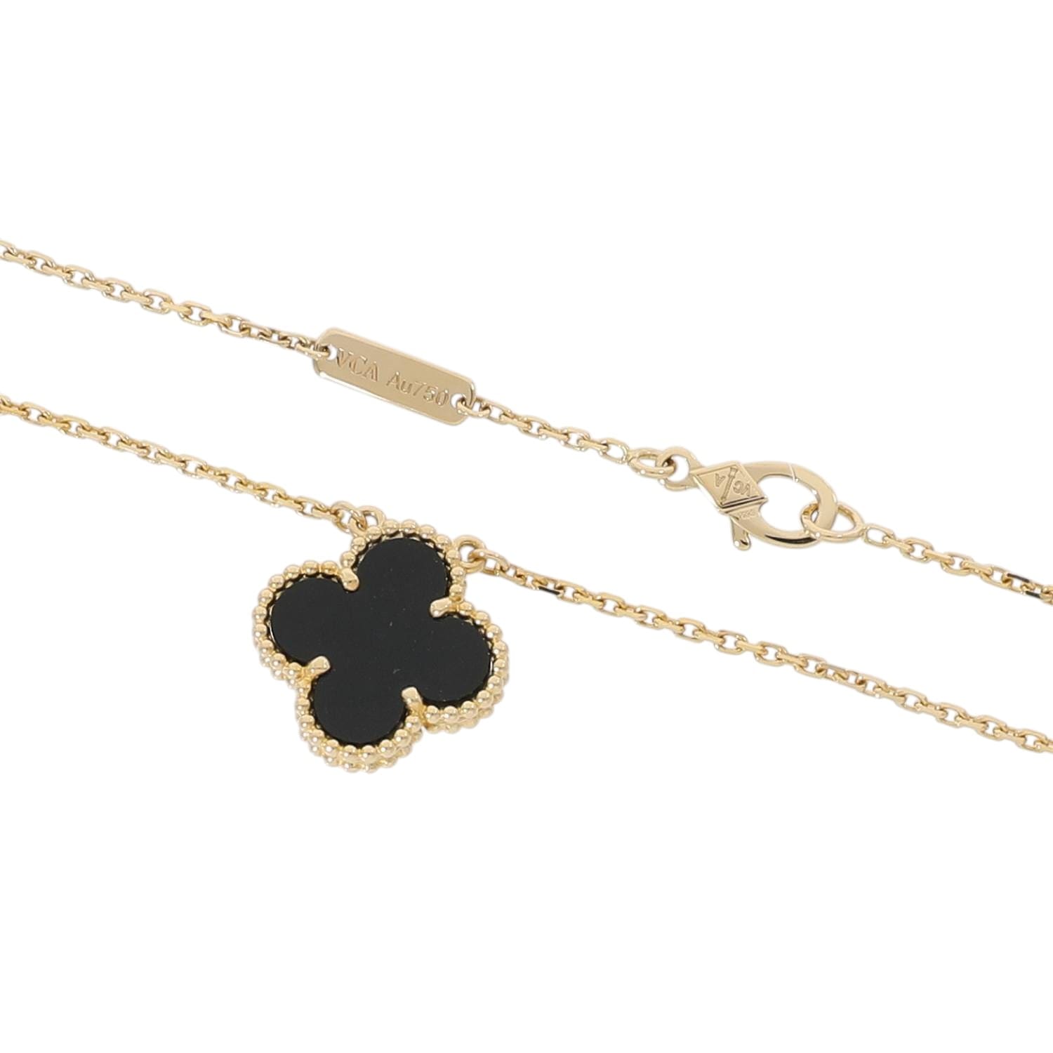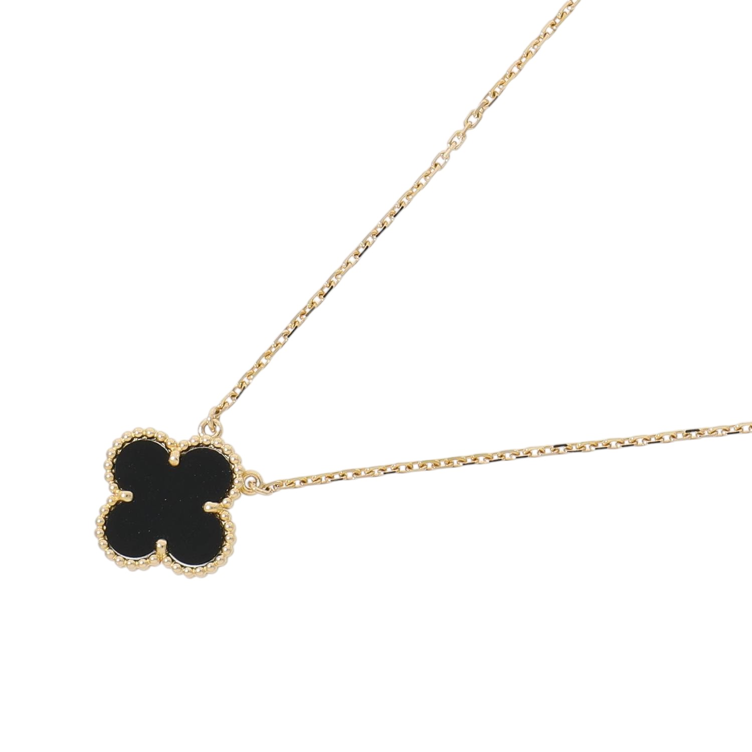 | モデルについて / Features | 世界中で幸運のシンボルとされる四つ葉のクローバーに着想を得たデザインで、ビーズ状のゴールドのモチーフの縁取りが美しい、1968年に誕生した「アルハンブラ」。ヴァンクリーフ&アーペルの象徴でもあり多くの女性を魅了するアイコニックなコレクションです。モチーフには成功、厄除けのパワーストーンとしても知られるオニキスを使っています。イエローゴールドとオニキスの黒が調和した、高貴で可憐なネックレスです。 |