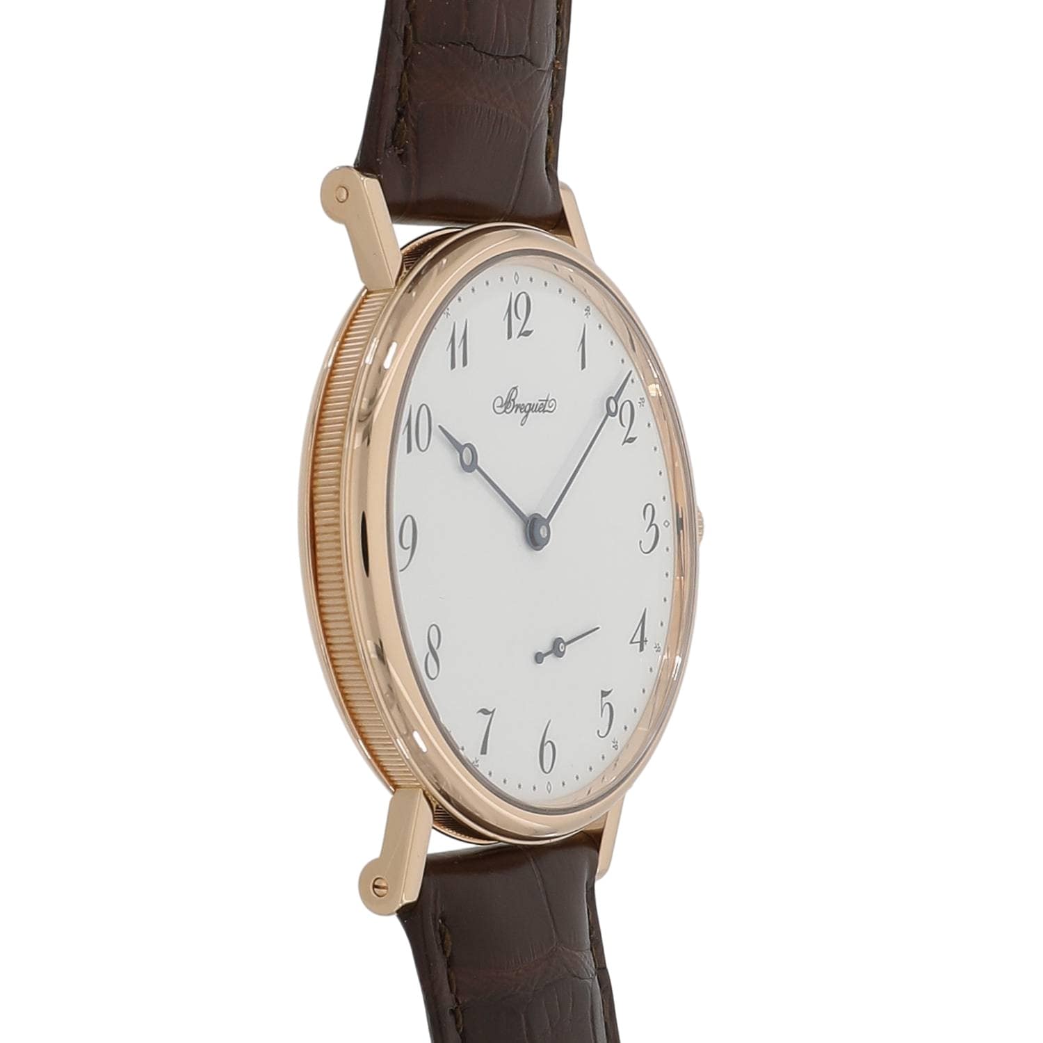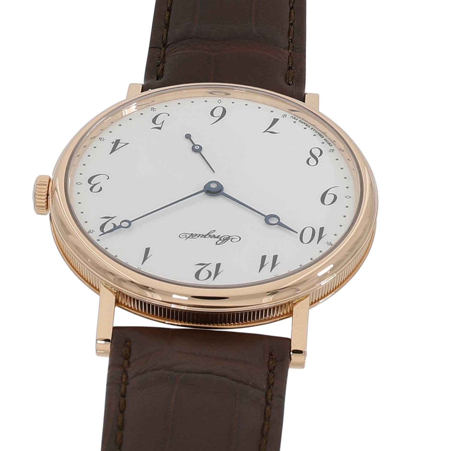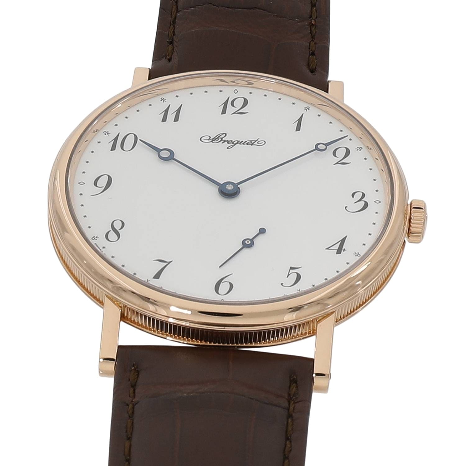 | モデルについて / Features | ブレゲを代表するドレスウォッチラインであるクラシック。見やすさや無駄のない洗練された美しさを追求し、ミニマルデザインが特徴といえます。青焼きされたブレゲ針に手書きのブレゲ数字、ケース外周に施されたコインエッジなど、シンプルでありながらもブレゲらしさを存分に感じられる逸品です。このモデルの最大の特徴と言えば、グラン・フー技法を用いた艶やかで透明感のあるエナメル文字盤です。5~6時位置にはスモールセコンドを配しており、その少し上の部分にはパッと見では視認できませんが、breguetの文字がシークレットサインとして刻印されています。 |