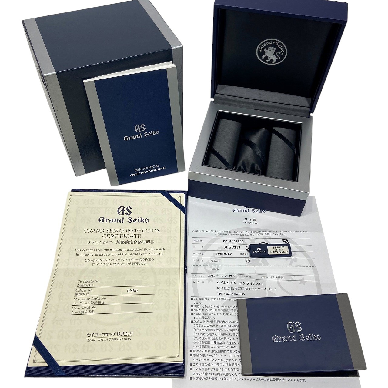 | 付属品 / Accessories | 純正ボックス / 国際保証書(国内:2021年6月 ) / 修理明細書(あり:2025年12月 オーバーホール) / GS規格検定証、説明書、タグ |