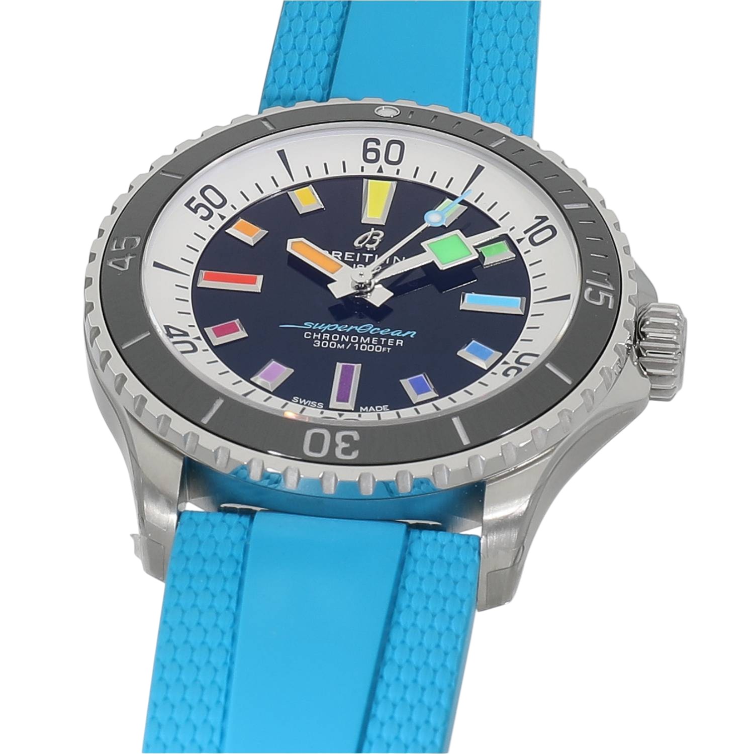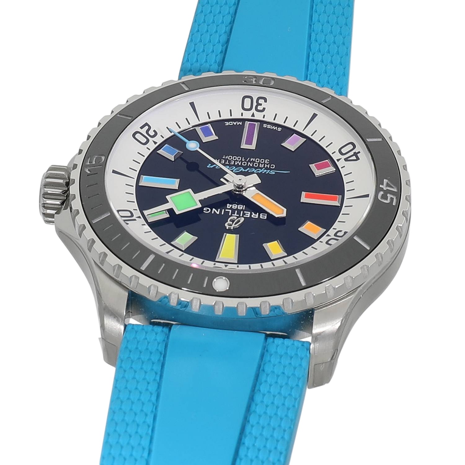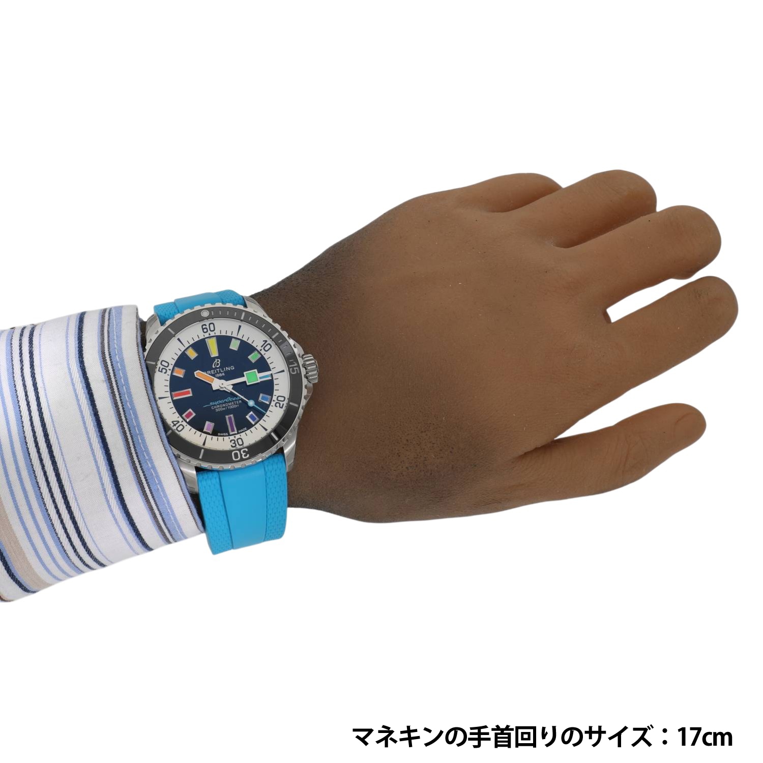 | モデルについて / Features | 2024年の新作 1960年代の「スーパーオーシャン・スローモーション」にインスパイアされた、四角い針や分厚いインデックスを持つデザインが特徴的。ブラックダイヤルにカラフルなインデックスを配したデザインが目を惹きます。幅広の針とインデックスには、蓄光塗料スーパールミノバが塗布され、非常に視認性が高いダイバーズウォッチです。ラバーストラップはフォールディングクラスプ式で、最大15mmの微調整が可能。ラッシュガードやウェットスーツの上からでも簡単に装着することができます。 |