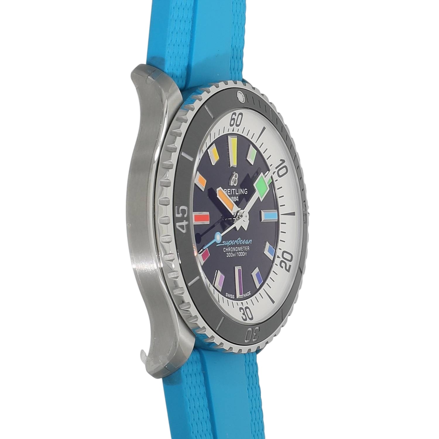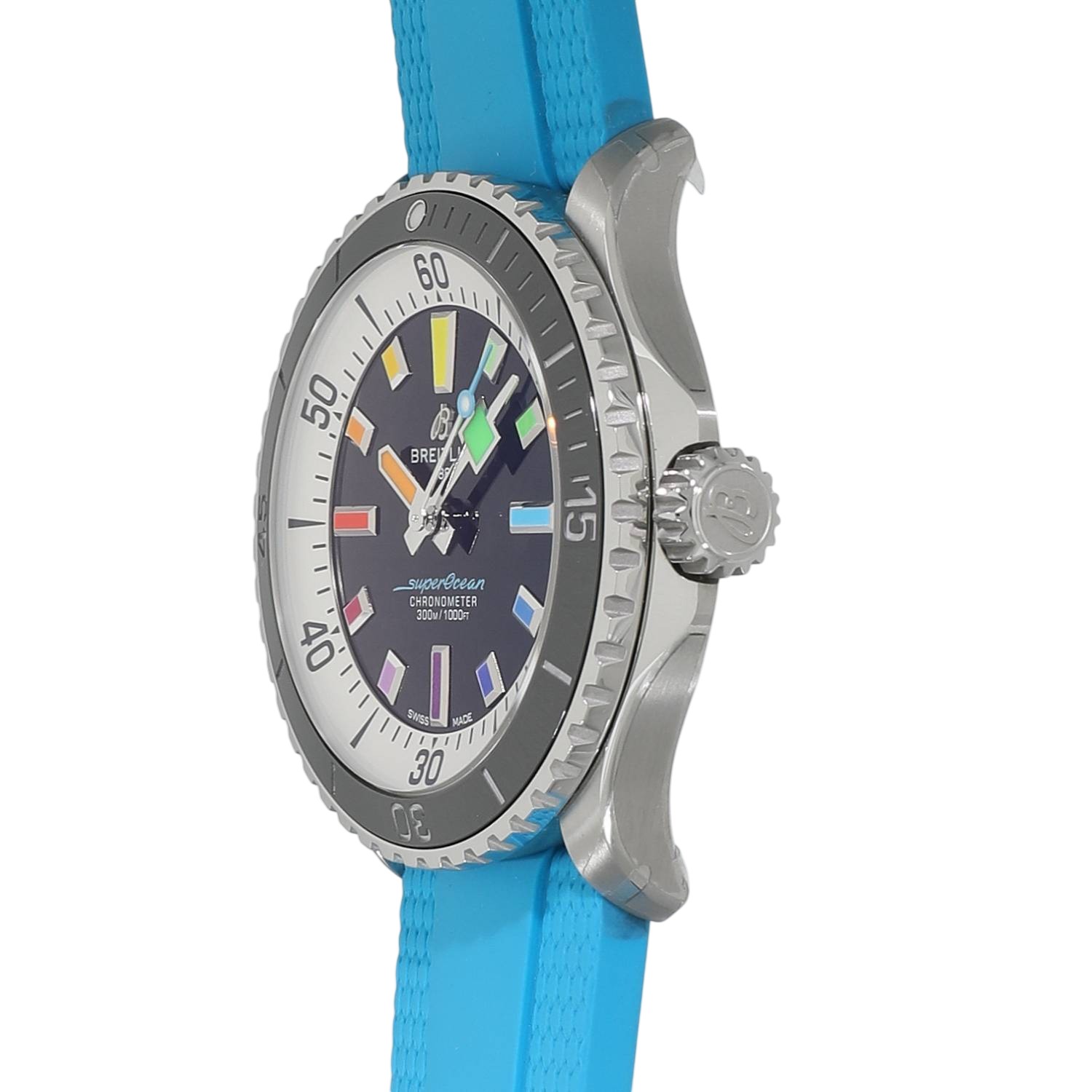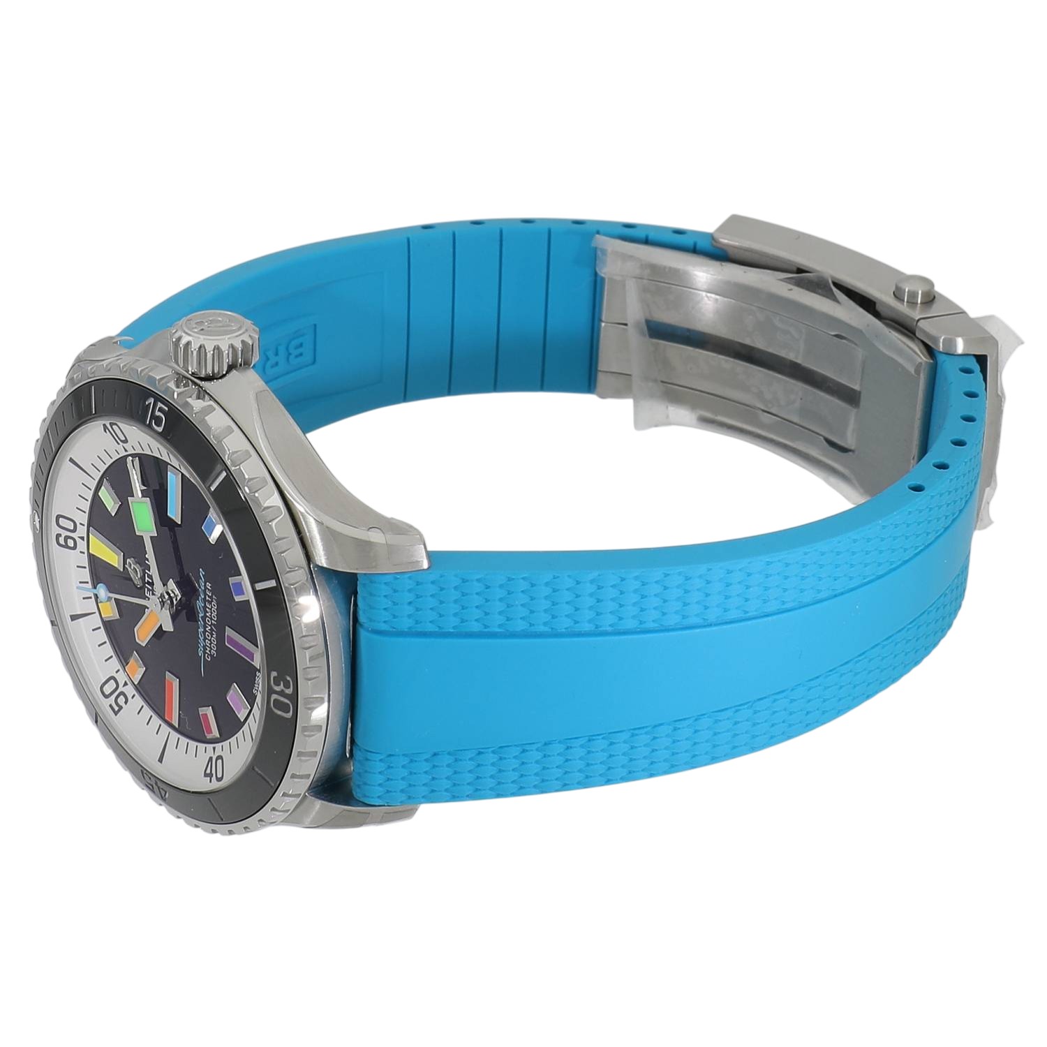| モデルについて / Features | 2024年の新作 1960年代の「スーパーオーシャン・スローモーション」にインスパイアされた、四角い針や分厚いインデックスを持つデザインが特徴的。ブラックダイヤルにカラフルなインデックスを配したデザインが目を惹きます。幅広の針とインデックスには、蓄光塗料スーパールミノバが塗布され、非常に視認性が高いダイバーズウォッチです。ラバーストラップはフォールディングクラスプ式で、最大15mmの微調整が可能。ラッシュガードやウェットスーツの上からでも簡単に装着することができます。 |