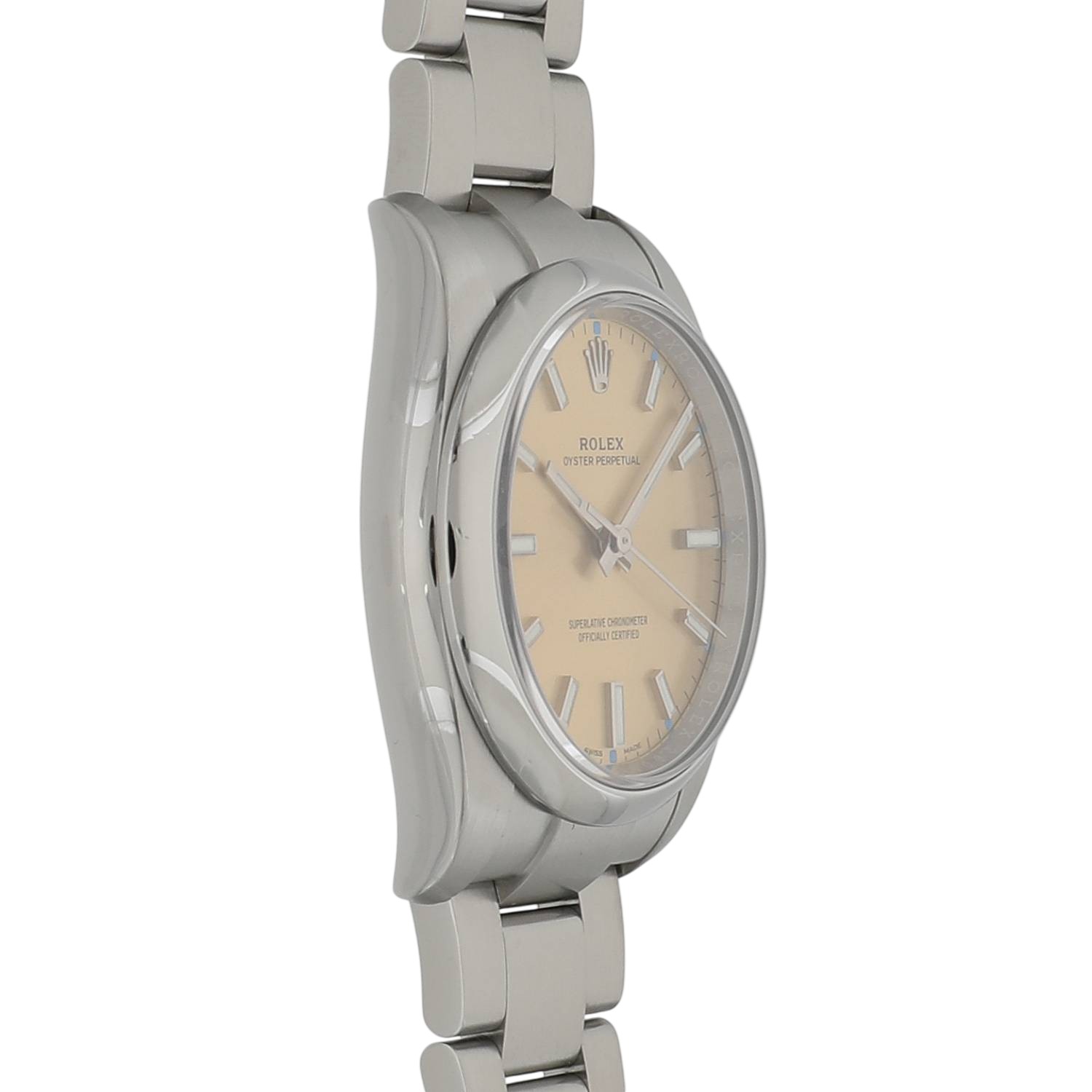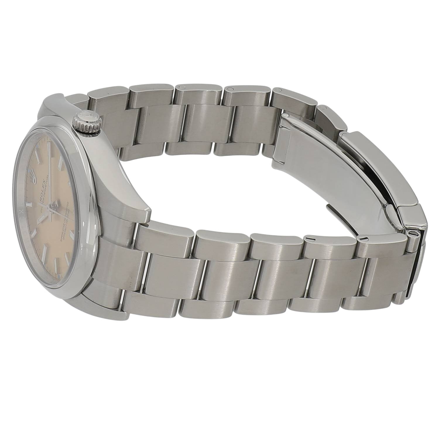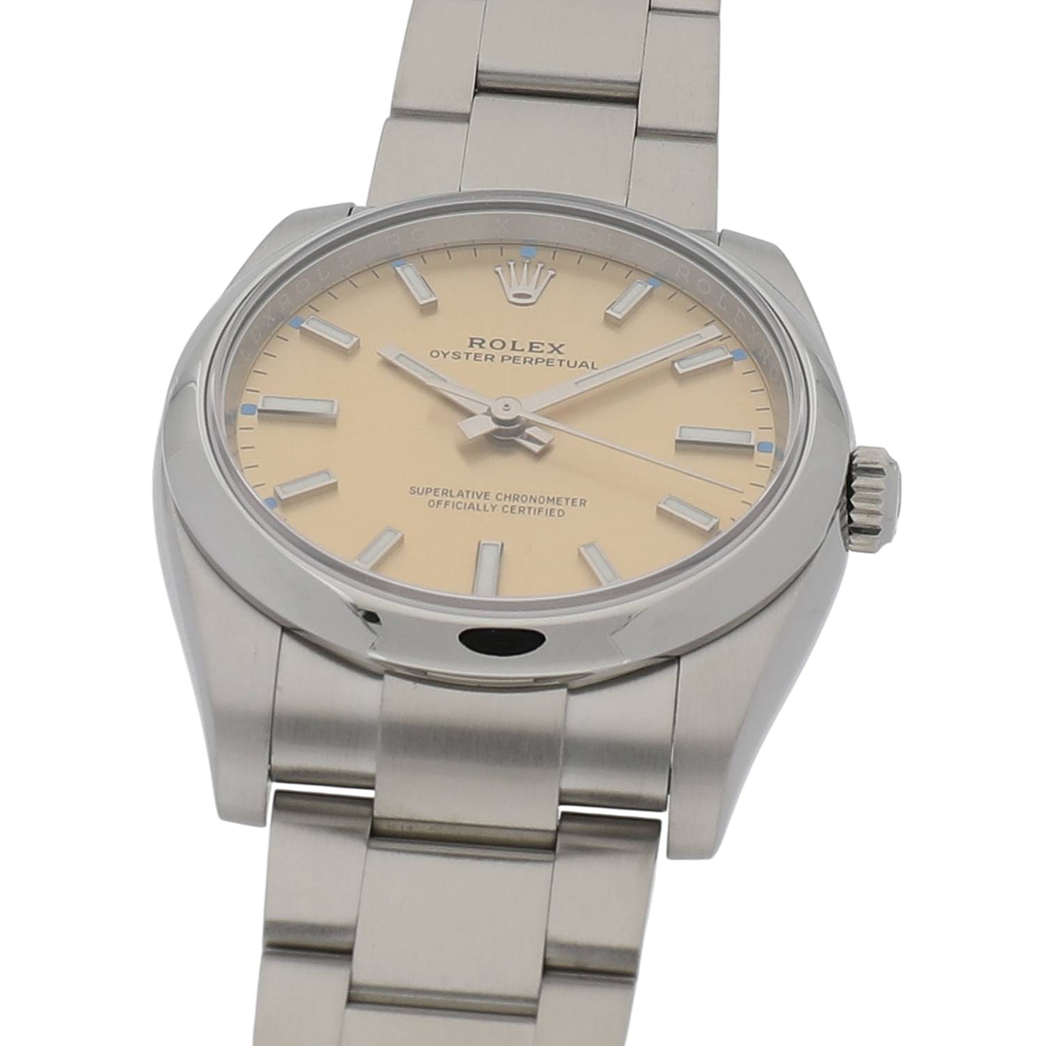 | モデルについて / Features | オイスター=防水ケースとパーペチュアル=自動巻きというロレックスの2大発明を備えるオイスターパーペチュアル。デイト表示は無く時分針のみという非常にシンプルなデザインで人気があります。数あるコレクションの中でもエントリーウォッチ的な存在であり、リーズナブルに展開されるのも魅力です。丸みを帯びたドーム型のポリッシュベゼル、ブレスレットのコマやバックルの仕様などが大幅に変更が施され、以前のエアキングに比べ堅牢性や高級感が増した仕上がりとなっております。34mmと小ぶりなサイズなので手首が細めの男性はもちろん、女性にもお勧めできるサイズ感です。Ref.114200は2007年~2014年までエアキングとして展開されましたが、2014年以降は同Refでエアキングのロゴは廃されオイスターパーペチュアルとして展開されるようになりました。 |