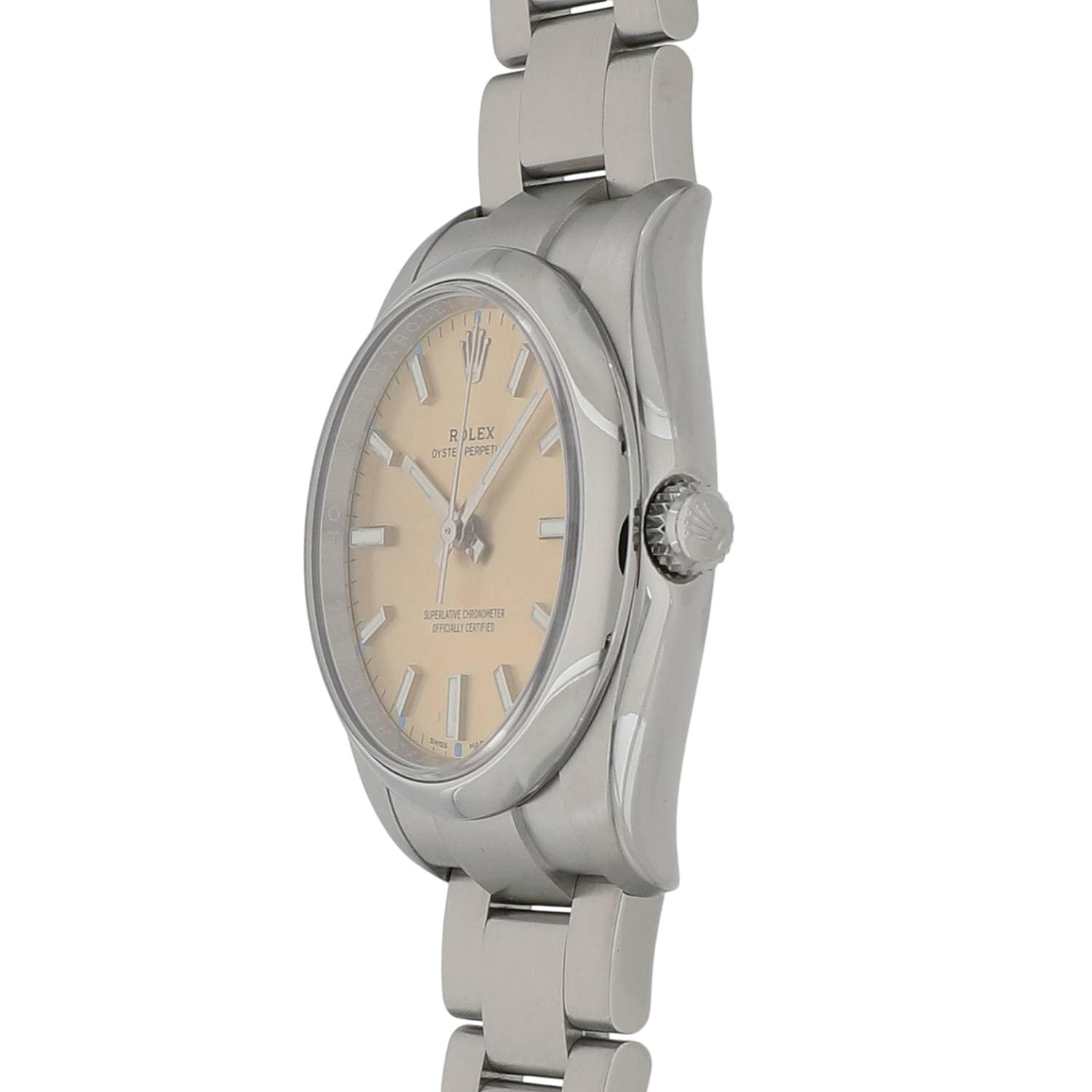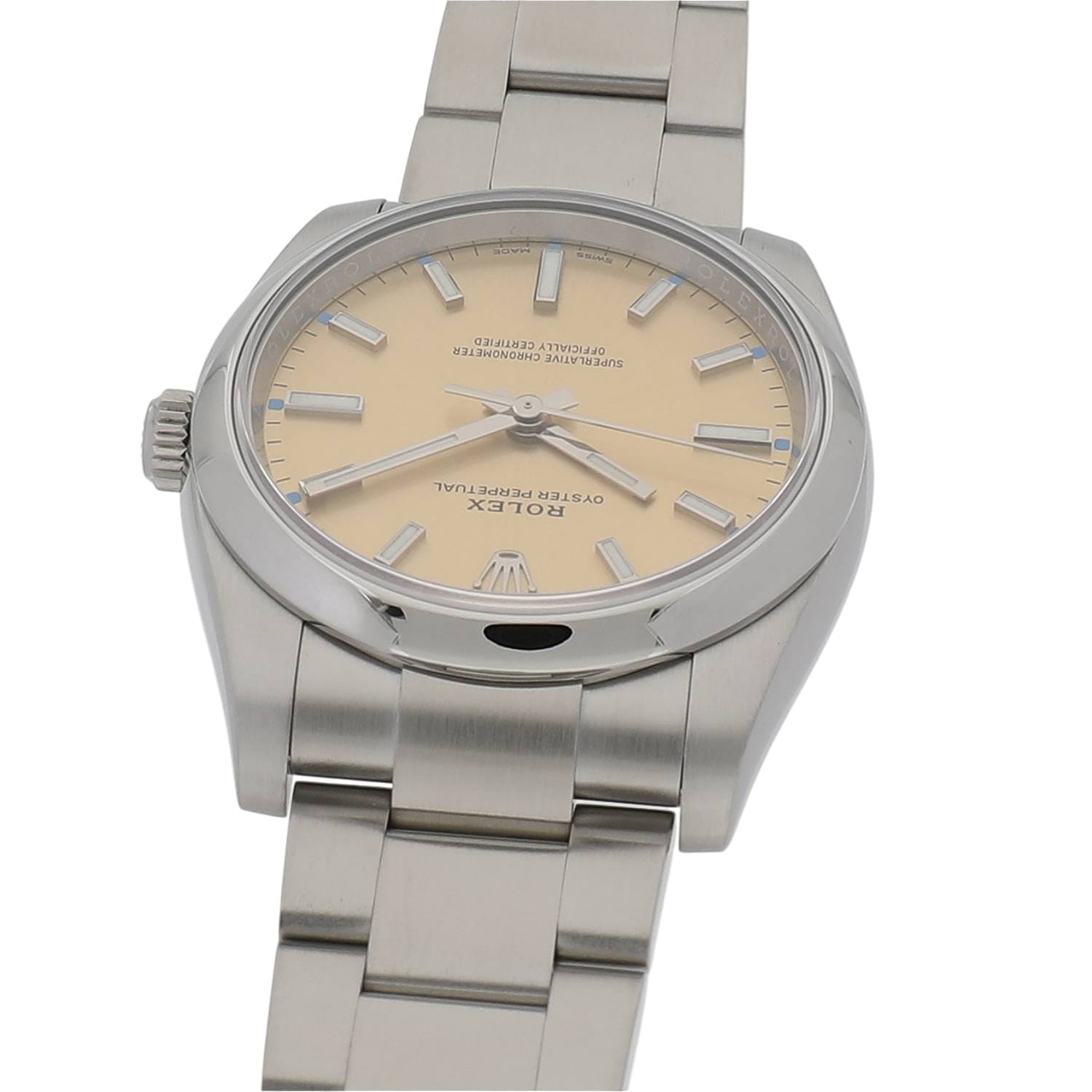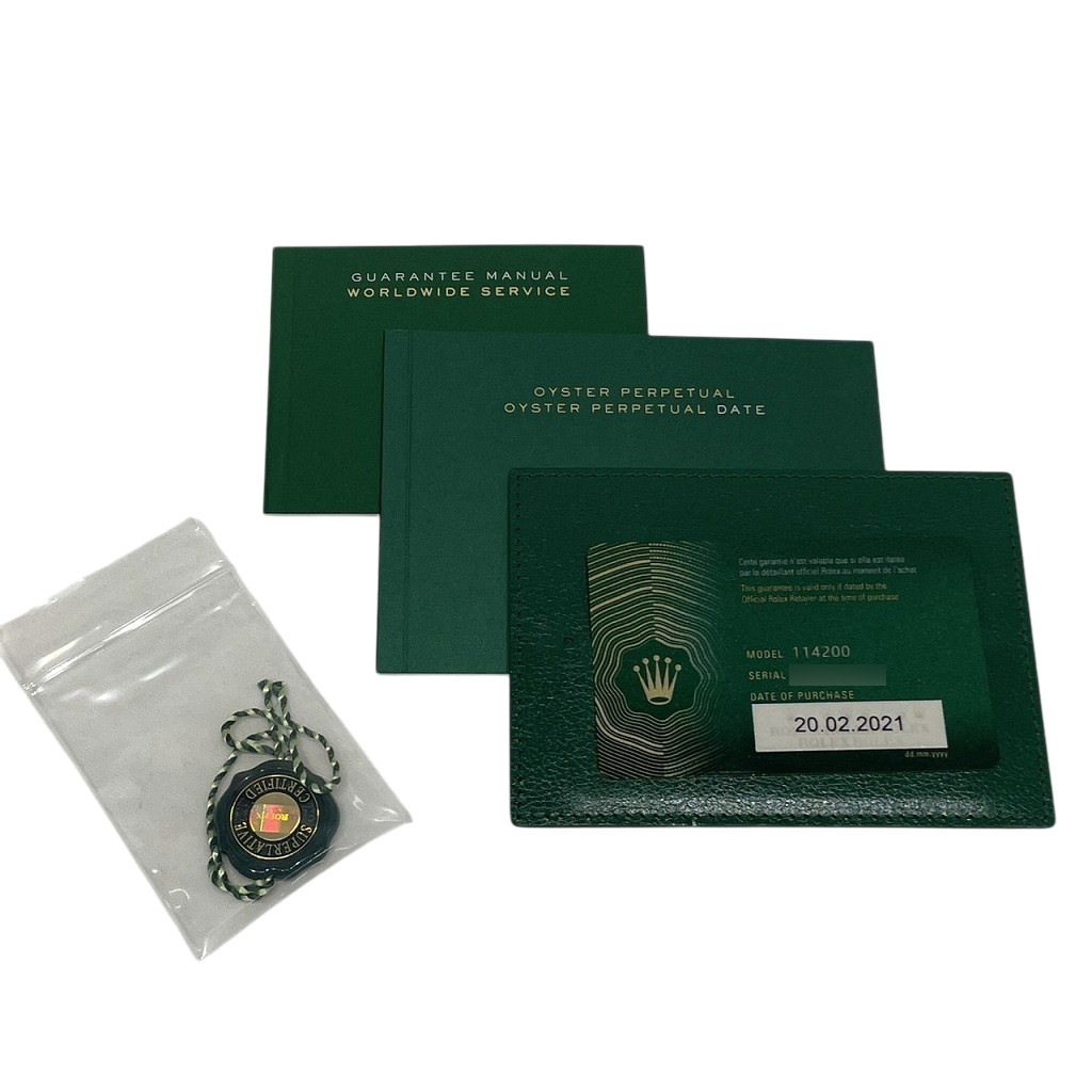 | モデルについて / Features | オイスター=防水ケースとパーペチュアル=自動巻きというロレックスの2大発明を備えるオイスターパーペチュアル。デイト表示は無く時分針のみという非常にシンプルなデザインで人気があります。数あるコレクションの中でもエントリーウォッチ的な存在であり、リーズナブルに展開されるのも魅力です。丸みを帯びたドーム型のポリッシュベゼル、ブレスレットのコマやバックルの仕様などが大幅に変更が施され、以前のエアキングに比べ堅牢性や高級感が増した仕上がりとなっております。34mmと小ぶりなサイズなので手首が細めの男性はもちろん、女性にもお勧めできるサイズ感です。Ref.114200は2007年~2014年までエアキングとして展開されましたが、2014年以降は同Refでエアキングのロゴは廃されオイスターパーペチュアルとして展開されるようになりました。 |
